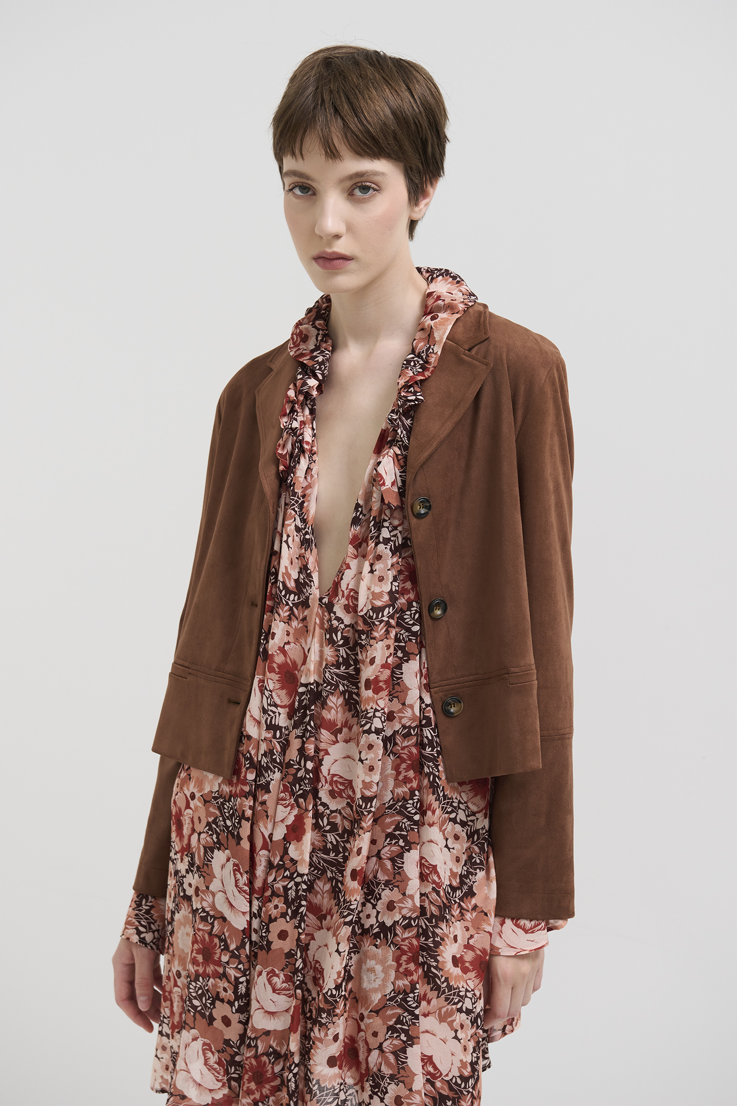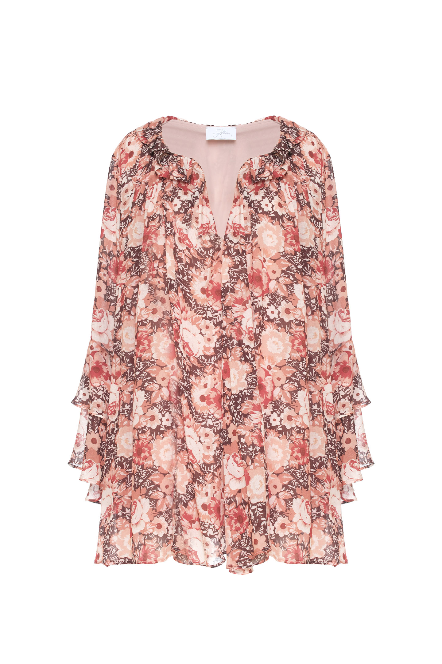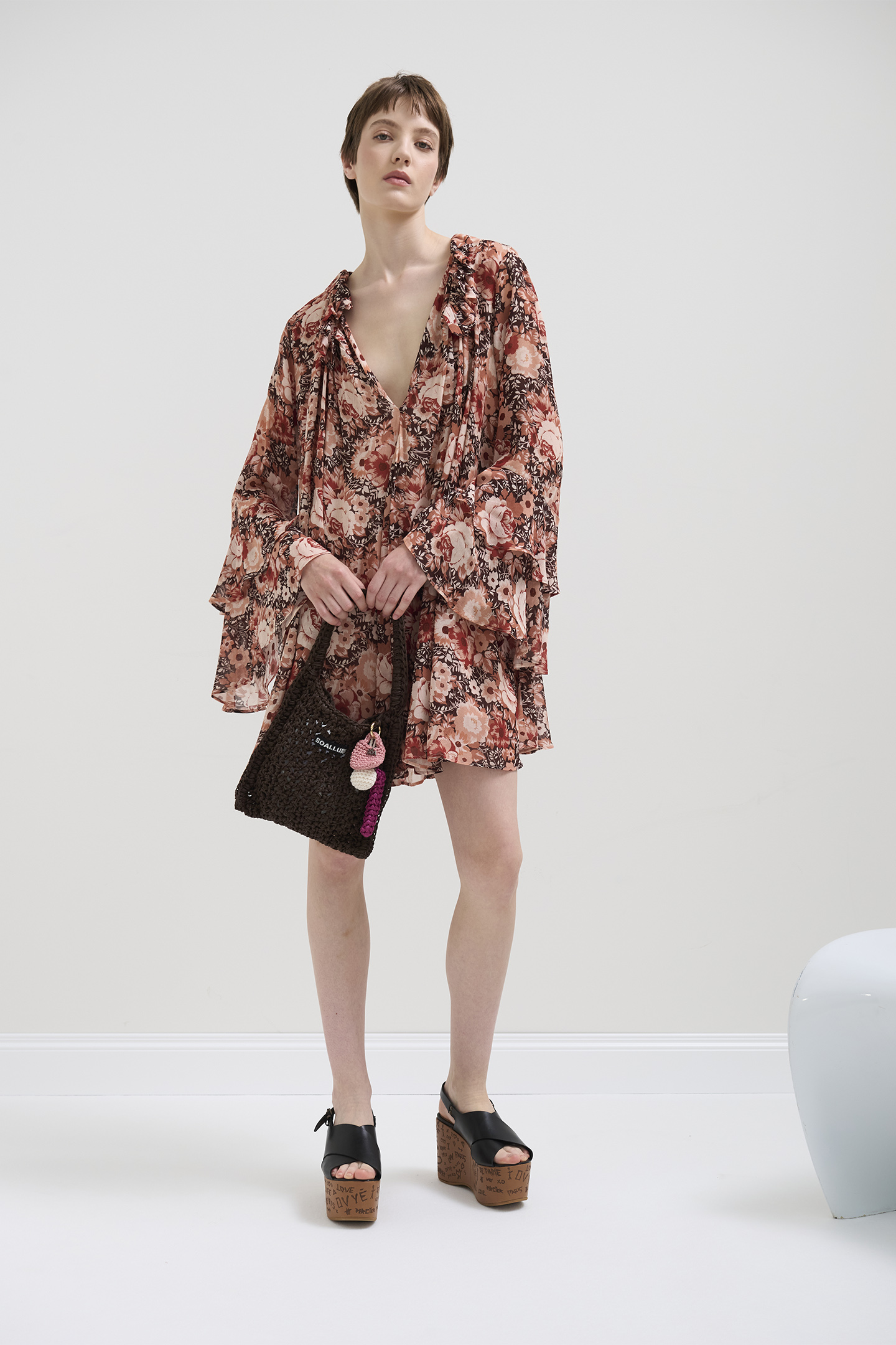 ABITO DAL TAGLIO FLUIDO, REALIZZATO IN VISCOSA LEGGERA CON STAMPA FLOREALE. IL DESIGN È CARATTERIZZATO DA UNO SCOLLO PROFONDO A V, MANICHE LUNGHE SVASATE A BALZE E UNA VESTIBILITÀ MORBIDA. SILHOUETTE AMPIA E COMODA, PERFETTA PER LOOK BOHO-CHIC SENZA RINUNCIARE ALLA PRATICITÀ. LA MODELLA È ALTA 178 CM E INDOSSA UNA TAGLIA 42 IT.