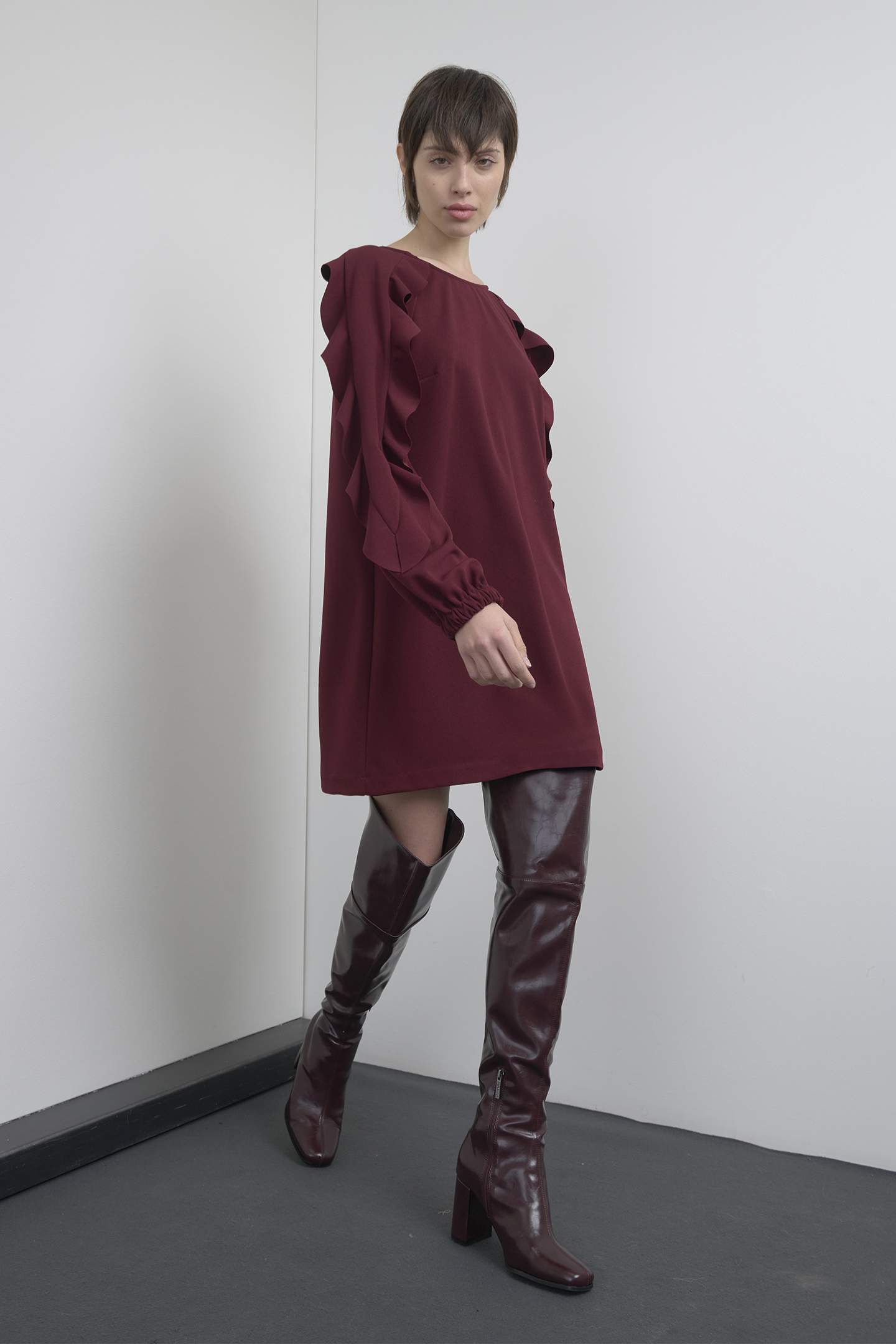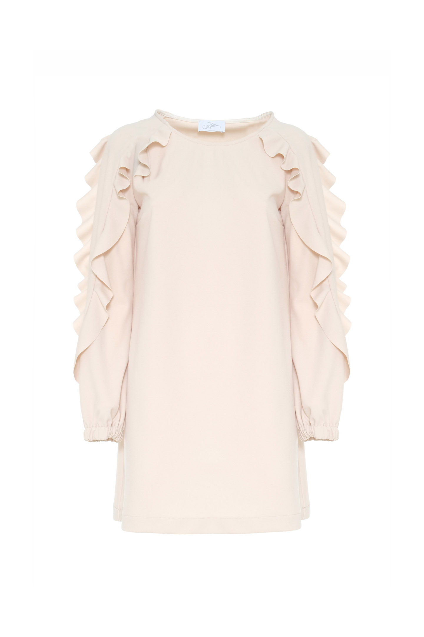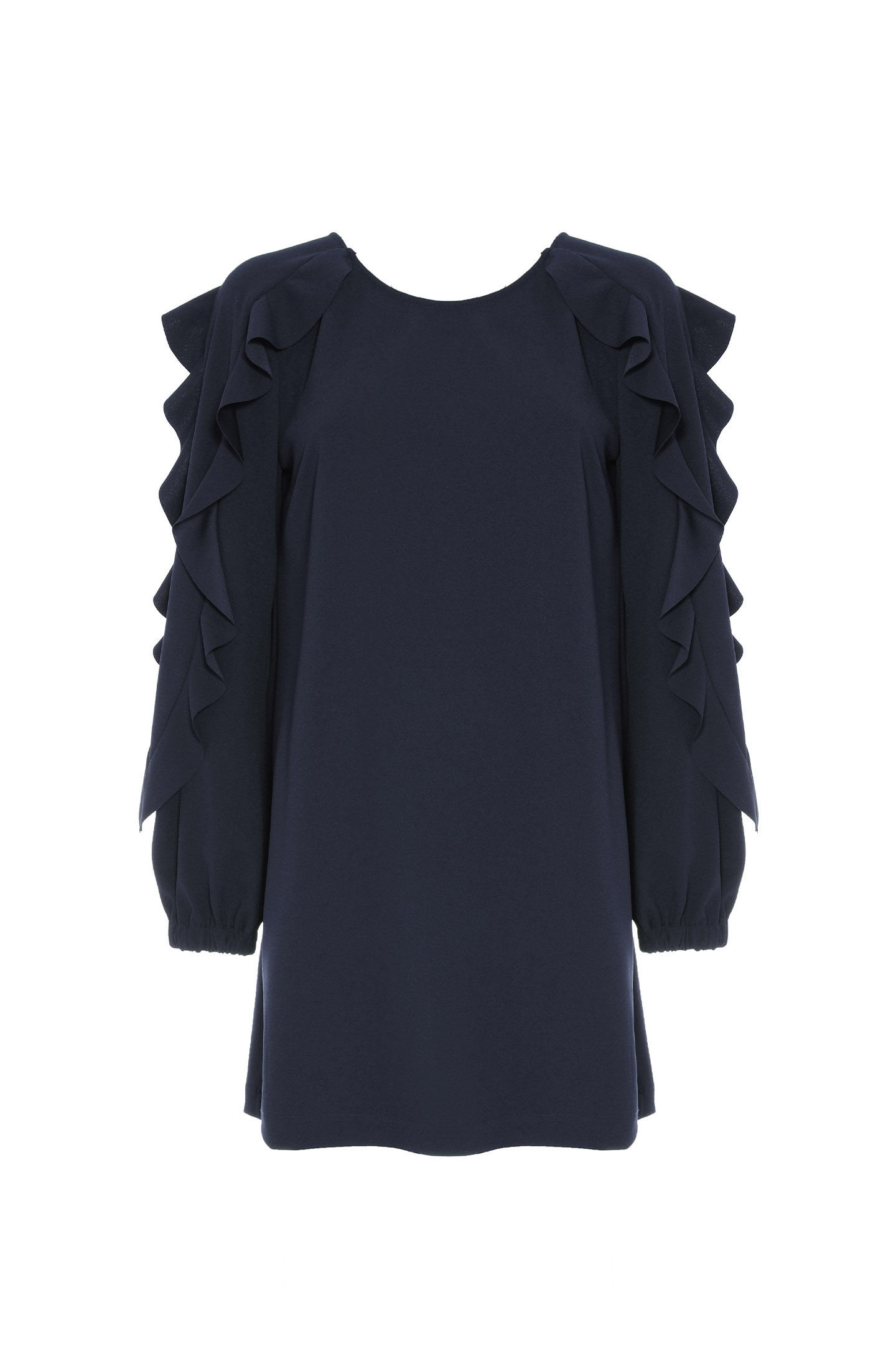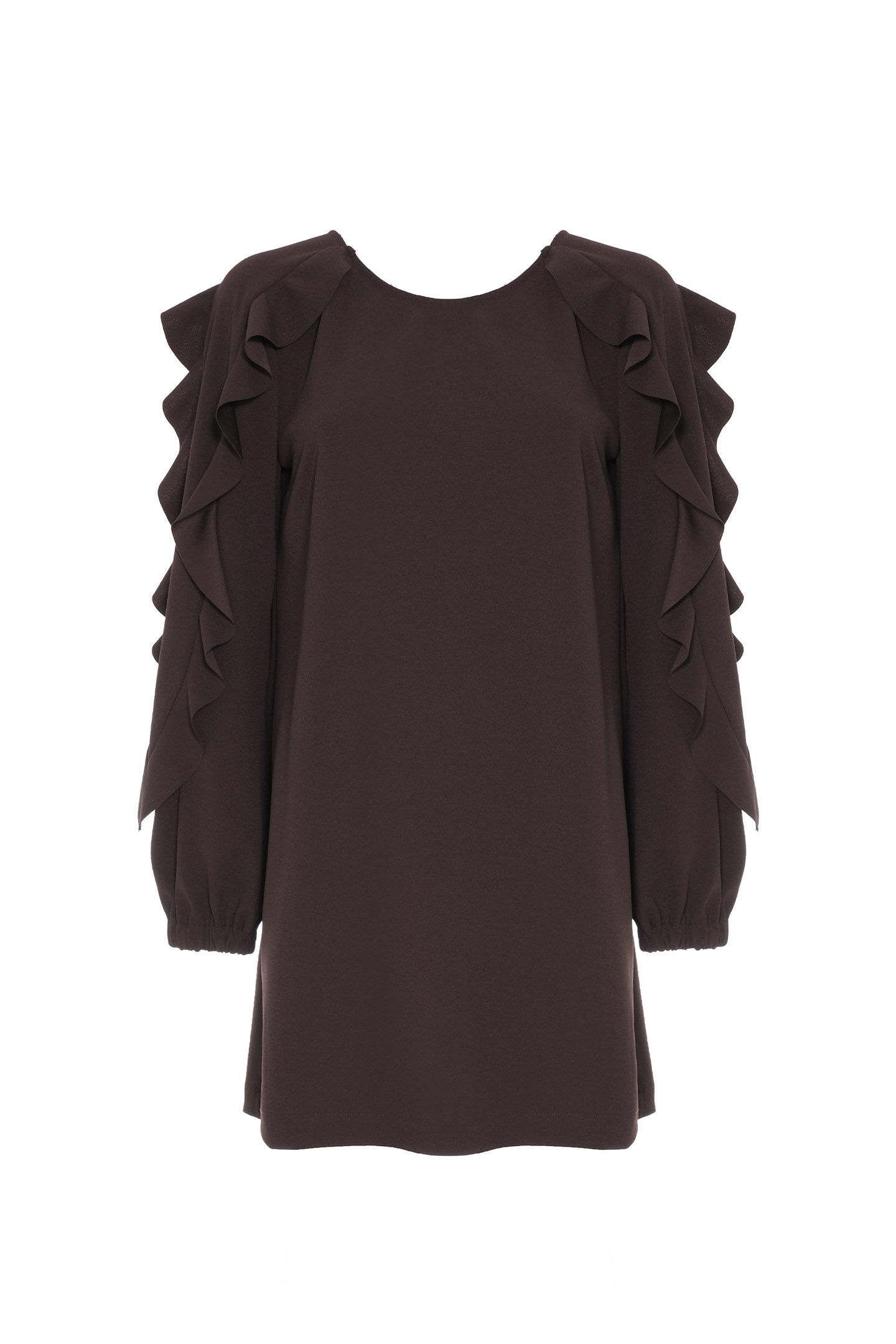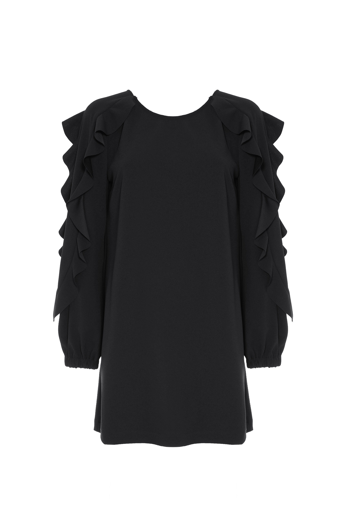 ABITO CORTO IN TESSUTO FLUIDO, ARRICCHITO DA VOLANT.