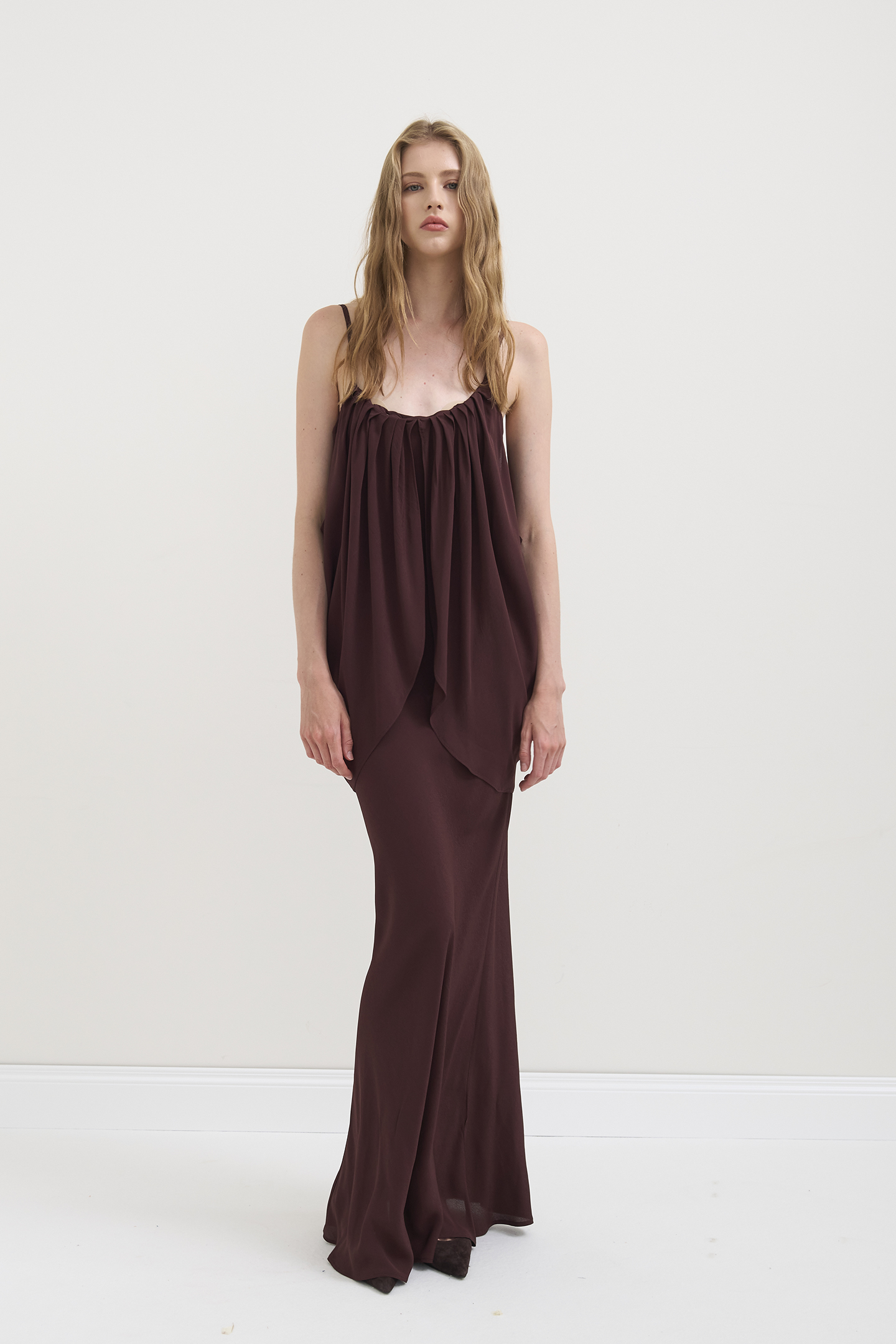 IL DESIGN È CARATTERIZZATO DA UN CORPETTO CON SCOLLO ARRICCIATO CHE CREA UN ELEGANTE GIOCO DI VOLUMI E DRAPPEGGI SUL DAVANTI.