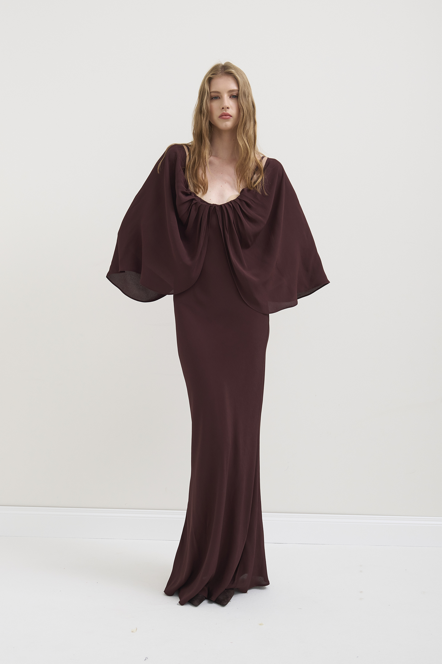 IL DETTAGLIO DISTINTIVO È COSTITUITO DALLE MANICHE A MANTELLA FLUIDE E VOLUMINOSE CHE POSSONO ESSERE INDOSSATE PER COPRIRE LE SPALLE O LASCIATE CADERE PER UN EFFETTO MANICA A VOLANT.