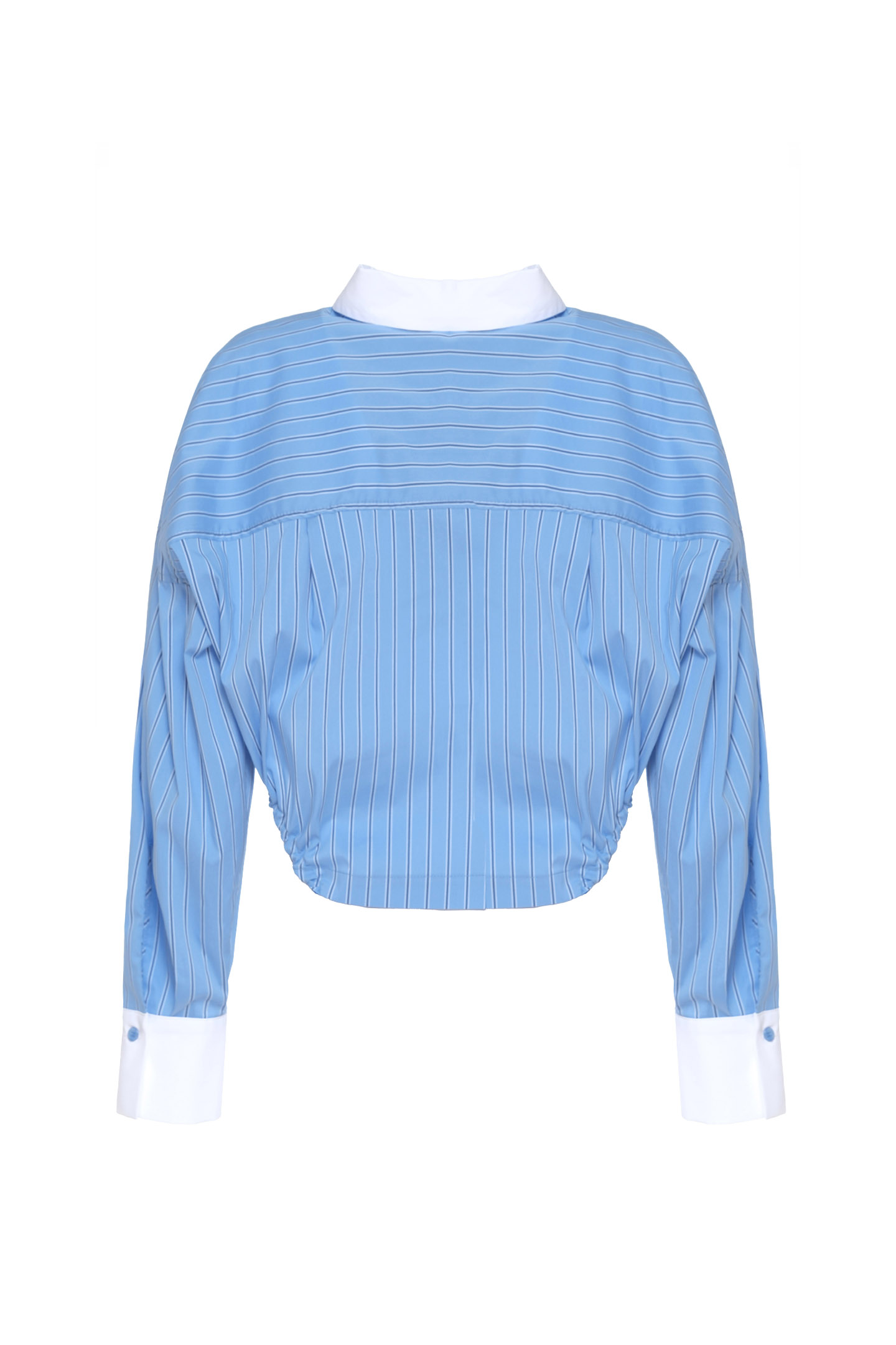 IL MODELLO SI DISTINGUE PER IL RAFFINATO CONTRASTO DEL COLLO CLASSICO E DEI POLSI ABBOTTONATI.