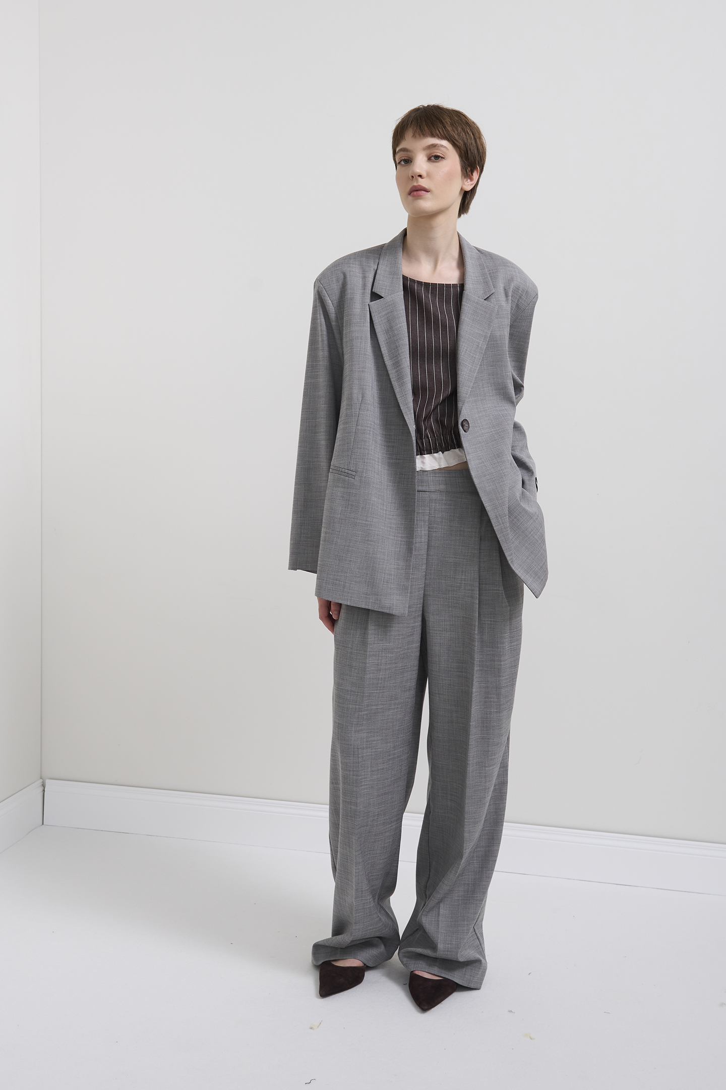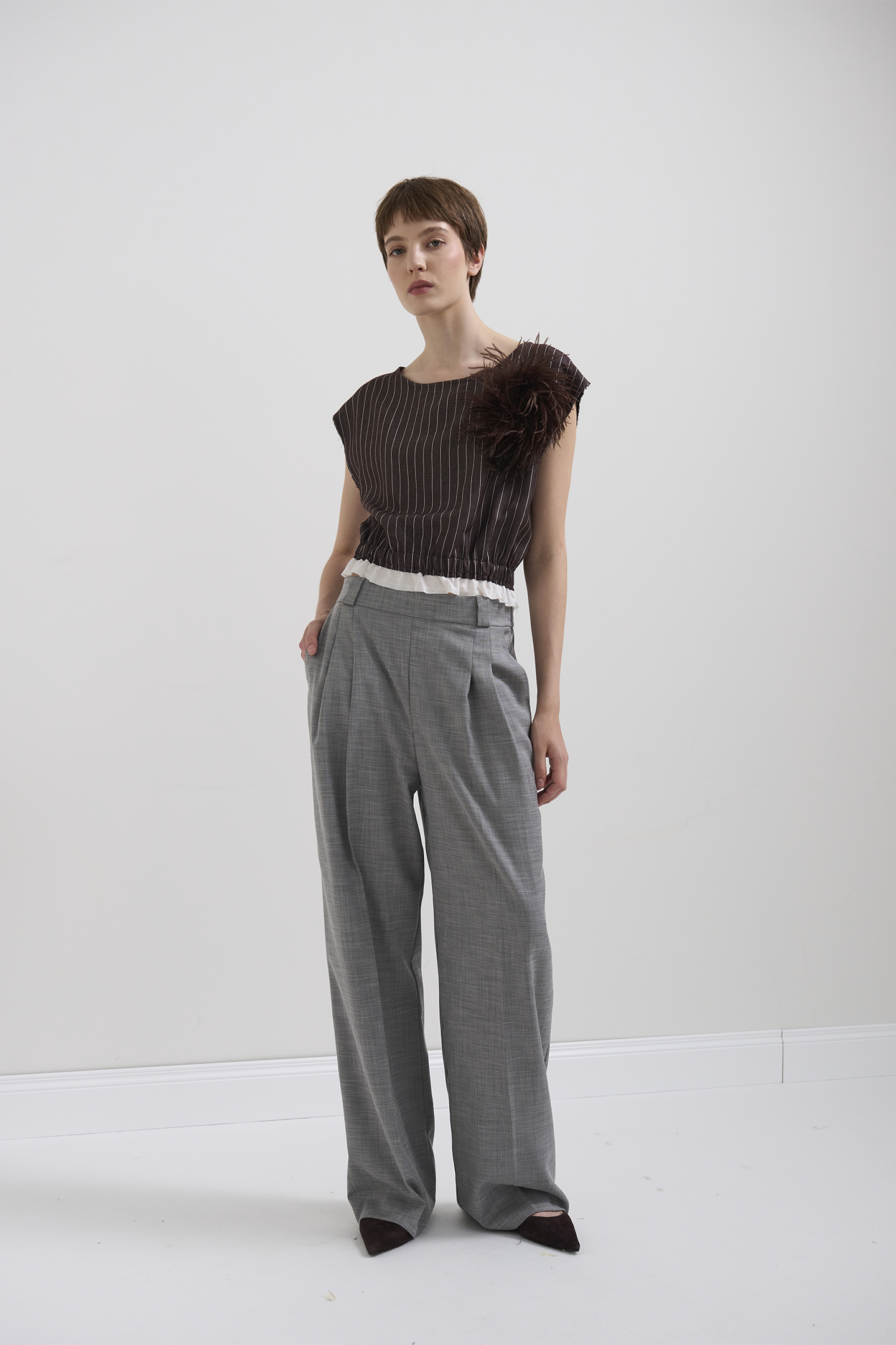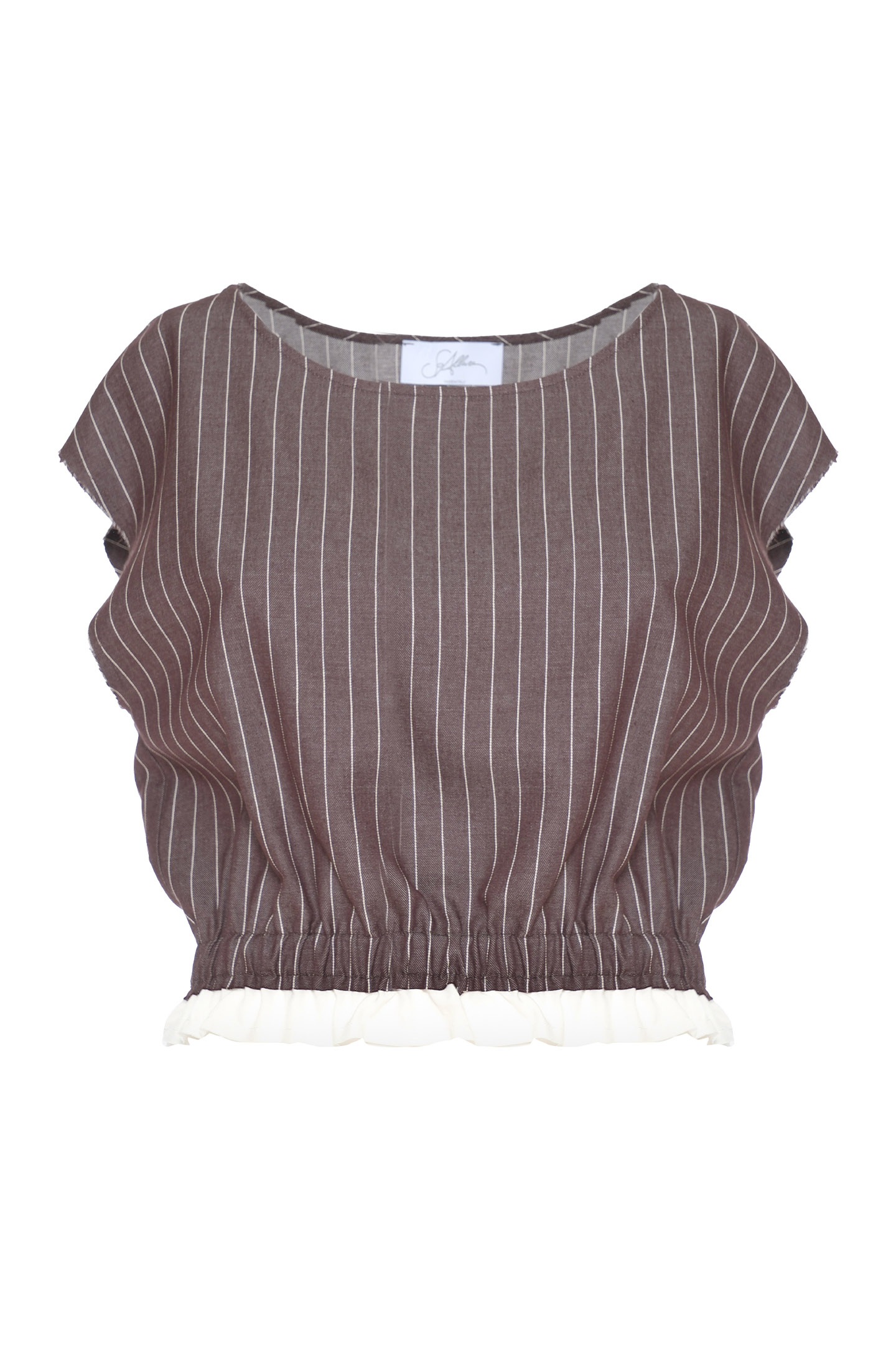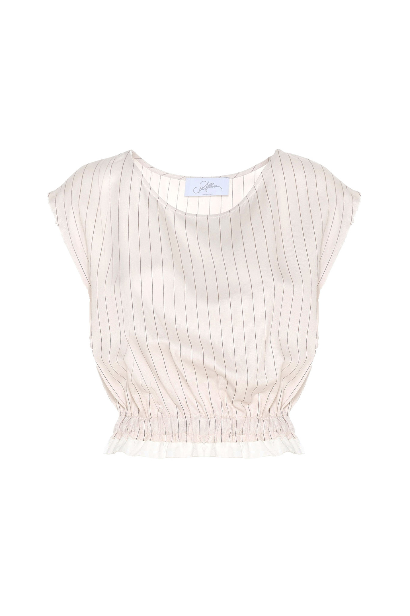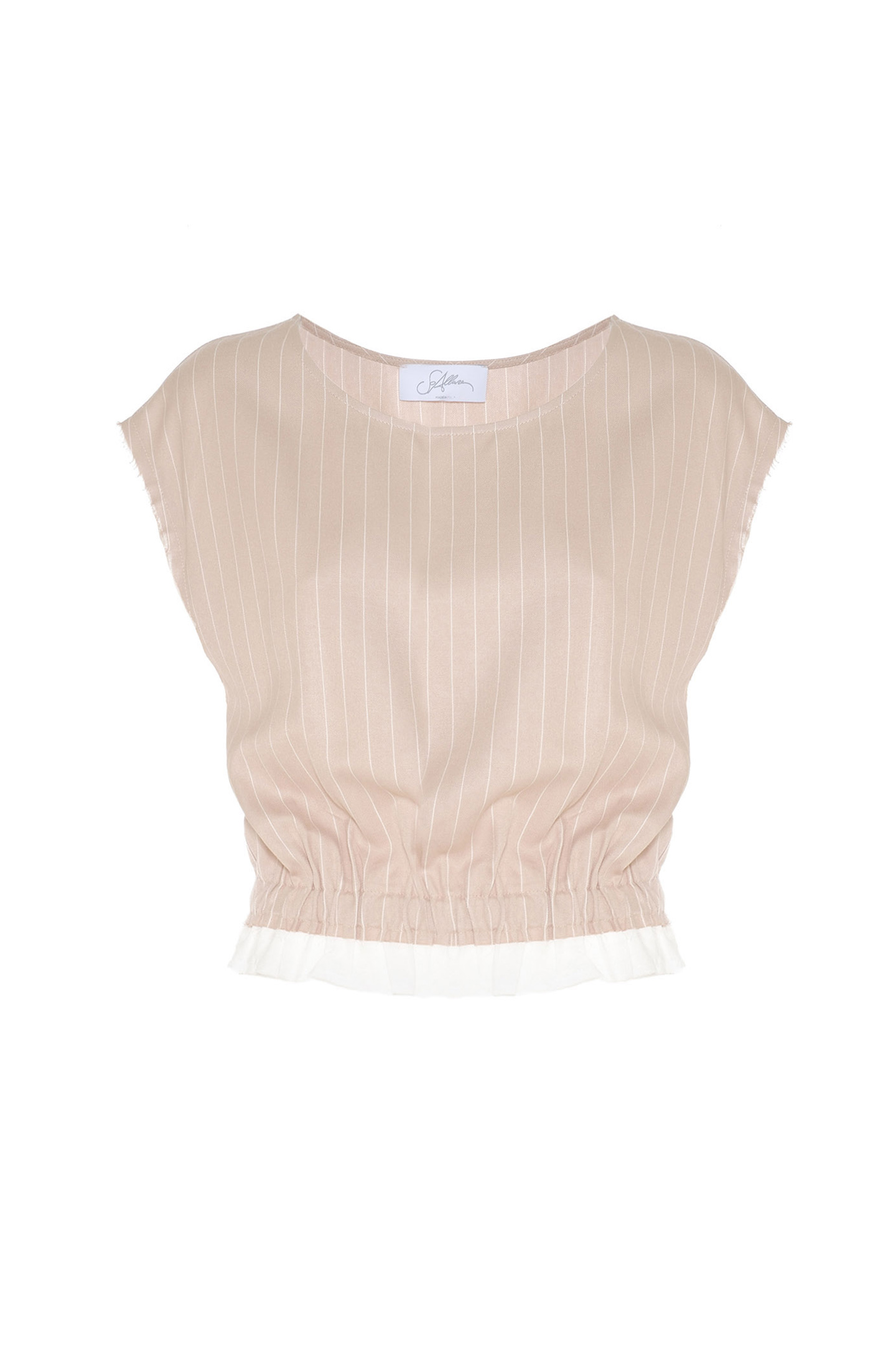 TOP REALIZZATO IN TESSUTO LEGGERO DAL MOTIVO GESSATO. MODELLO CON SCOLLO TONDO E MANICHE CORTE APPENA ACCENNATE. IL DESIGN PRESENTA UNA ARRICCIATURA IN VITA CHE ENFATIZZA LA SILHOUETTE. IL FONDO È COMPLETATO DA UNA BALZA A CONTRASTO. IL BORDO MANICA È RIFINITO CON UN EFFETTO USED SFILACCIATO, PER UN DETTAGLIO DAL CARATTERE PIÙ URBAN E CONTEMPORANEO. LA MODELLA È ALTA 1.78 M E INDOSSA UNA TAGLIA 42 IT.
