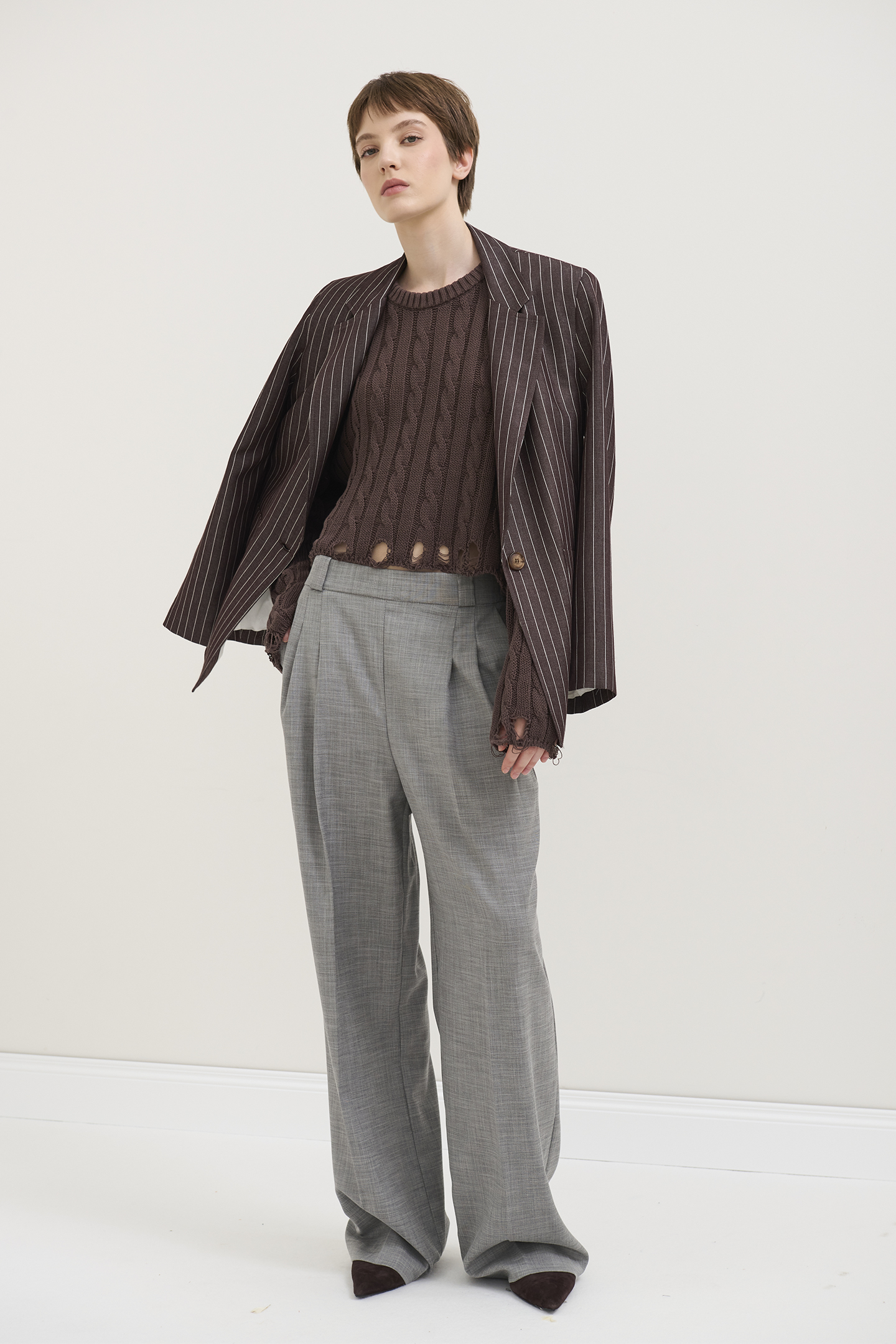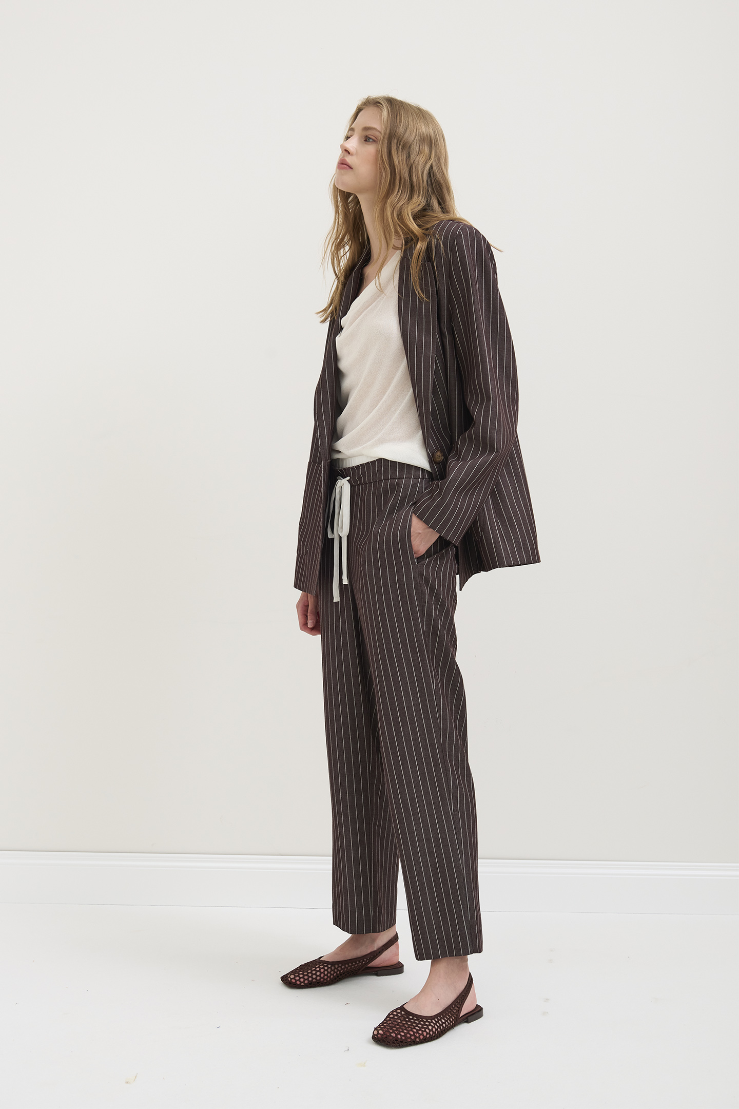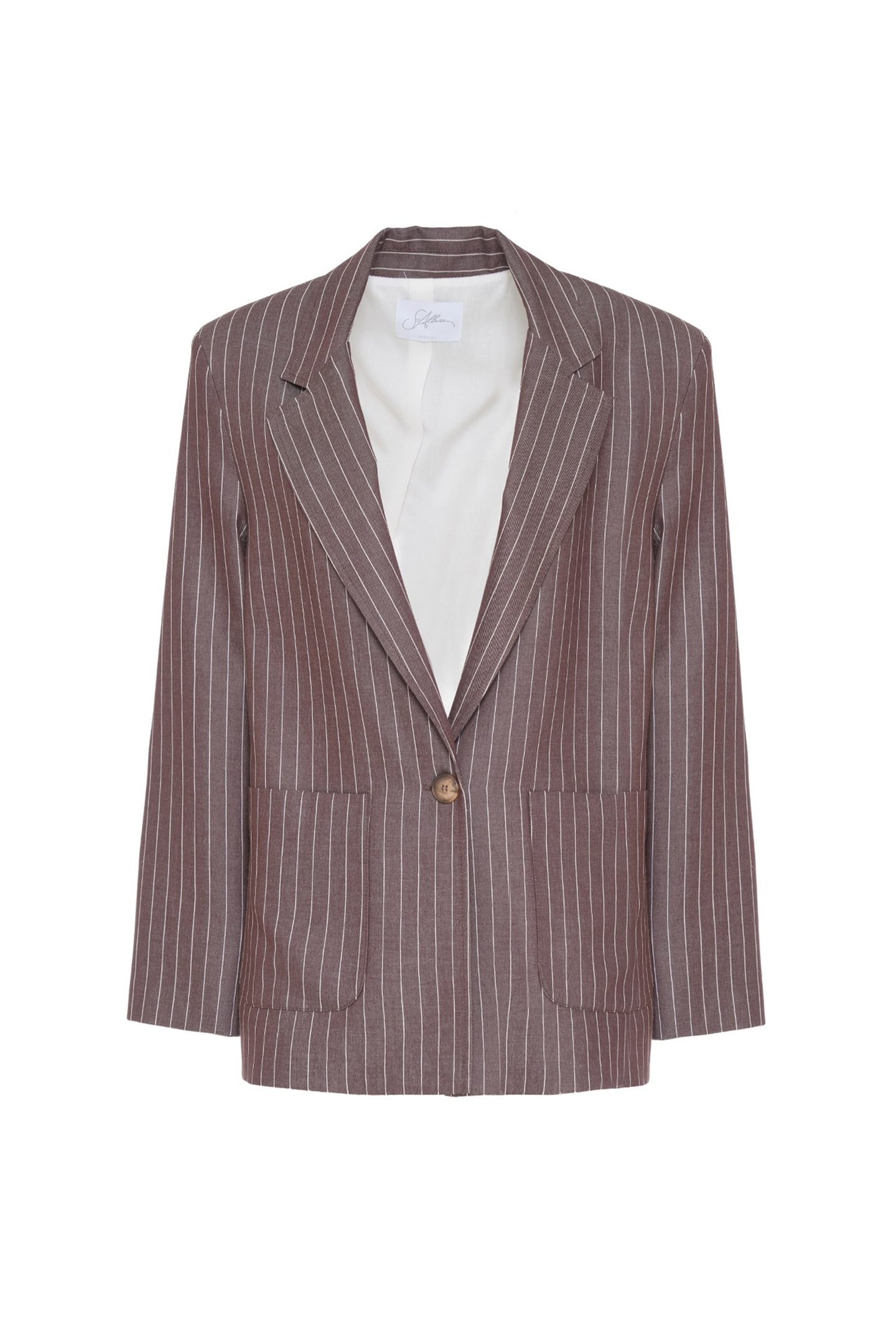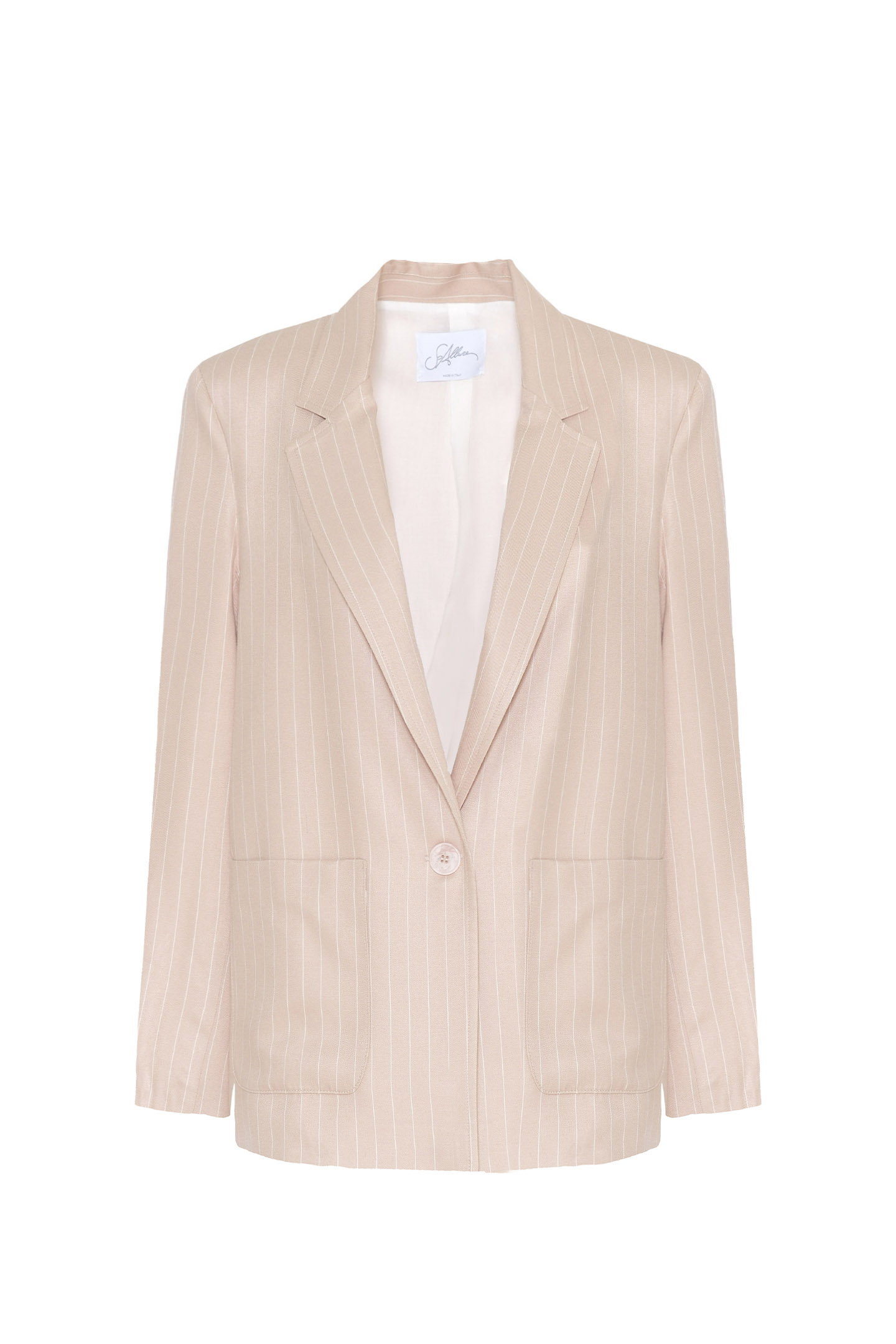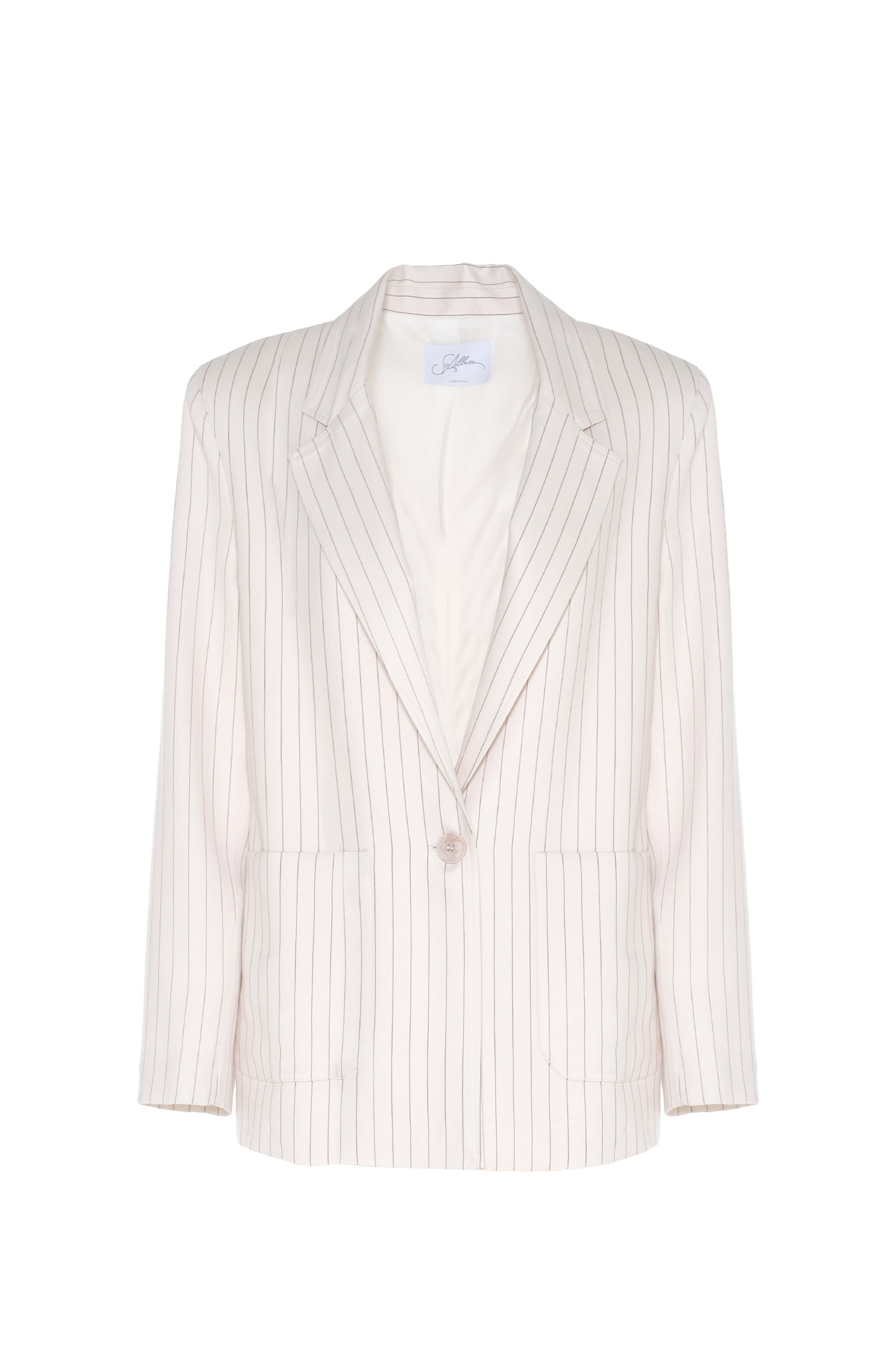 GIACCA SARTORIALE DAL TAGLIO OVERSIZE CON MOTIVO CLASSICO GESSATO. DESIGN CARATTERIZZATO DA UNA SILHOUETTE DRITTA E COMODA, ISPIRATA AL RIGORE DEL GUARDAROBA MASCHILE. PRESENTA UNA CHIUSURA CON UN SINGOLO BOTTONE CENTRALE, AMPI REVER A LANCIA E MAXI TASCHE APPLICATE SUL DAVANTI. INTERNO RIFINITO CON UNA FODERA CHIARA IN CONTRASTO CHE NE VALORIZZA LA FATTURA SARTORIALE. UN CAPO RAFFINATO E TRASVERSALE, IDEALE DA INDOSSARE IN COORDINATO AL SUO PANTALONE PER CREARE UN POWER SUIT MODERNO E DI IMPATTO, OPPURE DA ABBINARE A UN DENIM PER UN LOOK DAILY-CHIC DA CITTÀ. LA MODELLA È ALTA 1.78 M E INDOSSA UNA TAGLIA 42 IT.