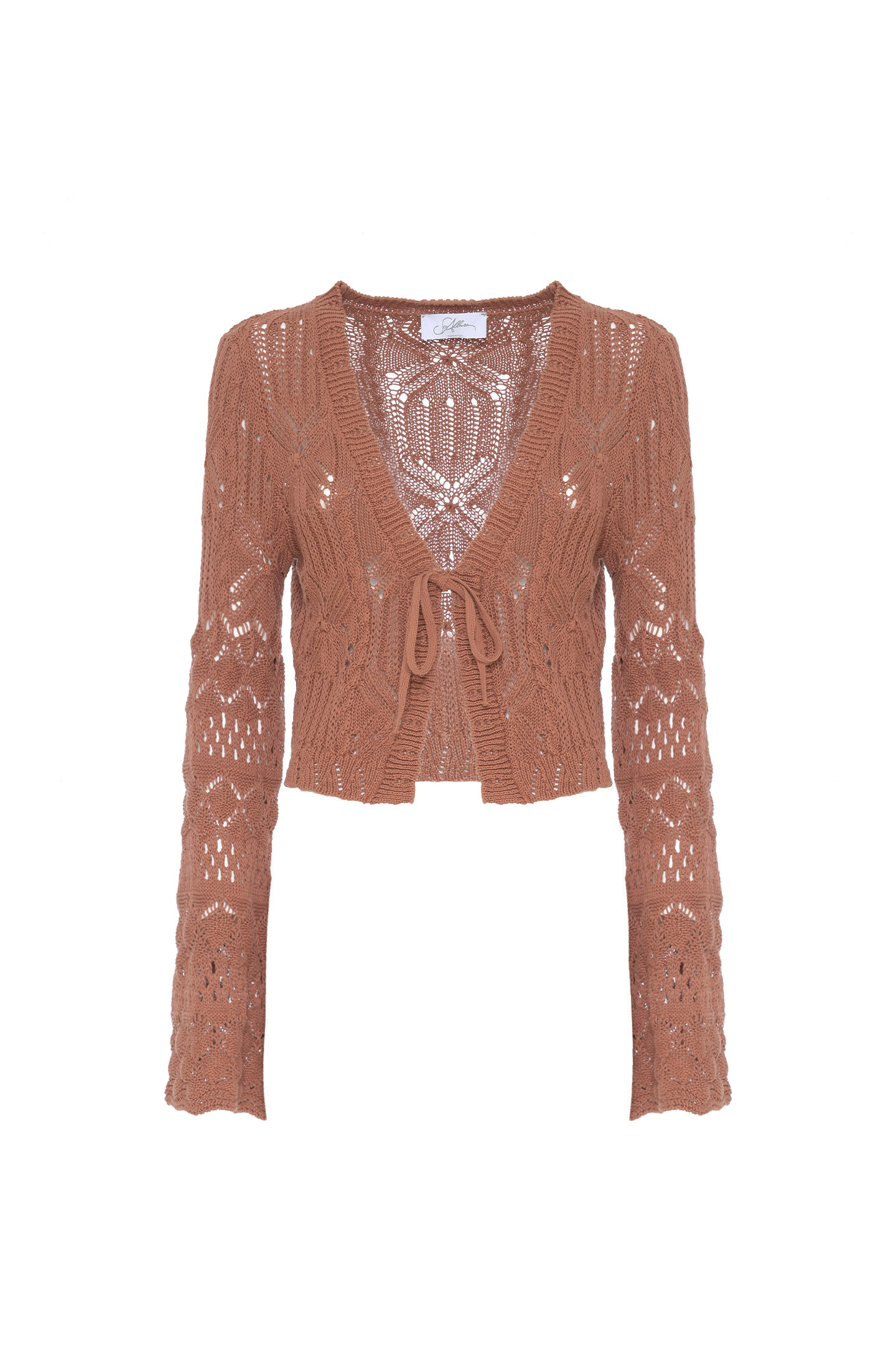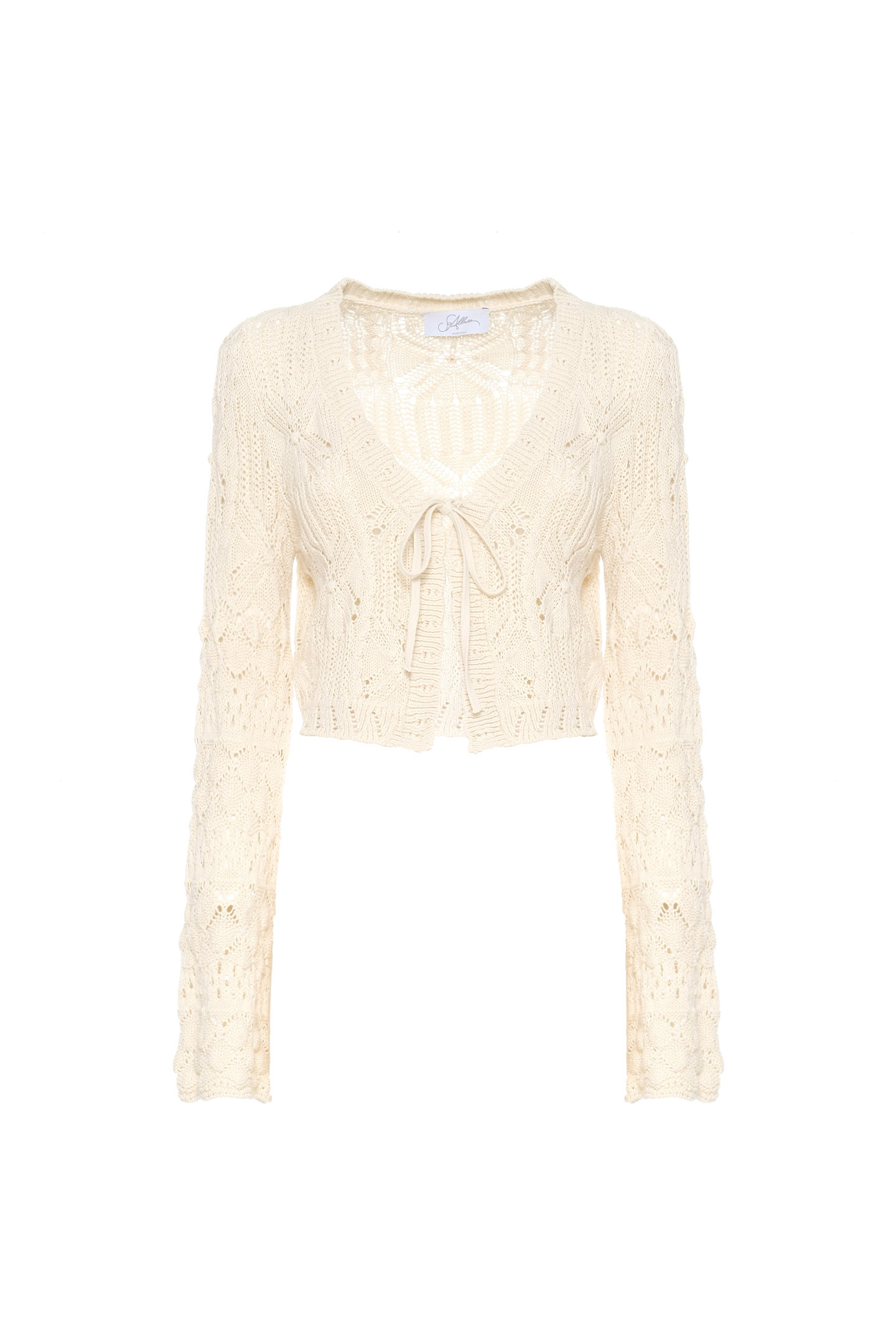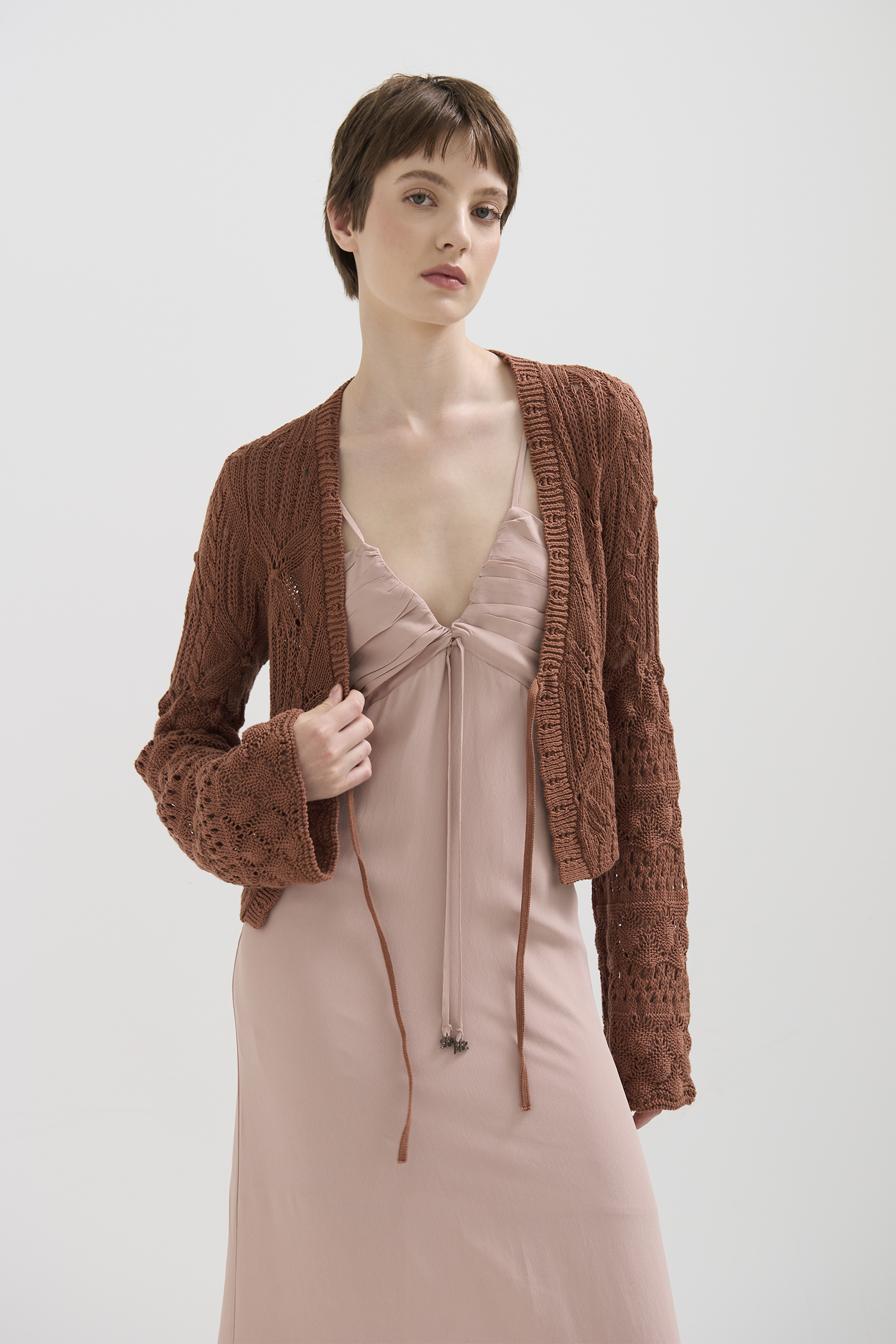 CARDIGAN IN PURO COTONE CON LAVORAZIONE A MAGLIA TRAFORATA A DISEGNI GIOMETRICI. MODELLO DALLA VESTIBILITÀ ADERENTE, MANICHE LUNGHE A CAMPANA E TAGLIO CORTO. PRESENTA UN AMPIO SCOLLO A V E UNA CHIUSURA SUL DAVANTI CON LACCETTO. UN CAPO DAL GUSTO ROMANTICO E BOHÉMIEN, IDEALE PER OUTFIT DA GIORNO. LA MODELLA È ALTA 1.78 M E INDOSSA LA TAGLIA S.