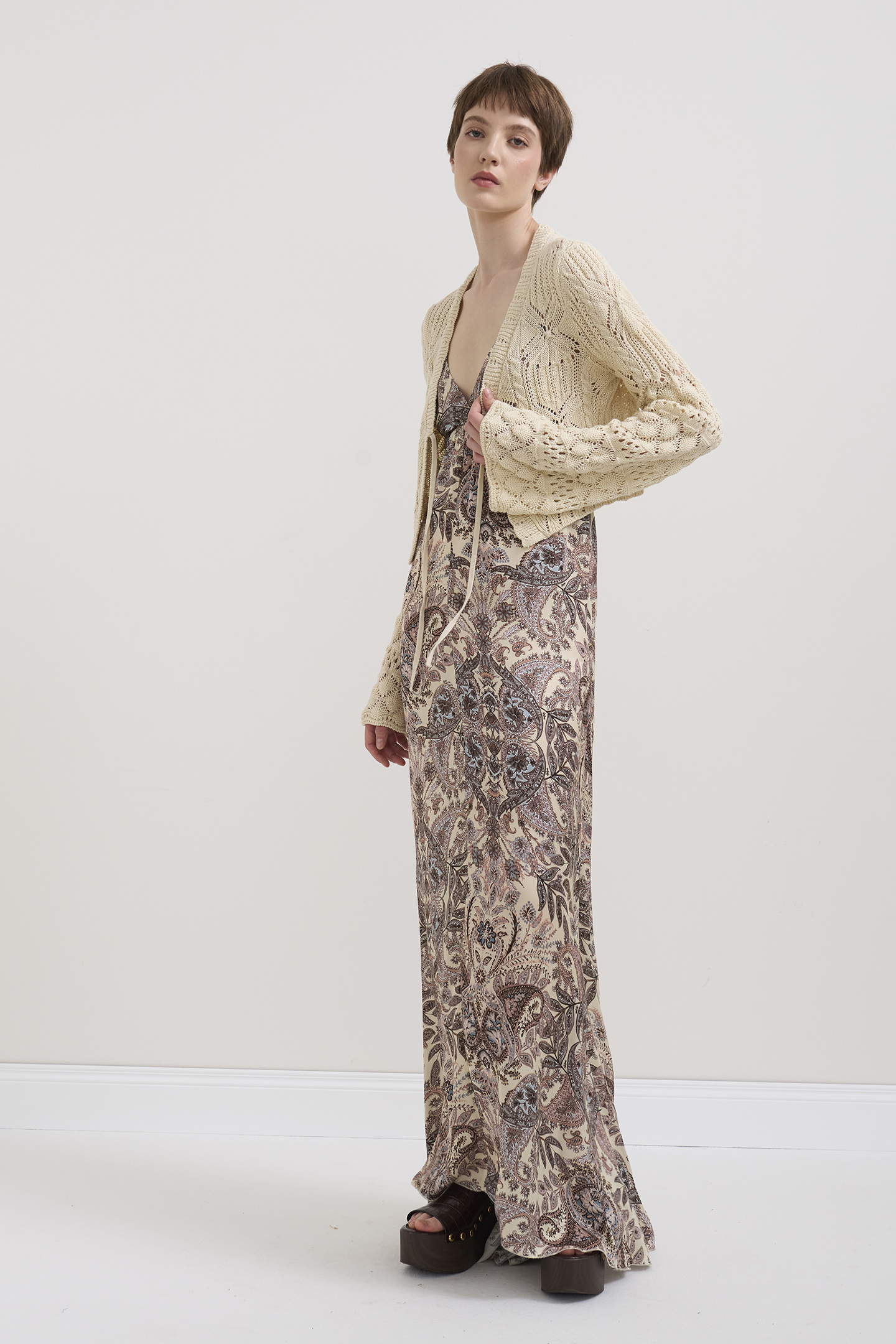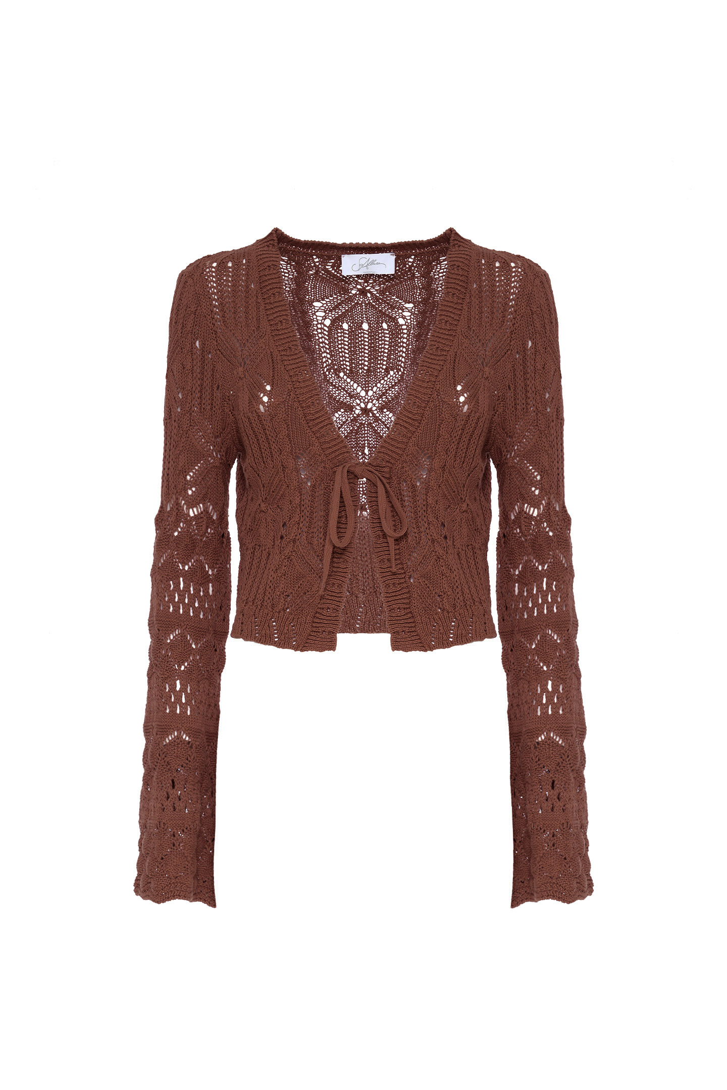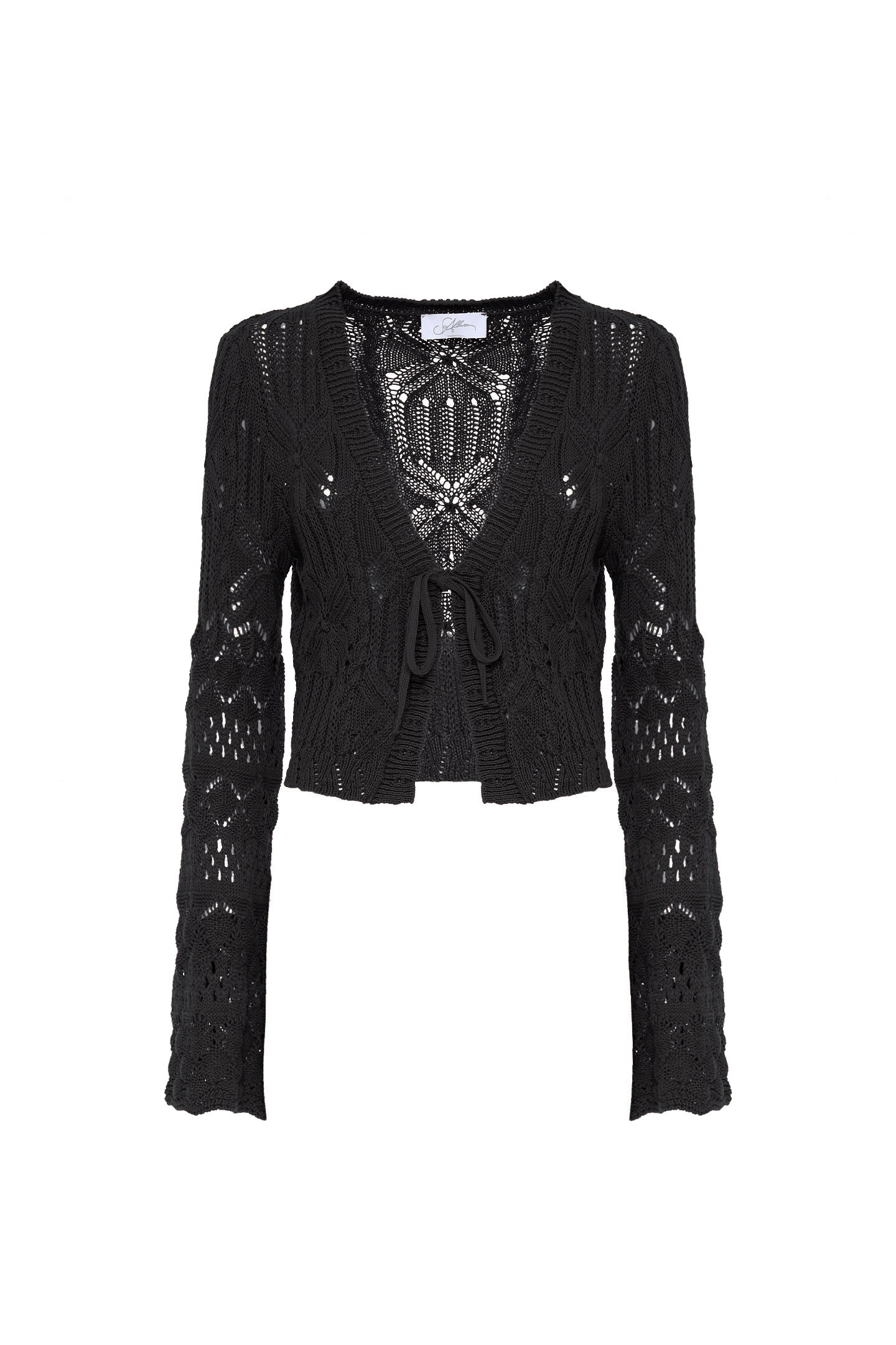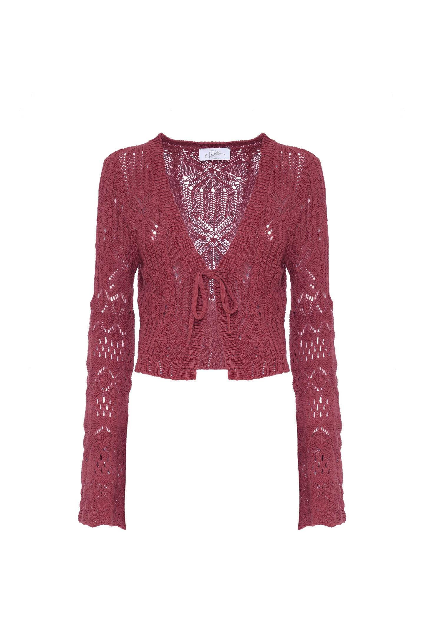 CARDIGAN IN PURO COTONE CON LAVORAZIONE A MAGLIA TRAFORATA A DISEGNI GIOMETRICI. MODELLO DALLA VESTIBILITÀ ADERENTE, MANICHE LUNGHE A CAMPANA E TAGLIO CORTO. PRESENTA UN AMPIO SCOLLO A V E UNA CHIUSURA SUL DAVANTI CON LACCETTO. UN CAPO DAL GUSTO ROMANTICO E BOHÉMIEN, IDEALE PER OUTFIT DA GIORNO. LA MODELLA È ALTA 1.78 M E INDOSSA LA TAGLIA S.