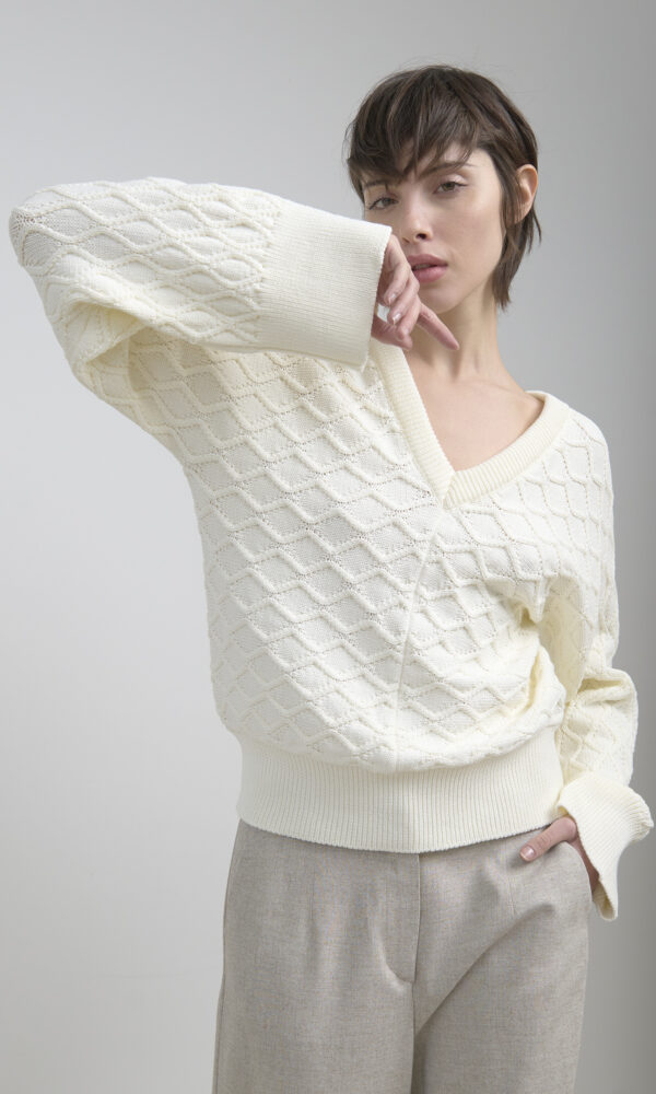 MAGLIA IN MISTO VISCOSA DAL DESIGN CONTEMPORANEO, CARATTERIZZATA DA UN ELEGANTE CUT‑OUT SUL GIROMANICA. VESTIBILITÀ OVERSIZE PER UN COMFORT MODERNO, REALIZZATA IN TESSUTO MORBIDO E PIACEVOLE AL TATTO. PRESENTA SCOLLO TONDO CLASSICO E MANICHE LUNGHE CON TAGLIO RAGLAN. RIFINITURE A COSTINE CHE CONFERISCONO UN TOCCO DISTINTIVO E CURATO.