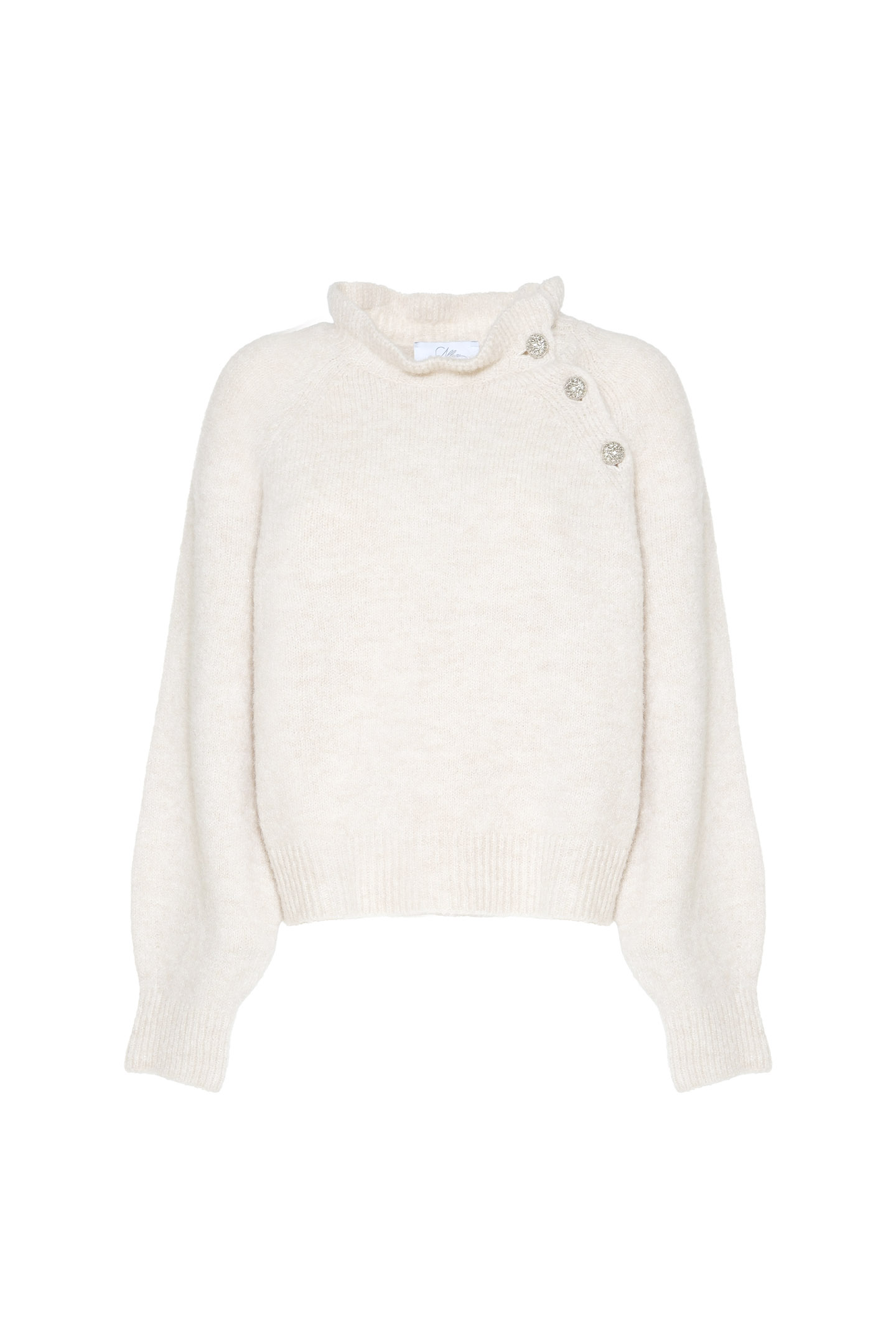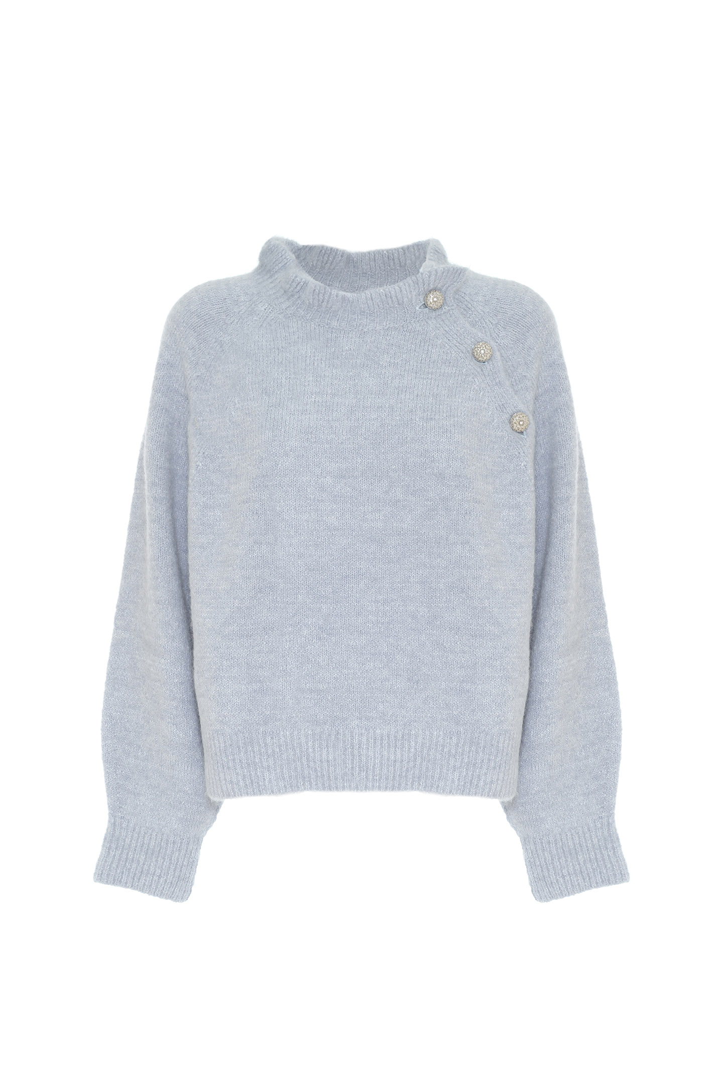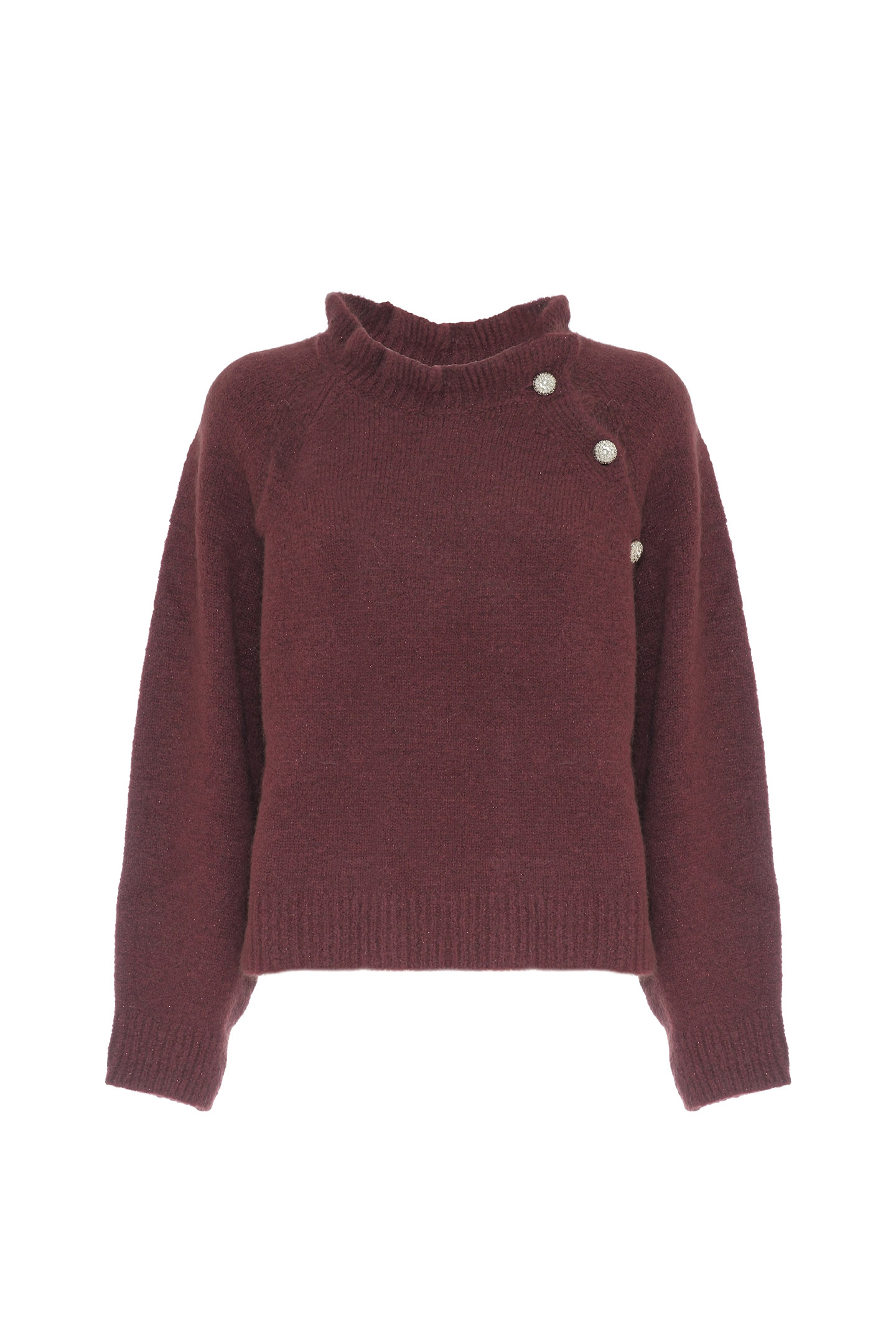 PULLOVER IN FILATO MISTO LANA E MOHAIR CON SCOLLO SMERLATO E BOTTONI GIOIELLO DECORATIVI.