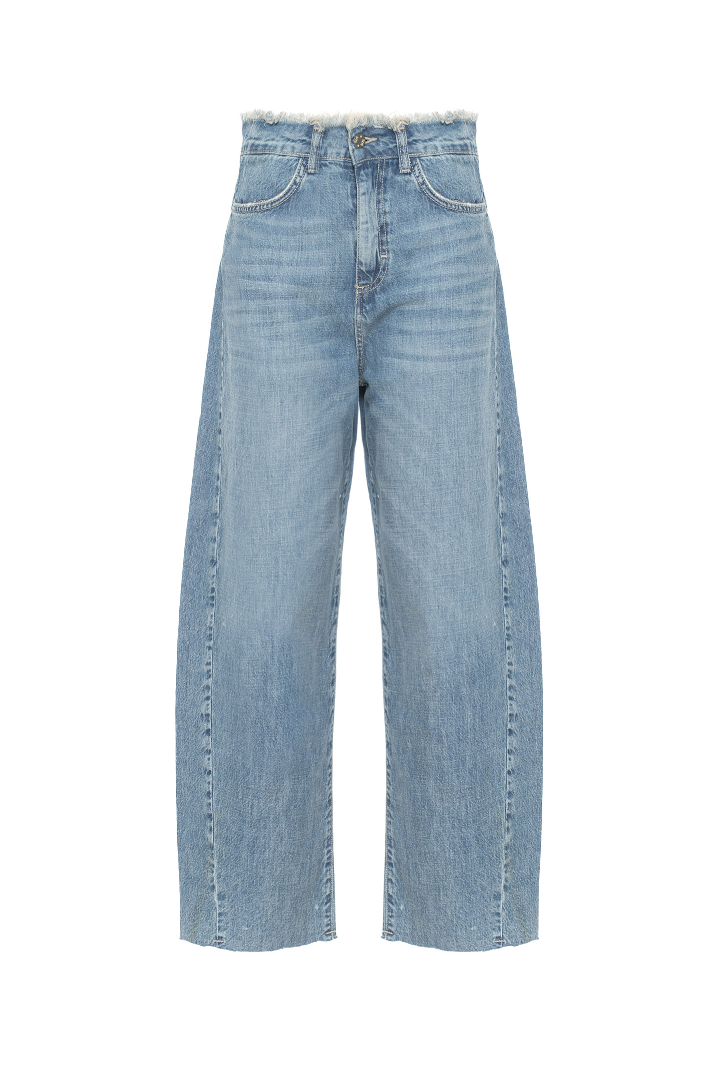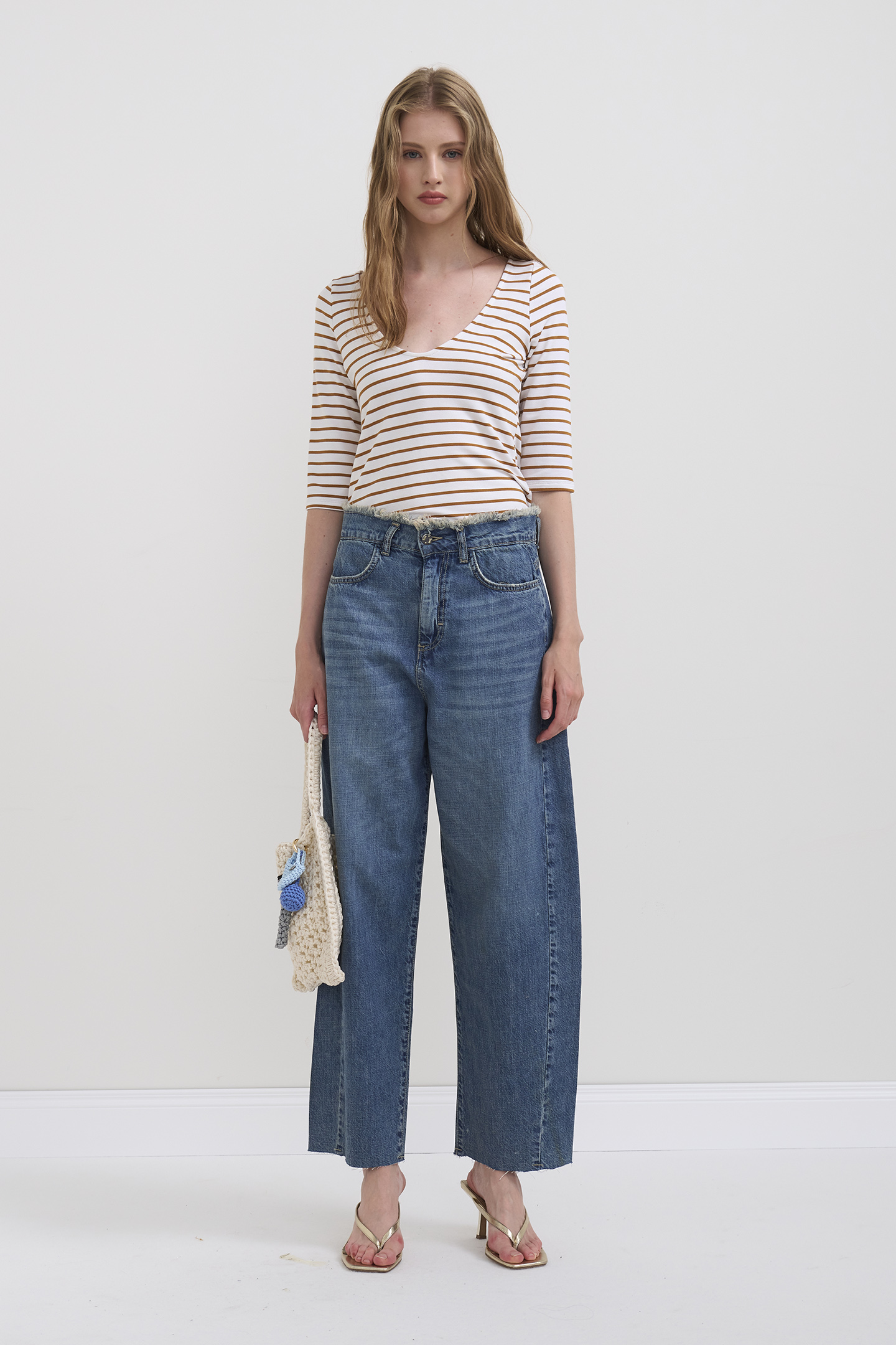 JEANS DAL TAGLIO BARREL LEGGERMENTE ARROTONDATO, CON VITA ALTA E VOLUME SUI FIANCHI. DESIGN VERSATILE, IDEALE COME CAPO ESSENZIALE PER QUALSIASI STAGIONE. RIFINITO A TAGLIO VIVO CON SFRANGIATURE SIA SUL CINTURINO IN VITA CHE SULL'ORLO INFERIORE, PER UN LOOK RAW SOFISTICATO. LA MODELLA È ALTA 1.78 M E INDOSSA UNA TAGLIA 42 IT.