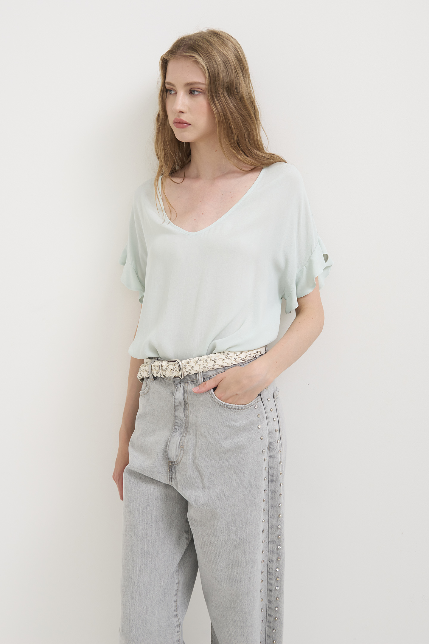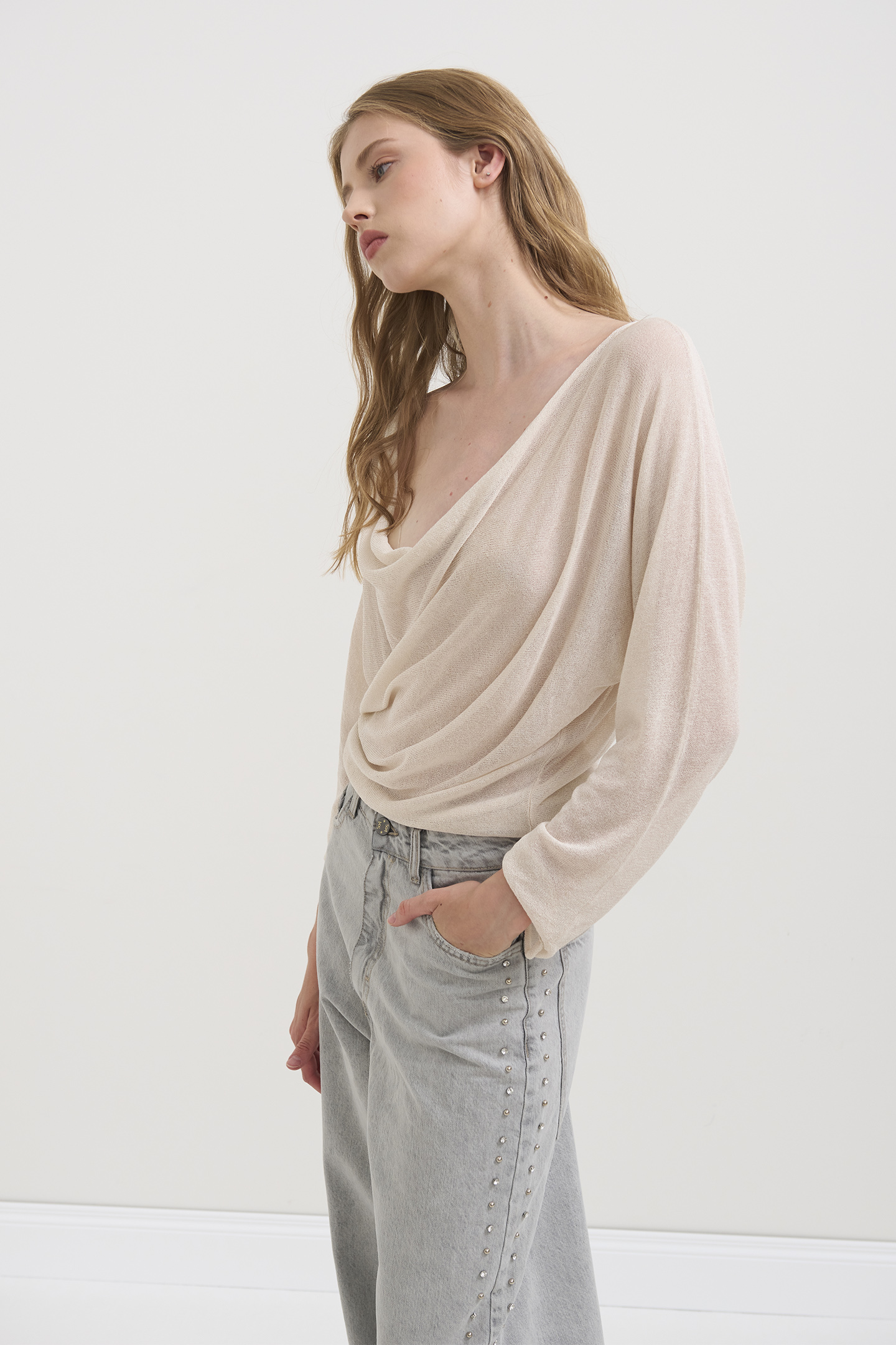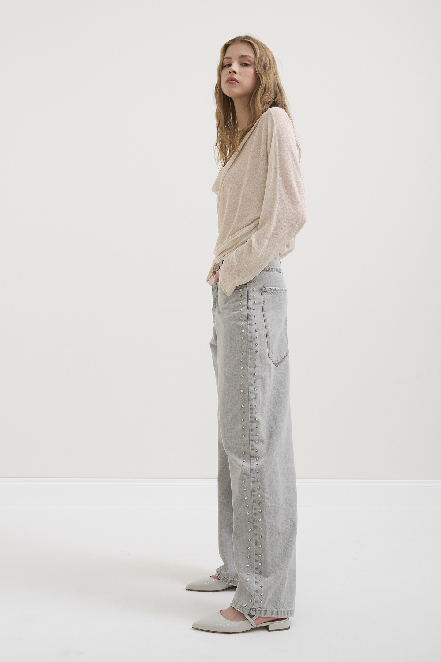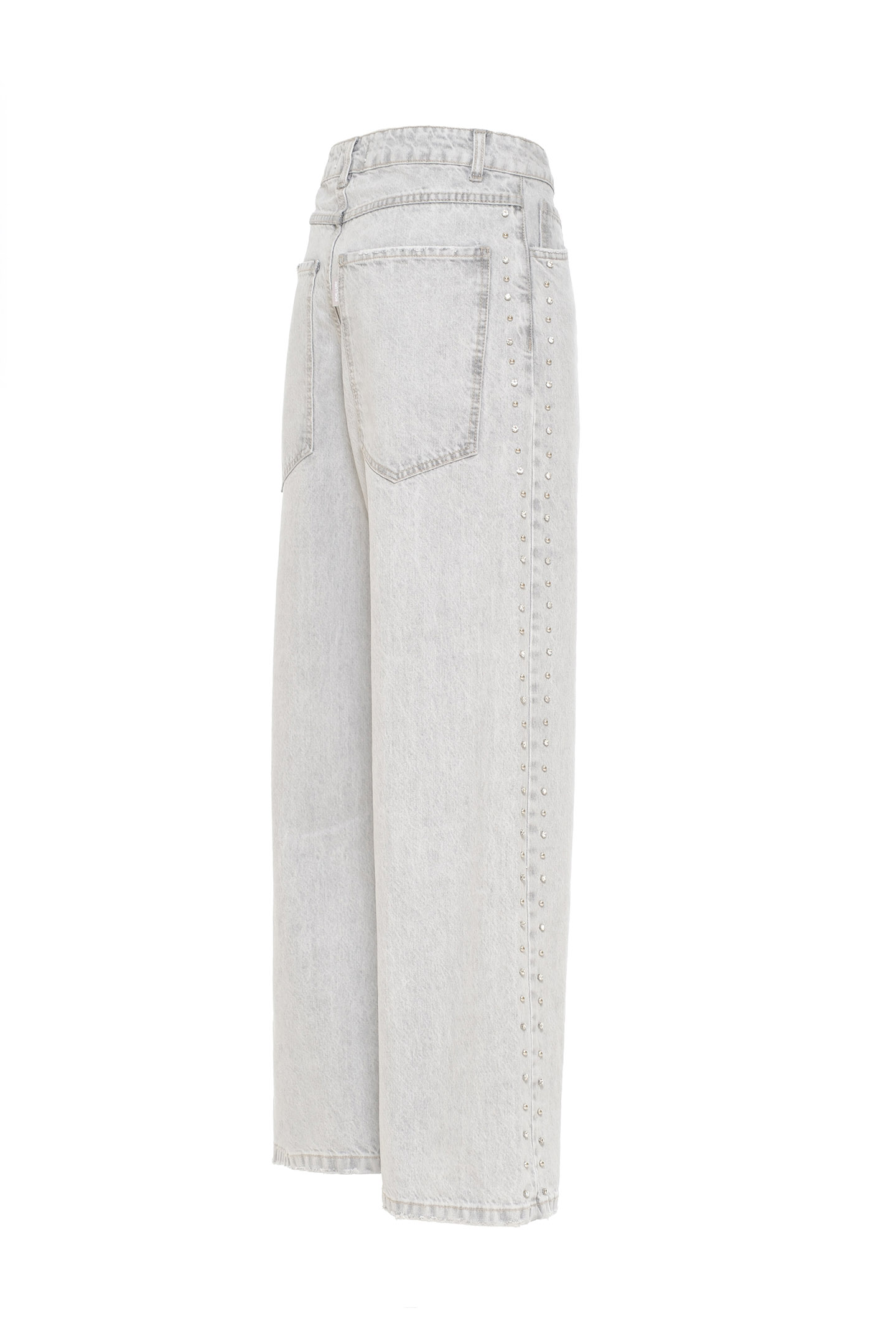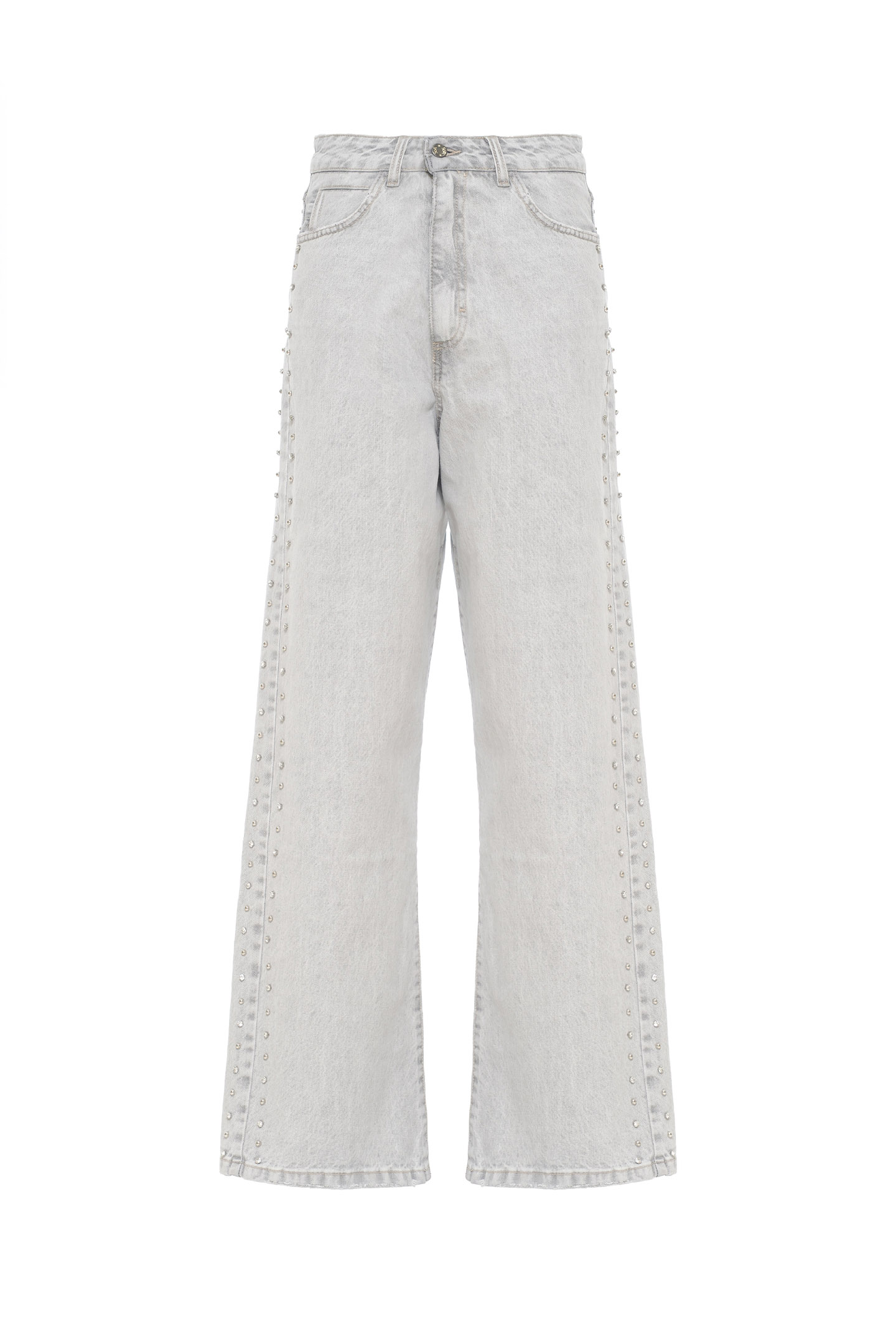 JEANS DALLA LINEA RILAXED FIT E TAGLIO CLASSICO CINQUE TASCHE. REALIZZATI IN 100% COTONE DAL LAVAGGIO GRIGIO CHIARO CON SFUMATURE DELICATE. CARATTERIZZATI DA MAXI TASCHE SUL RETRO CHE ESALTANO IL CARATTERE STREET E DA UNA DOPPIA FILA DI STRASS APPLICATE LUNGO LE CUCITURE LATERALI. LA MODELLA È ALTA 1.78 M E INDOSSA UNA TAGLIA 42 IT.