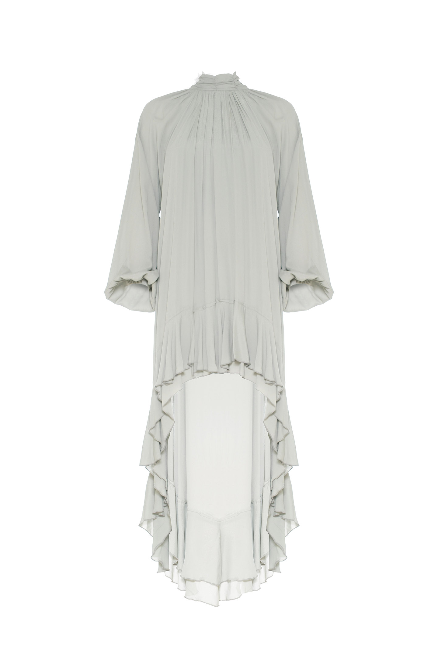 ABITO LUNGO IN CREPONNE DI VISCOSA ELASTICIZZATA, DAL DESIGN FLUIDO E RAFFINATO. CARATTERIZZATO DA UN COLLO ALTO RIFINITO DA ARRICCIATURE MANICHE AMPIE A VOLUME CON POLSINI ELASTICI. IL TAGLIO ASIMMETRICO CON BALZE E DRAPPEGGI CREA MOVIMENTO E DINAMISMO AD OGNI PASSO, ESALTANDO LA FEMMINILITÀ CON UNA LINEA MODERNA E SOFISTICATA.