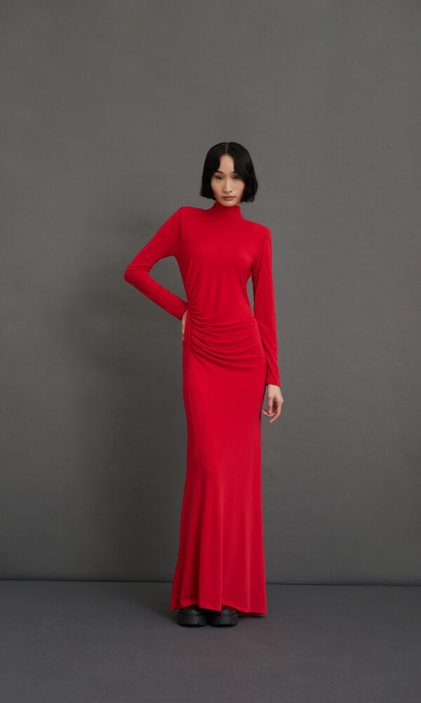 TESSUTO ELASTICIZZATO, CARATTERIZZATO DA ARRICCIATURE SU TUTTA LA LUNGHEZZA PER UN’EFFETTO DRAPPEGGIATO CHE SLANCIA LA SILHOUETTE.