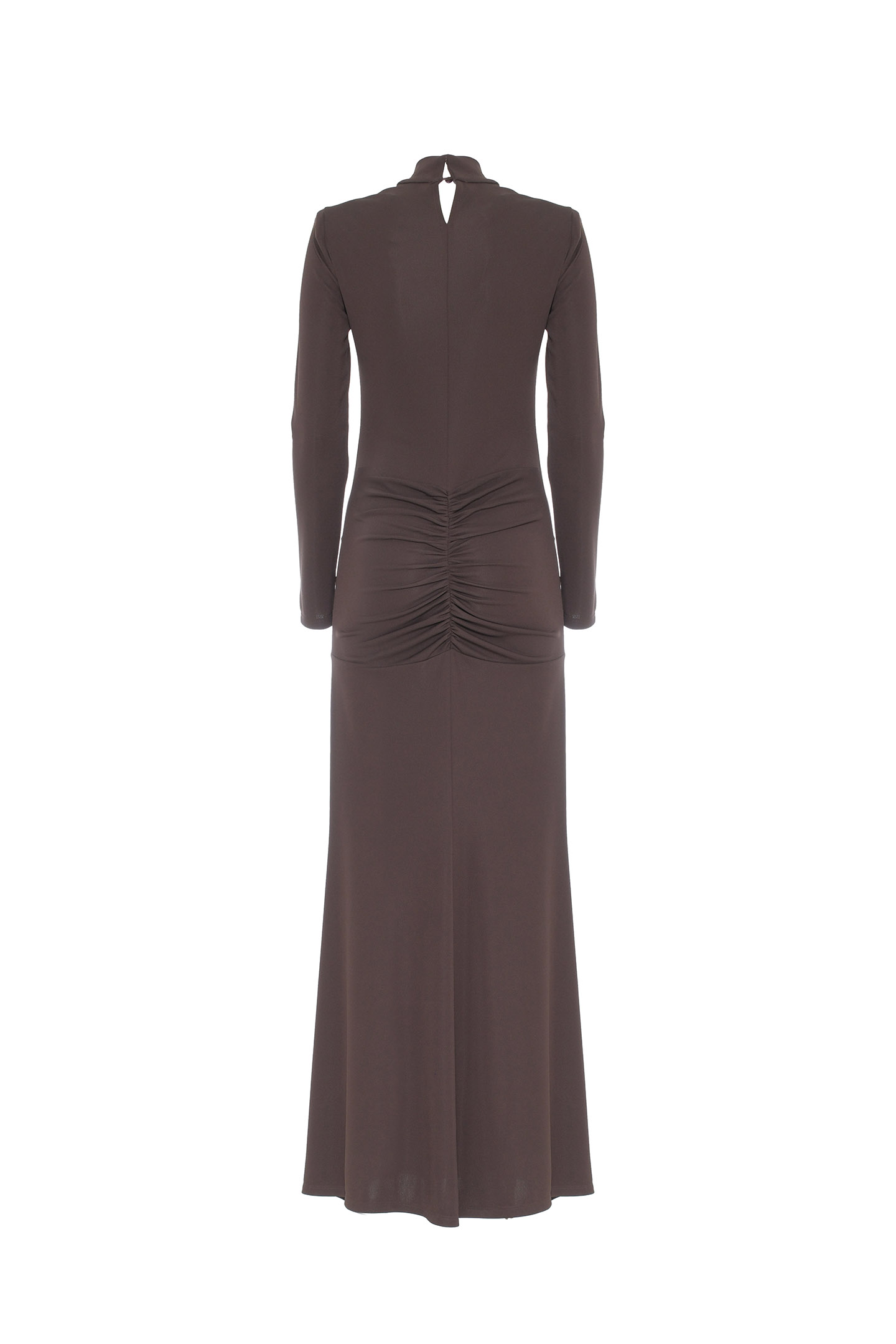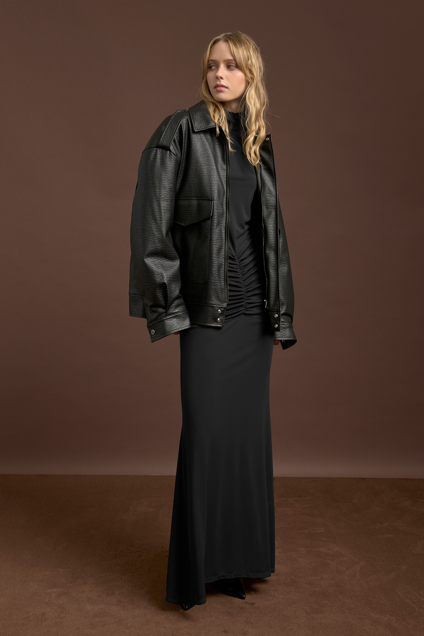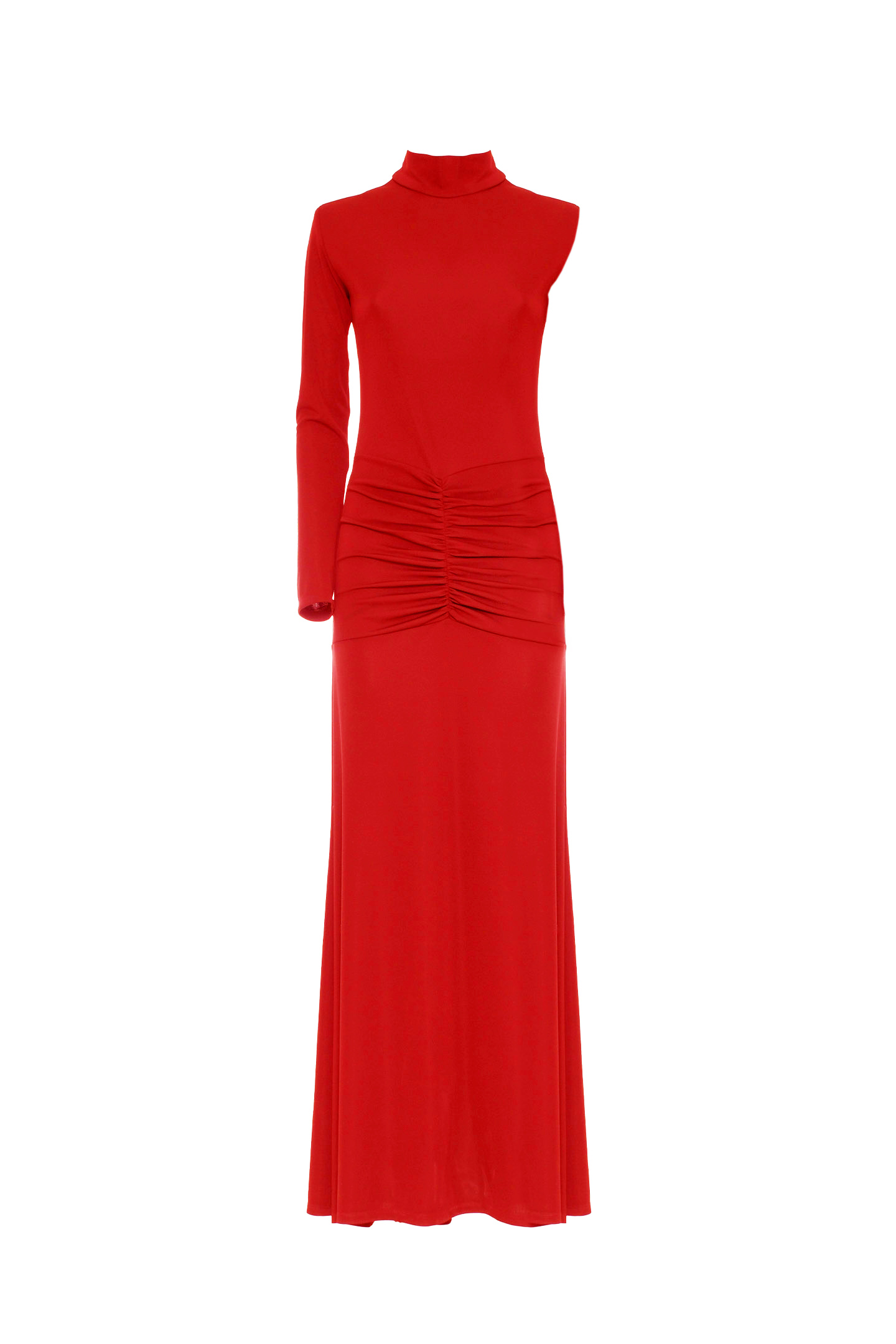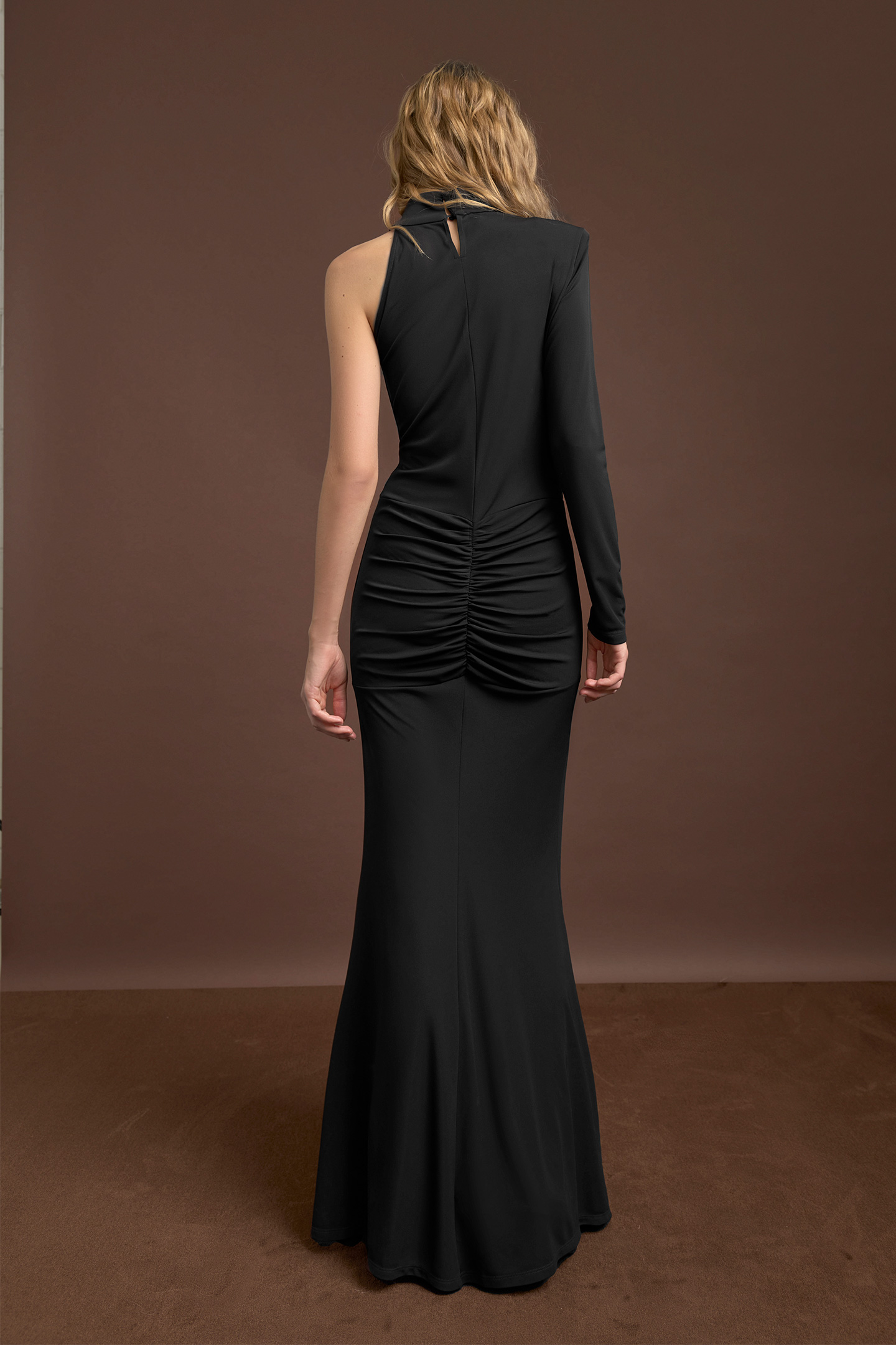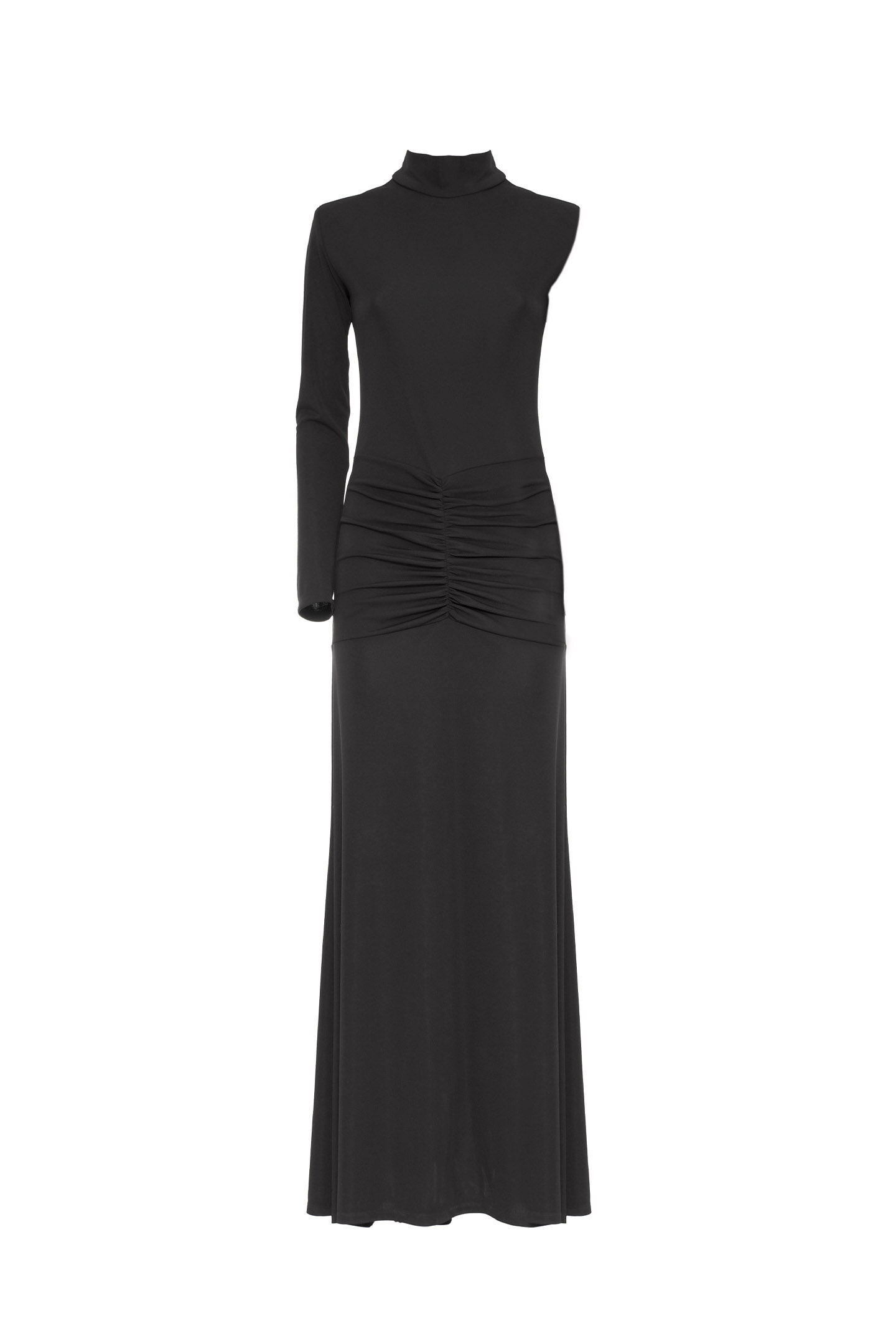 ELEGANTE ABITO DA SERA LUNGO IN TESSUTO FLUIDO DI JERSEY, CARATTERIZZATO DA UN DESIGN ASIMMETRICO E LINEE STRUTTURATE. PRESENTA UNO SCOLLO ALTO E UNA SOLA MANICA LUNGA SU UN LATO. LA MANICA È LEGGERMENTE IMBOTTITA PER DEFINIRE LA LINEA DELLA SPALLA. LA PARTE CENTRALE È ARRICCHITA DA UN DRAPPEGGIO CHE MODELLA LA SILHOUETTE, ESALTANDO LE FORME. LA GONNA, ADERENTE FINO AL GINOCCHIO, SI APRE LEGGERMENTE VERSO IL BASSO IN UNA LINEA A SIRENA GLAMOUR E SOFISTICATA. UN VERO E PROPRIO STATEMENT PIECE, IDEALE PER OCCASIONI SPECIALI E EVENTI SERALI. LA MODELLA È ALTA 1.79 CM E INDOSSA UNA TAGLIA 42 IT.