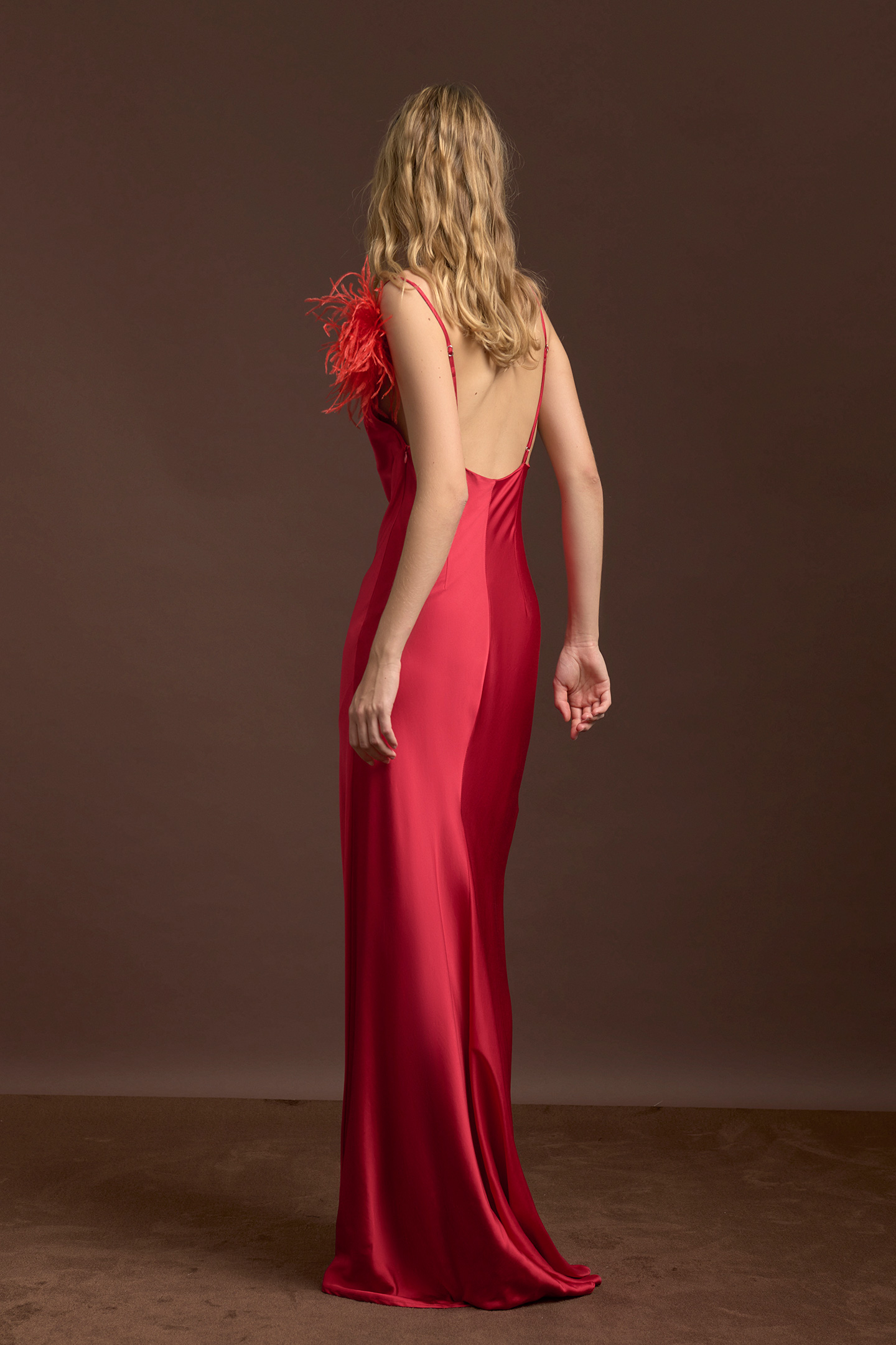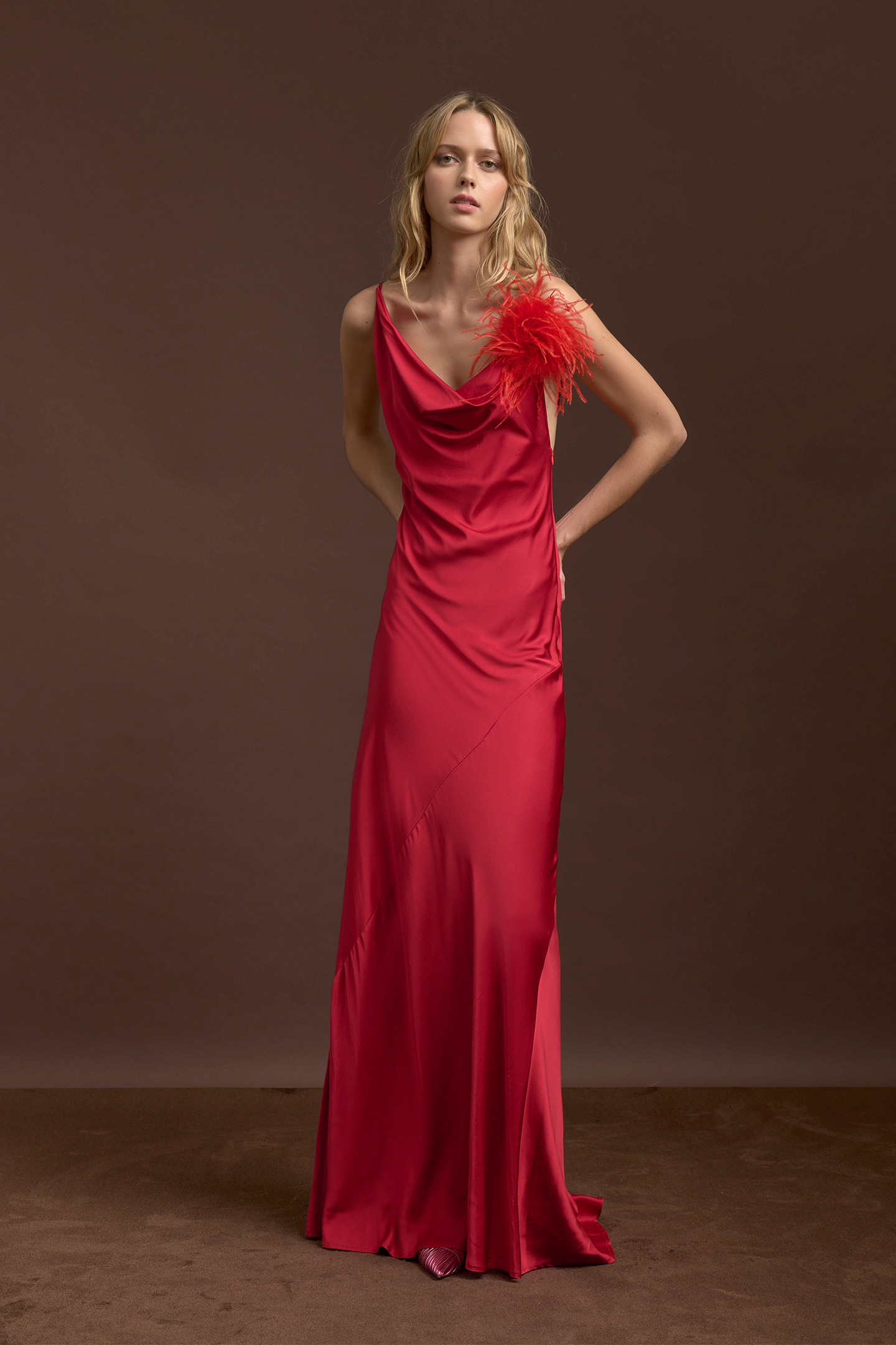 ABITO DA SERA IN RASO CON SCOLLO DRAPPEGGIATO E SPALLINE SOTTILI REGOLABILI DAL DESIGN ASIMMETRICO. REALIZZATO IN RASO FLUIDO E LUMINOSO, PRESENTA UNA SILHOUETTE ELEGANTE E FEMMINILE CHE VALORIZZA LE FORME GRAZIE AL TAGLIO A SBIECO. LA VESTIBILITÀ SEGUE DELICATAMENTE LE LINEE DEI FIANCHI E SI APRE SUL FONDO CON UN AMPIO MOVIMENTO E UN LEGGERO STRASCICO, CREANDO UN EFFETTO SOFISTICATO E SENSUALE. CHIUSURA CON ZIP INVISIBILE LATERALE PER UNA FINITURA PULITA E IMPECCABILE. IDEALE COME ABITO DA SERA LUNGO O ABITO ELEGANTE DA CERIMONIA, PERFETTO PER EVENTI SPECIALI, MATRIMONI E SERATE FORMALI. LA MODELLA È ALTA 1.79 CM E INDOSSA UNA TAGLIA 42 IT.