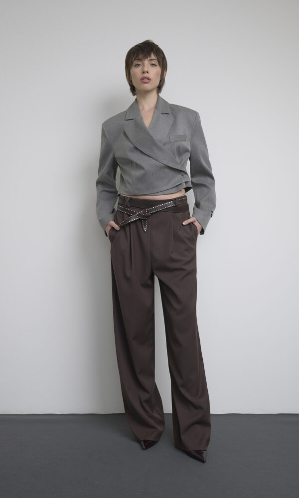PANTALONI SARTORIALI A GAMBA DRITTA IN TESSUTO MOTIVO GESSATO. CARATTERIZZATI DA UNA LINEA PULITA E FORMALE CON VITA REGOLARE CON PASSANTI PER CINTURA E CHIUSURA CON BOTTONE E ZIP SUL DAVANTI. PRESENTANO TASCHE LATERALI ALLA FRANCESE E TASCHE A FILETTO SUL RETRO. IL TAGLIO LEGGERMENTE MORBIDO LO RENDE PERFETTO PER LOOK FORMALI O PER OUTFIT PIÙ RILASSATI D’ISPIRAZIONE ANDROGINA. UN CAPO VERSATILE, DA INDOSSARE IN COORDINATO O SPEZZATO.