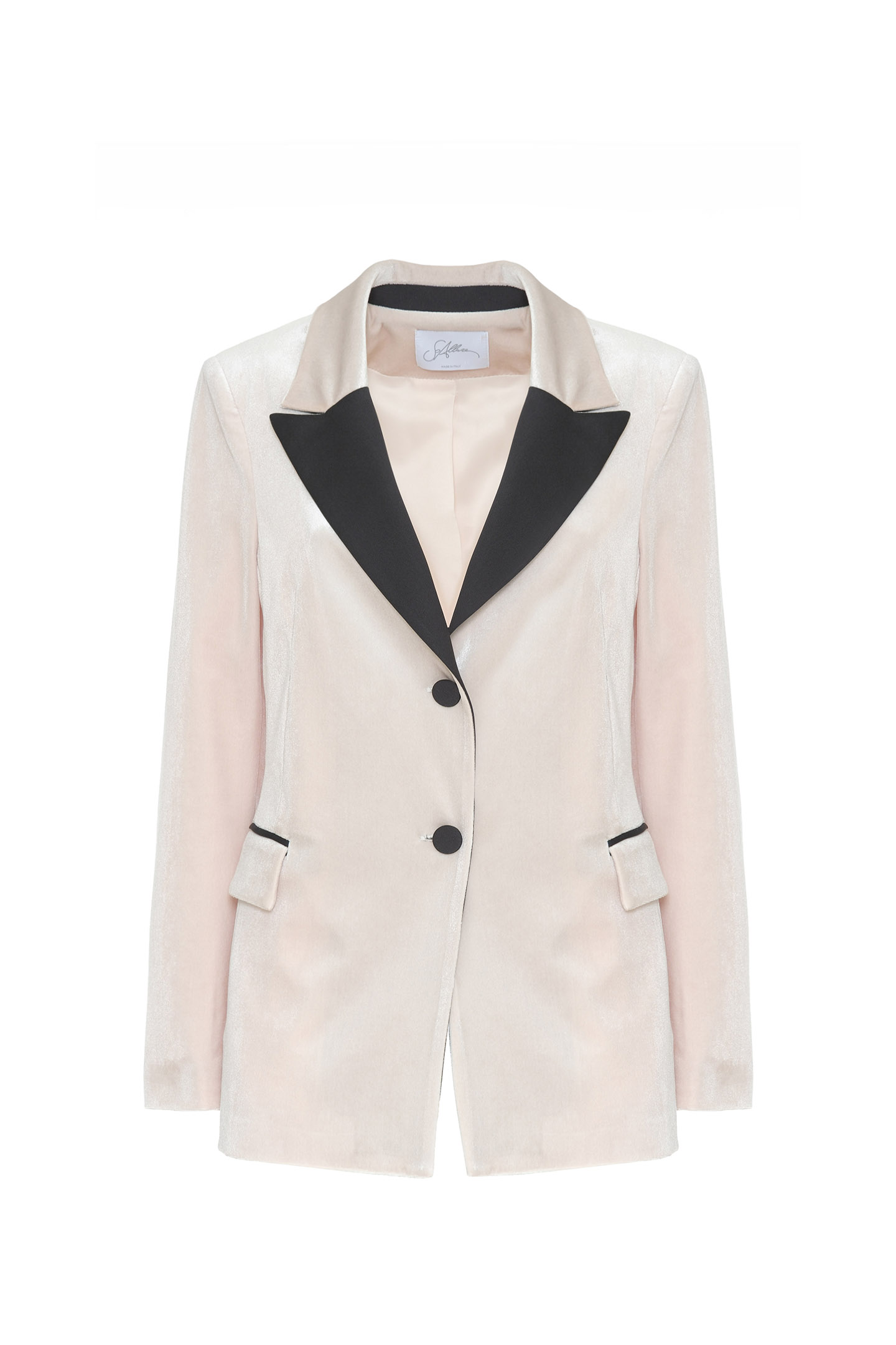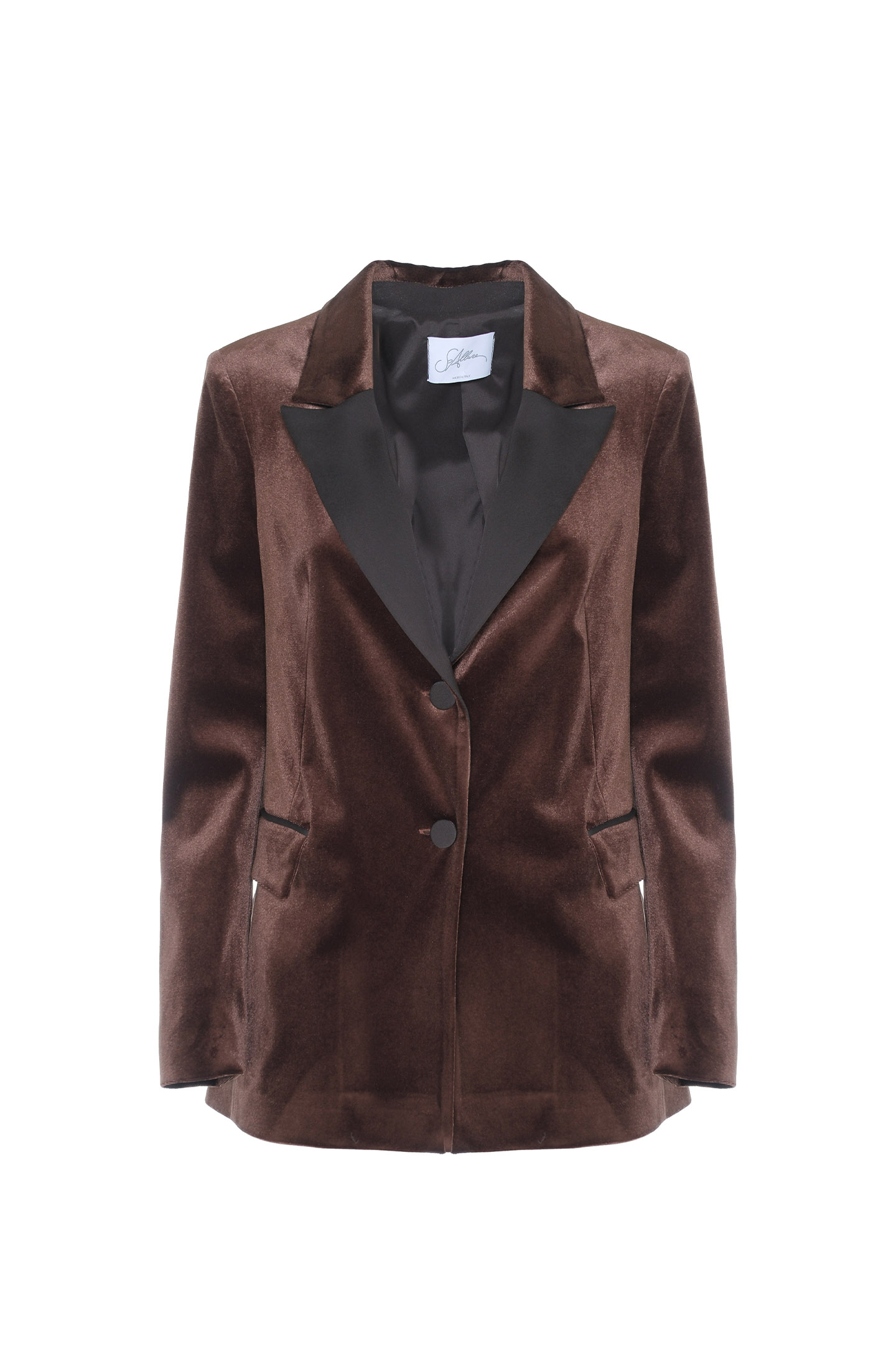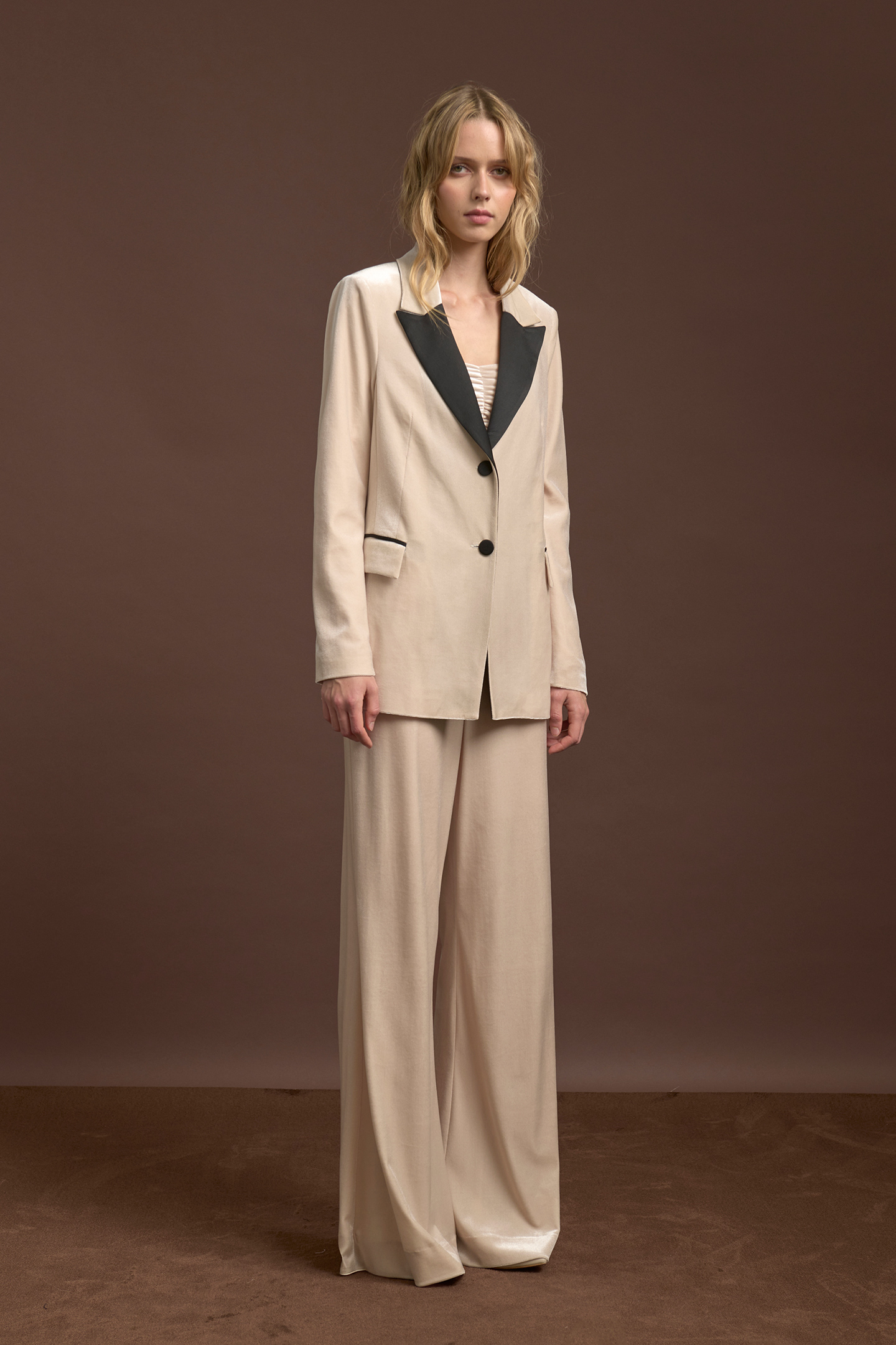 GIACCA IN VELLUTO CON REVER A LANCIA IN RASO DAL DESIGN MONOPETTO. PRESENTA BOTTONI IN RASO E TASCHE A FILETTO CON PATTA AI FIANCHI. VESTIBILITÀ REGOLARE IDEALE PER UNA SILHOUETTE ELEGANTE E SOFISTICATA. LA MODELLA È ALTA 1.79 CM E INDOSSA UNA TAGLIA 42 IT.