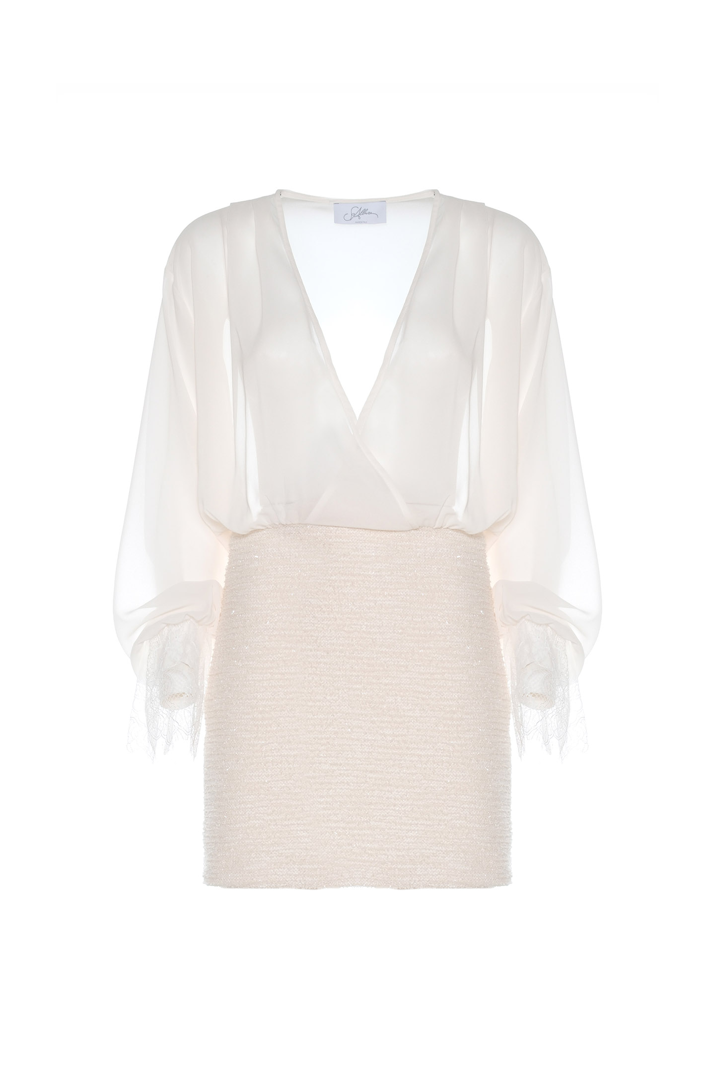 ASSEMBLED TWO-PIECE DRESS IN LIGHTWEIGHT CHIFFON AND BOUCLE FABRIC. FEATURES A LIGHTWEIGHT, SEMI-SHINE BLOUSE WITH A DEEP V-NECK AND LONG, WIDE SLEEVES FINISHED WITH LACE CUFFS. THE BOUCLE BOTTOM OFFERS A SHEATH FIT. IDEAL FOR SPECIAL OCCASIONS REQUIRING A REFINED AND ELEGANT STYLE.