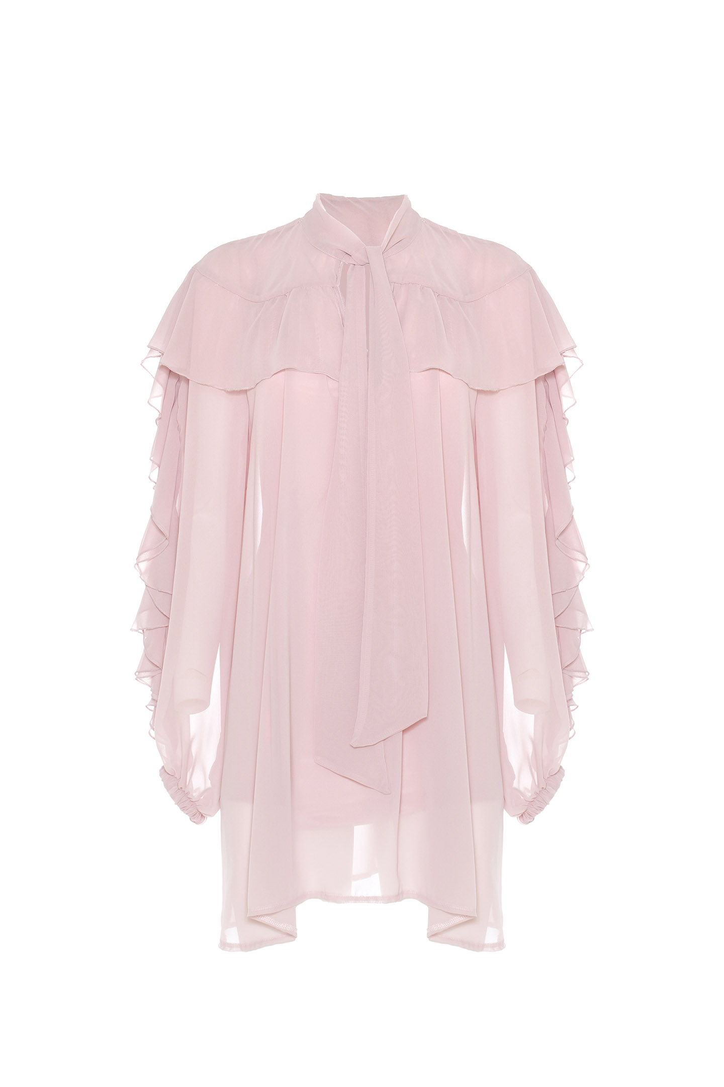 SEMI-TRANSPARENT FABRIC DRESS, ENHANCED BY RUFFLES AND ROUCHES ON THE NECKLINE AND WIDE SLEEVES. THE NECKLINE CLOSES WITH A SCARF FOR A HYPER-FEMININE TOUCH. THE FLOWING, LIGHT LINE SKIMMING THE SILHOUETTE CREATES MOVEMENT AND SOPHISTICATION. FOR A CONTEMPORARY LOOK, IT CAN BE WORN WITH CONTRASTING TROUSERS OR BOOTS. IDEAL FOR SPECIAL OCCASIONS OR TO ADD AN ELEGANT DETAIL TO EVERYDAY WEAR. COMPLEMENTED BY A MATCHING SLIP.