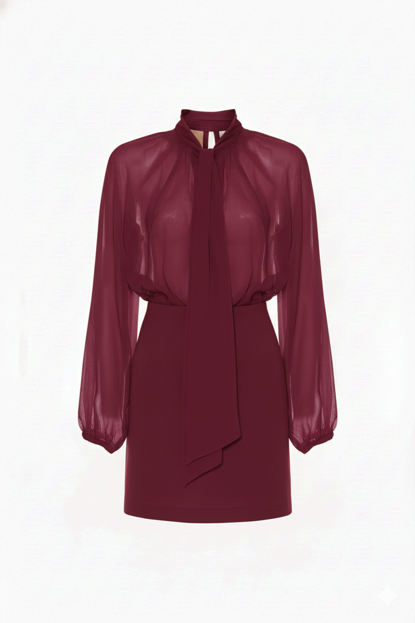 SHORT DRESS COMPRISING A SHEER FABRIC BLOUSE AND A JERSEY PENCIL SKIRT. FEATURING WIDE, LONG PUFFED SLEEVES, ELASTICATED CUFFS AND A SCARF COLLAR. IDEAL FOR FORMAL OCCASIONS, EVENING EVENTS OR CEREMONIES.
