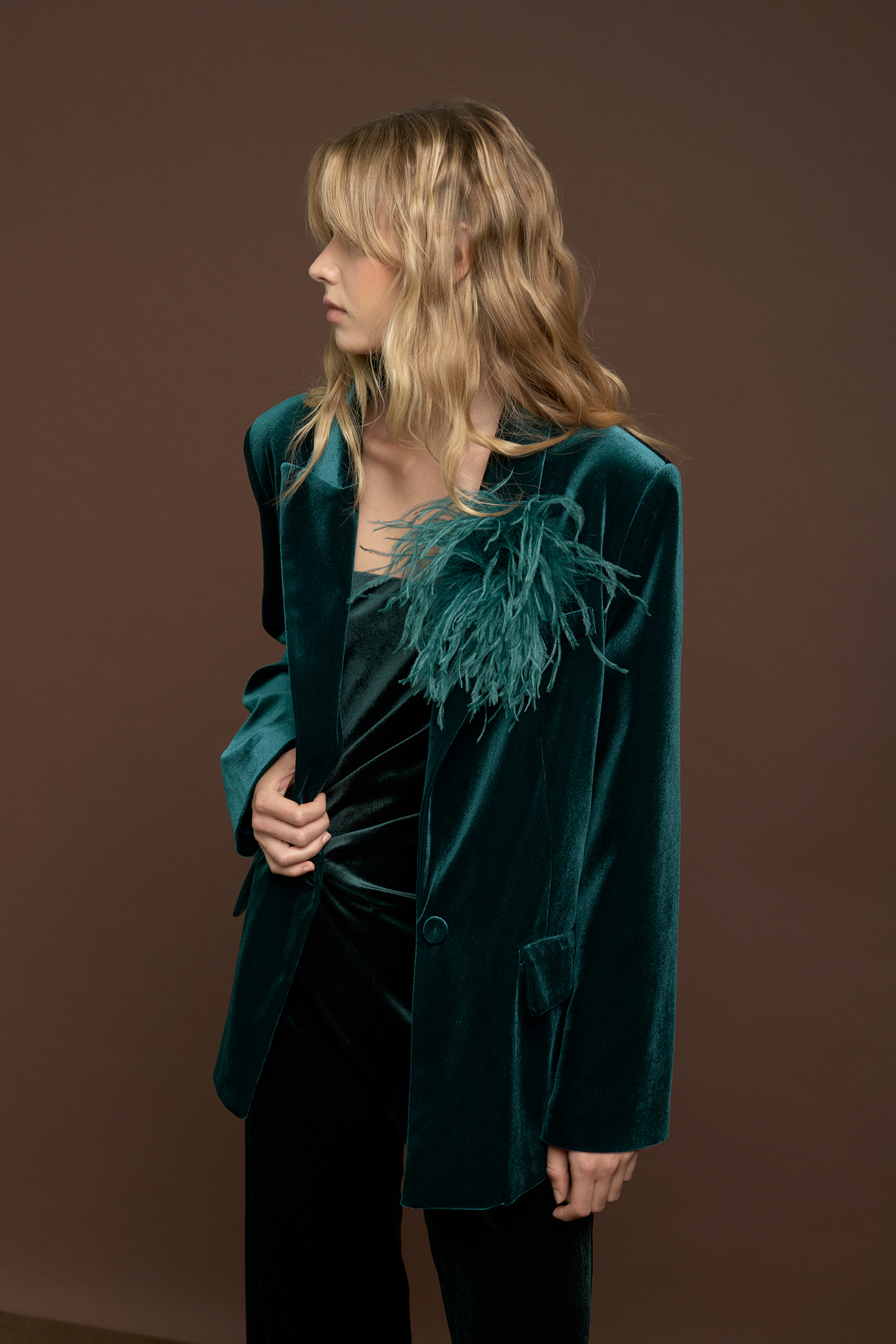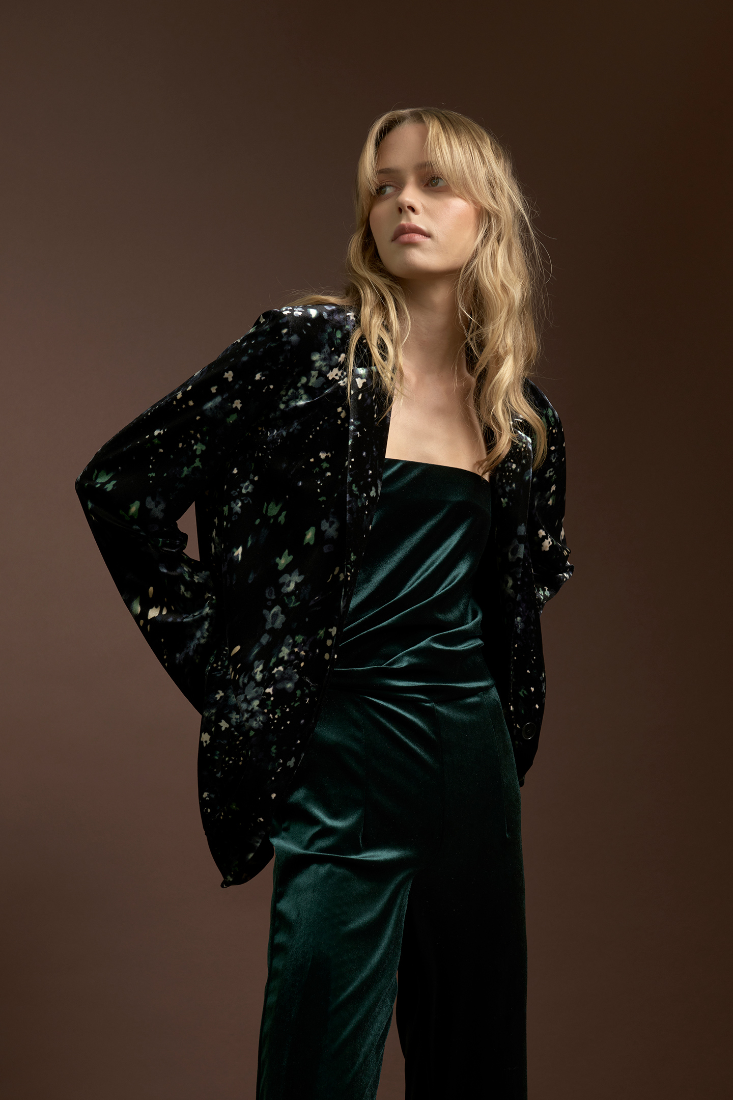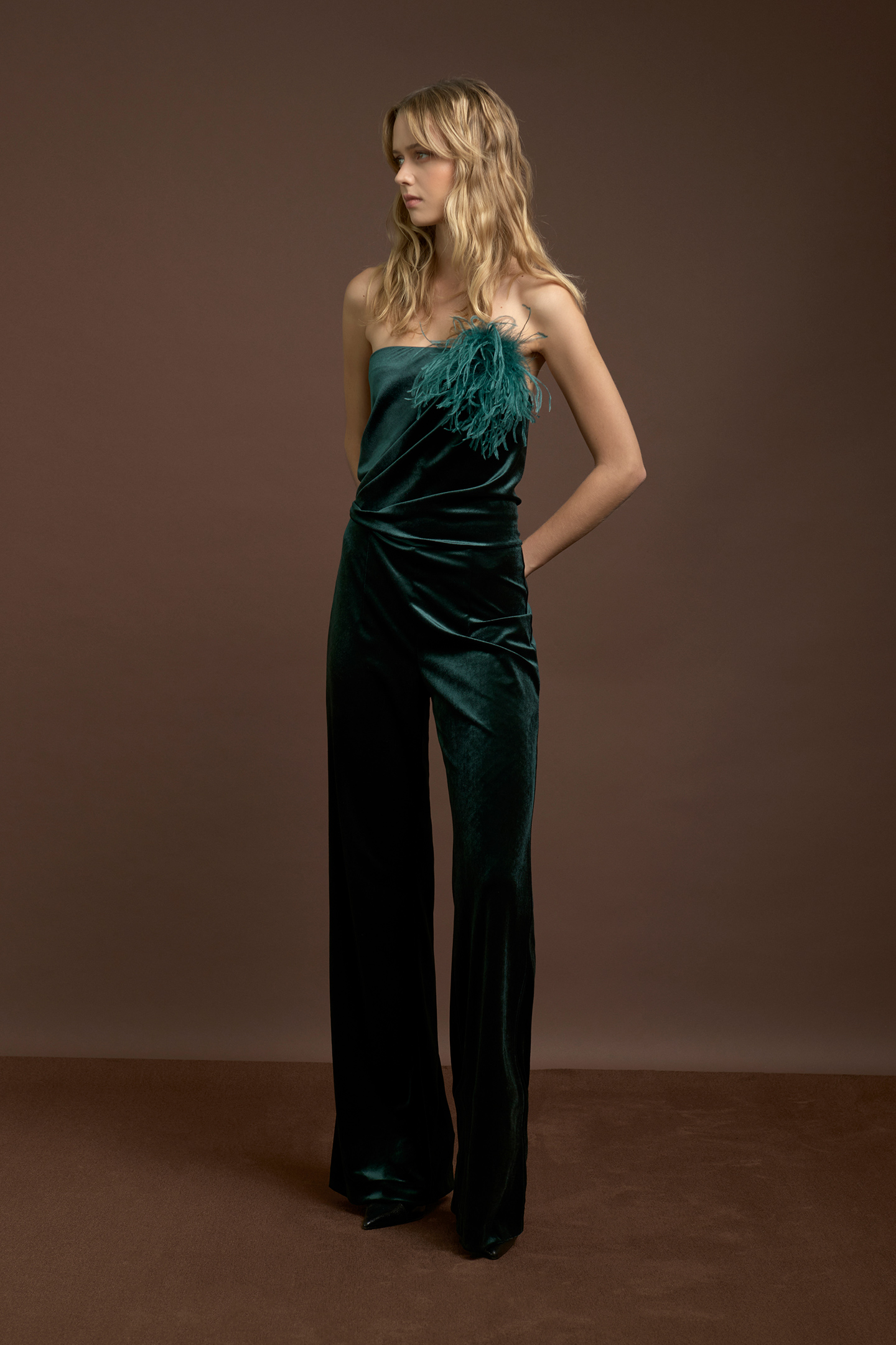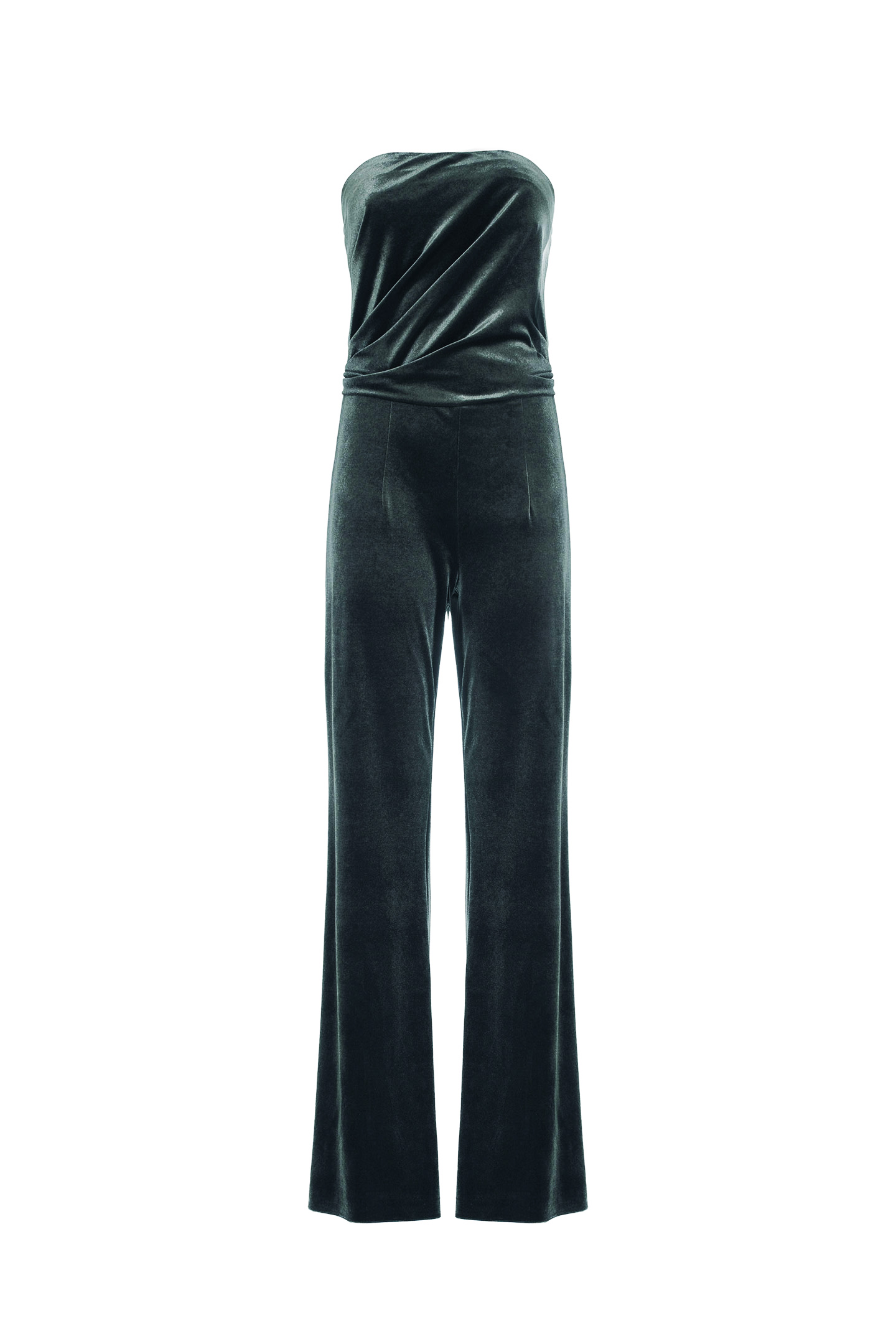ELEGANT VELVET JUMPSUIT WITH BUSTIER DESIGN AND NO STRAPS. FINISHED WITH CROSSED DRAPING AT THE NECKLINE AND WAIST, GIVING A THREE-DIMENSIONAL EFFECT AND ENHANCING THE BODY'S CURVES IN A SOPHISTICATED WAY. THE WIDE-LEG PALAZZO TROUSERS OFFER A FLOWING AND COMFORTABLE FIT. INVISIBLE SIDE ZIP CLOSURE. A MODERN AND REFINED ALTERNATIVE TO THE EVENING DRESS. THE MODEL IS 1.79 M TALL AND WEARS A SIZE 42 IT.