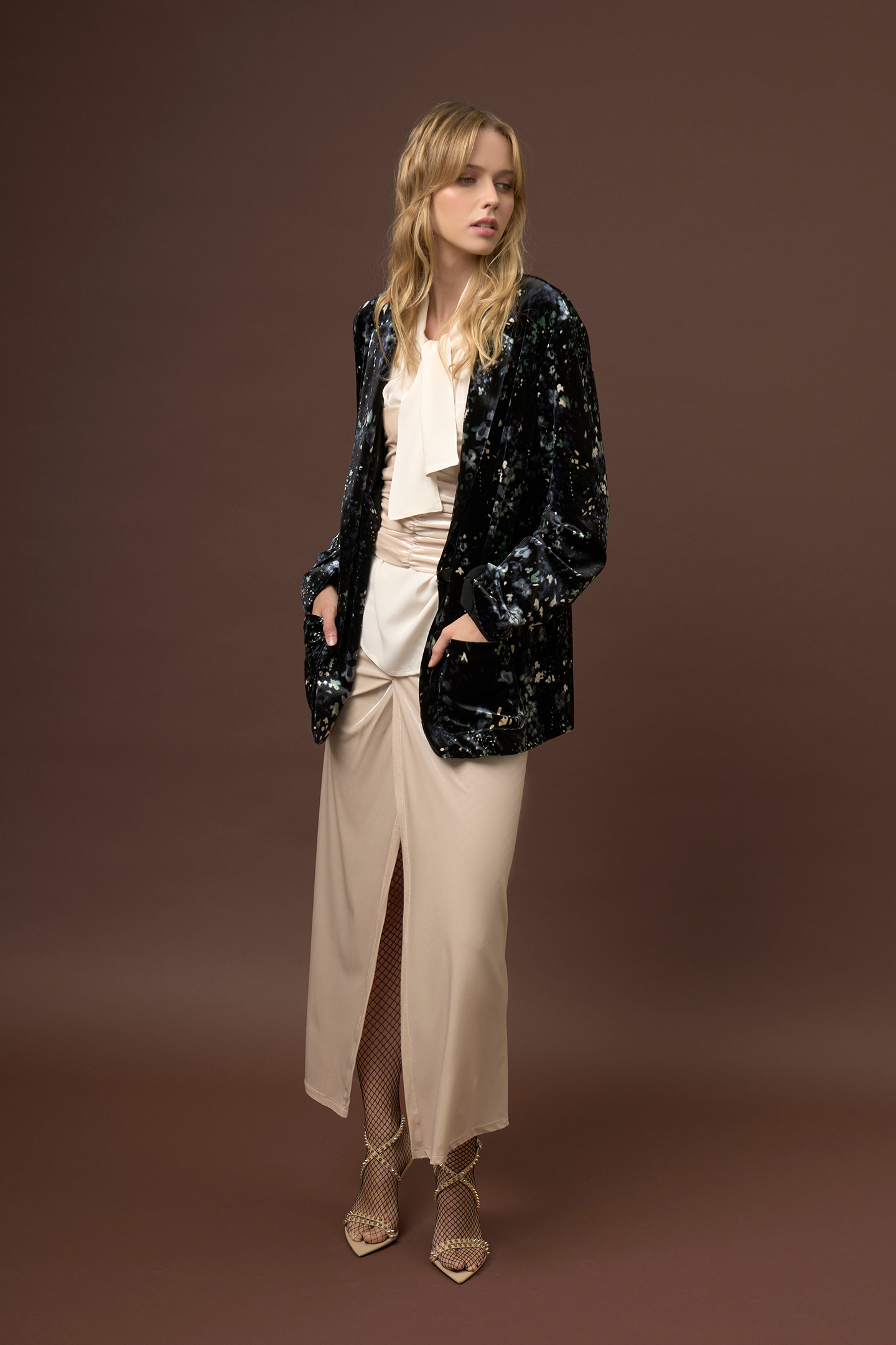 VELVET JACKET WITH FLORAL PRINT AND CLASSIC LAPEL. DESIGN WITH ONE-BUTTON CLOSURE, POCKETS APPLIED TO THE SIDES. OVERSIZED FIT. THIS ITEM IS PART OF A SUIT. THE MODEL IS 1.79 M TALL AND WEARS A SIZE 42 IT.