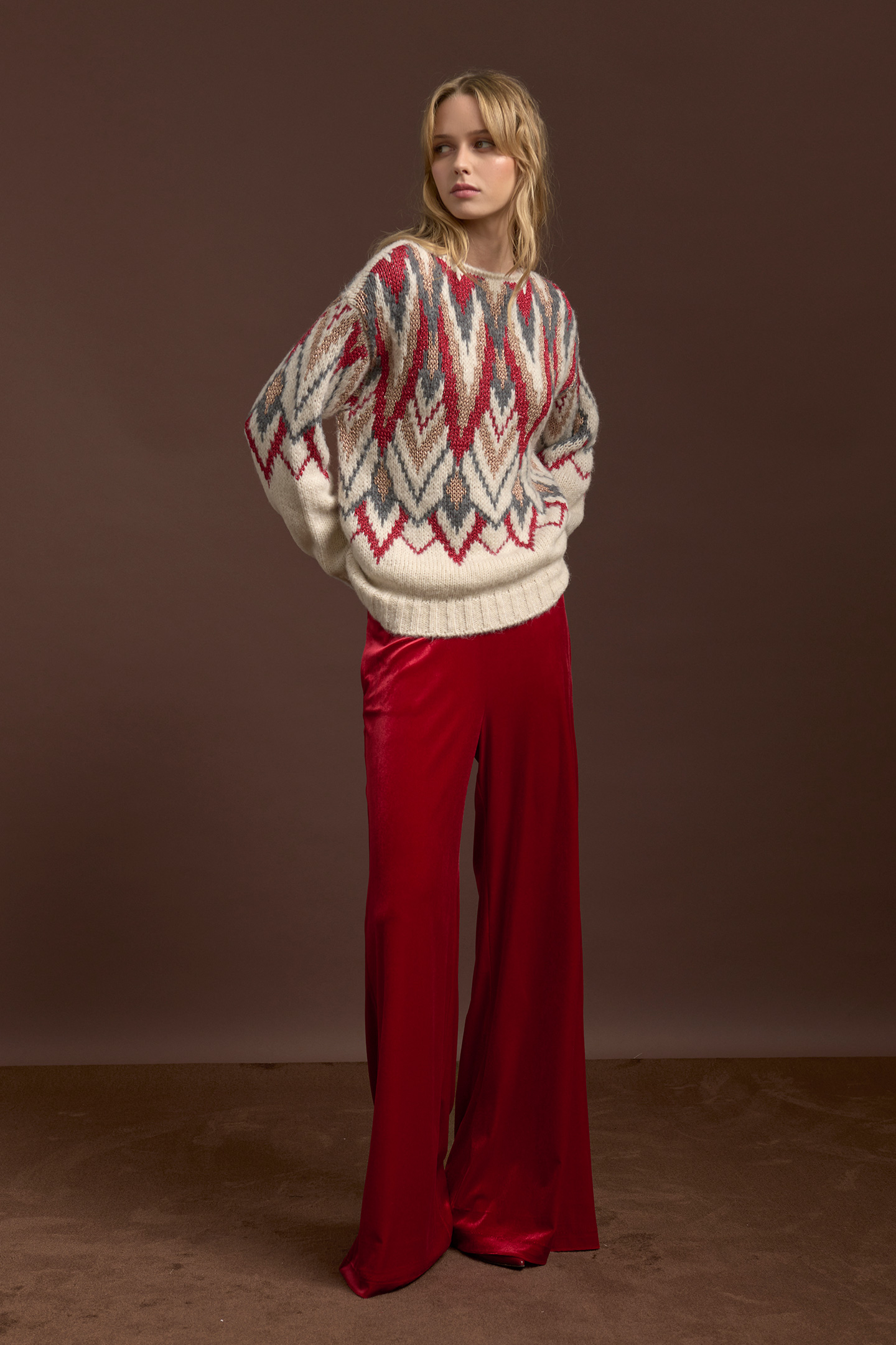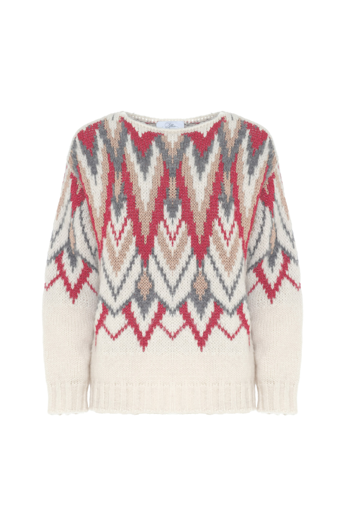 WOOL YARN PULLOVER FEATURING A MULTICOLOURED JACQUARD WEAVE WITH A ZIGZAG CHEVRON PATTERN. IT HAS A DELICATE LUREX THREAD AND A SOFT TEXTURE. RELAXED FIT AND DESIGN WITH BOAT NECK AND DROP SHOULDERS. A STATEMENT PIECE THAT ATTRACTS ATTENTION WHILE MAINTAINING A SOPHISTICATED ELEGANCE. THE MODEL IS 1.79 M TALL AND WEARS A SIZE S.