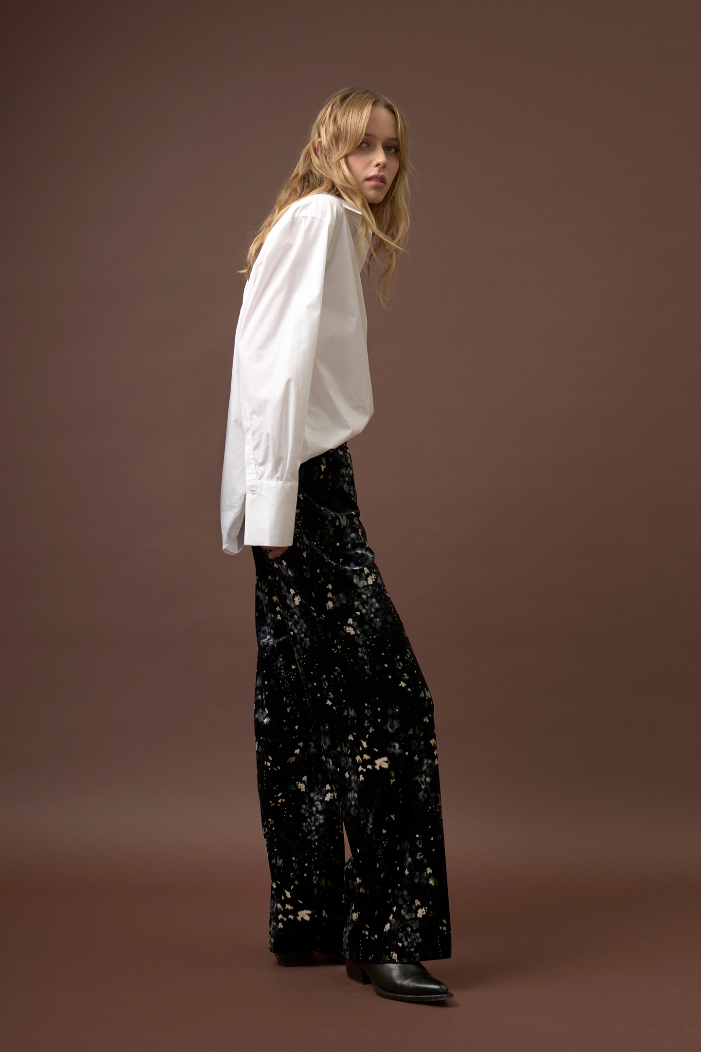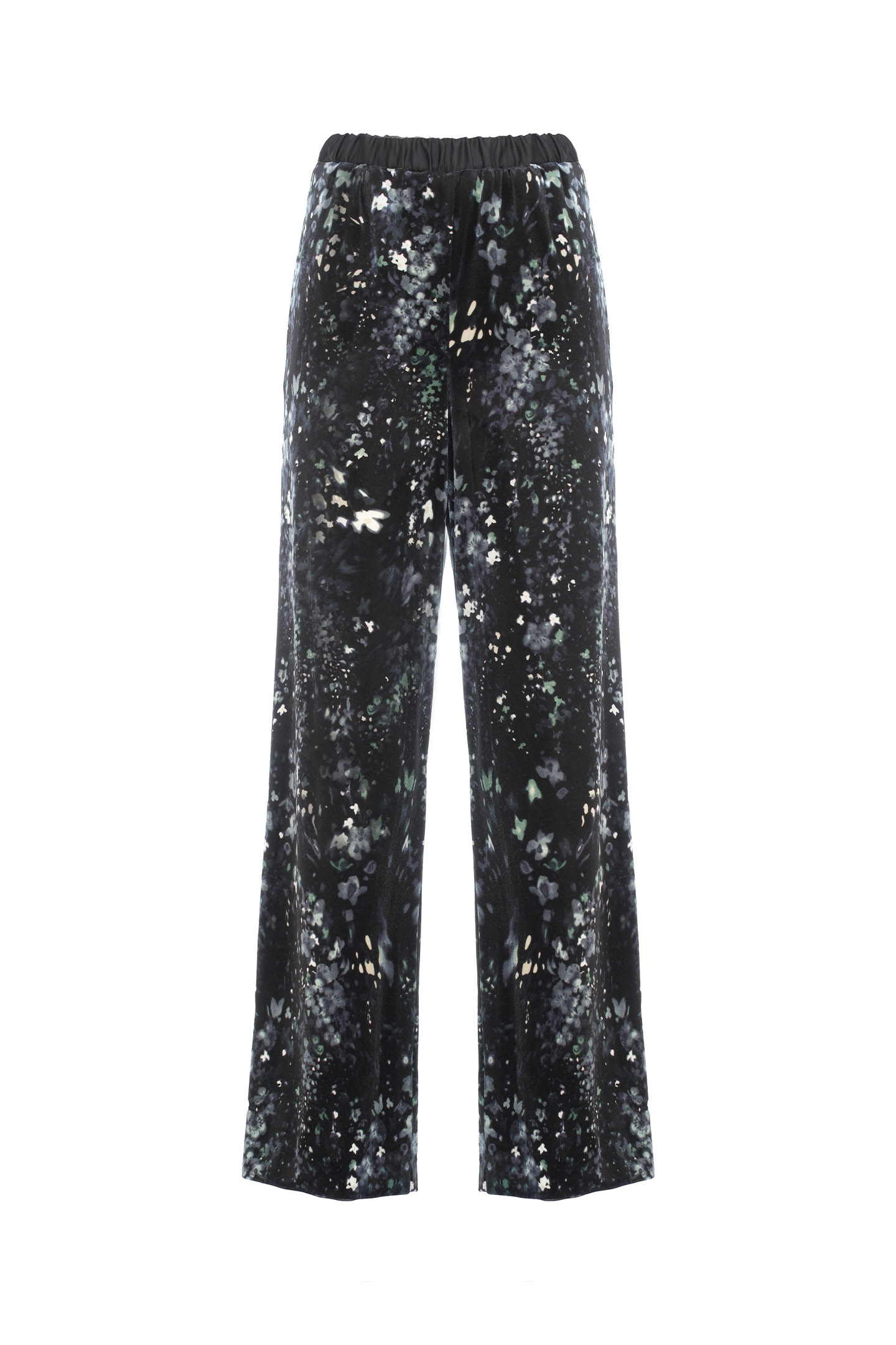 LOOSE VELVET TROUSERS WITH FLORAL PATTERN PRINT. MODEL WITH PALACE LEG AND ELASTICATED WAIST IN CONTRASTING SATIN. THE FRENCH SIDE POCKETS COMPLETE THE DESIGN, PROVIDING COMFORT AND REFINEMENT. A GARMENT WITH AN ELEGANT AND CONTEMPORARY ALLURE, PERFECT FOR A LOOK WITH A SOPHISTICATED IMPRINT. THE MODEL IS 1.79 M TALL AND WEARS A SIZE 42 IT.
