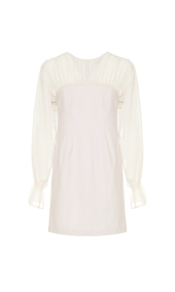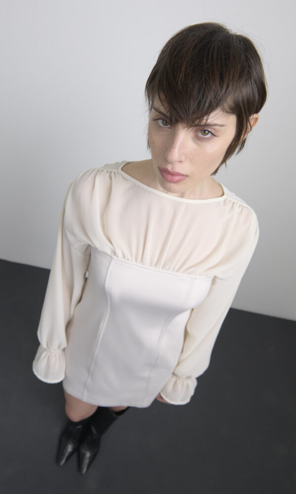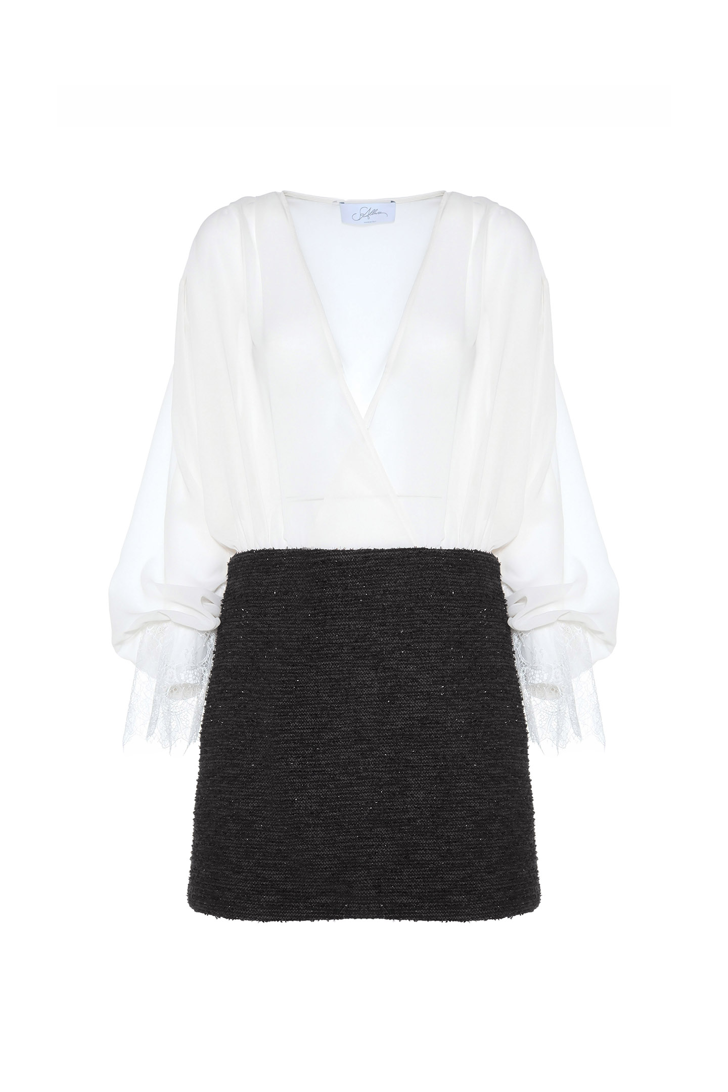 ASSEMBLED TWO-PIECE DRESS IN LIGHTWEIGHT CHIFFON AND BOUCLE FABRIC. FEATURES A LIGHTWEIGHT, SEMI-SHINE BLOUSE WITH A DEEP V-NECK AND LONG, WIDE SLEEVES FINISHED WITH LACE CUFFS. THE BOUCLE BOTTOM OFFERS A SHEATH FIT. IDEAL FOR SPECIAL OCCASIONS REQUIRING A REFINED AND ELEGANT STYLE.