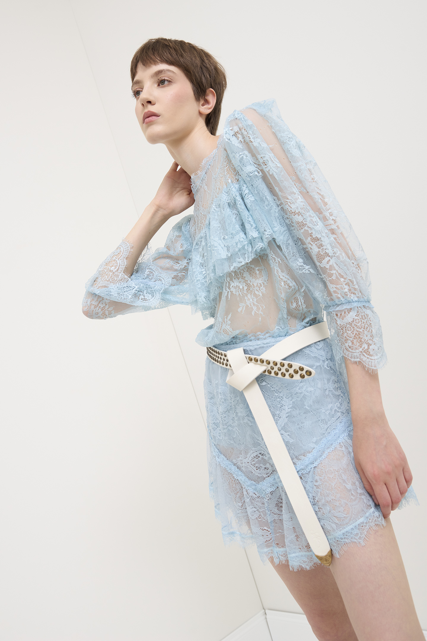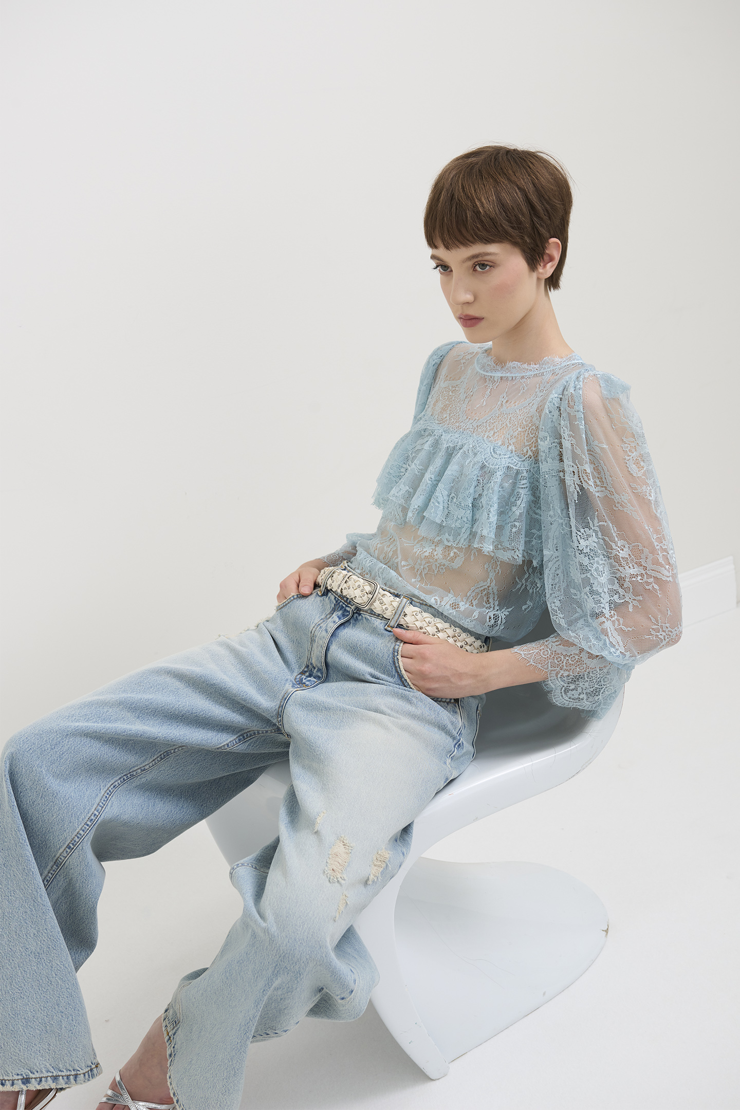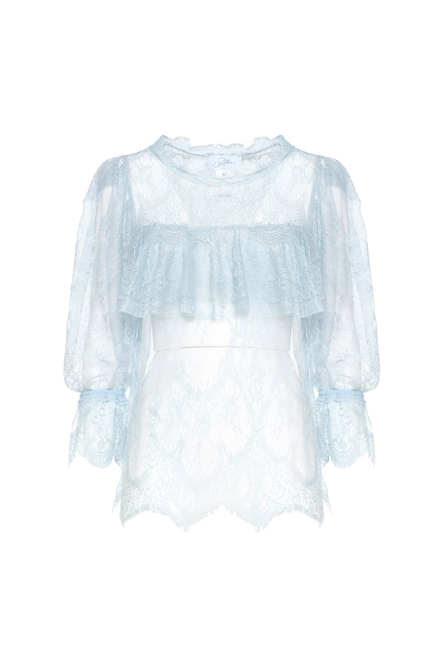 CREW NECK BLOUSE MADE OF SEMI-TRANSPARENT LACE. THE DESIGN IS ENRICHED BY RUFFLES ON THE DECOLLETE THAT PROVIDE MOVEMENT AND VOLUME. THE MODEL IS COMPLETED BY WIDE THREE-QUARTER SLEEVES WITH LIVE-CUT TRIM. AN IDEAL GARMENT FOR SPECIAL OCCASIONS OR SOPHISTICATED DAY LOOKS. THE MODEL IS 178 CM TALL AND WEARS A SIZE 42 IT.