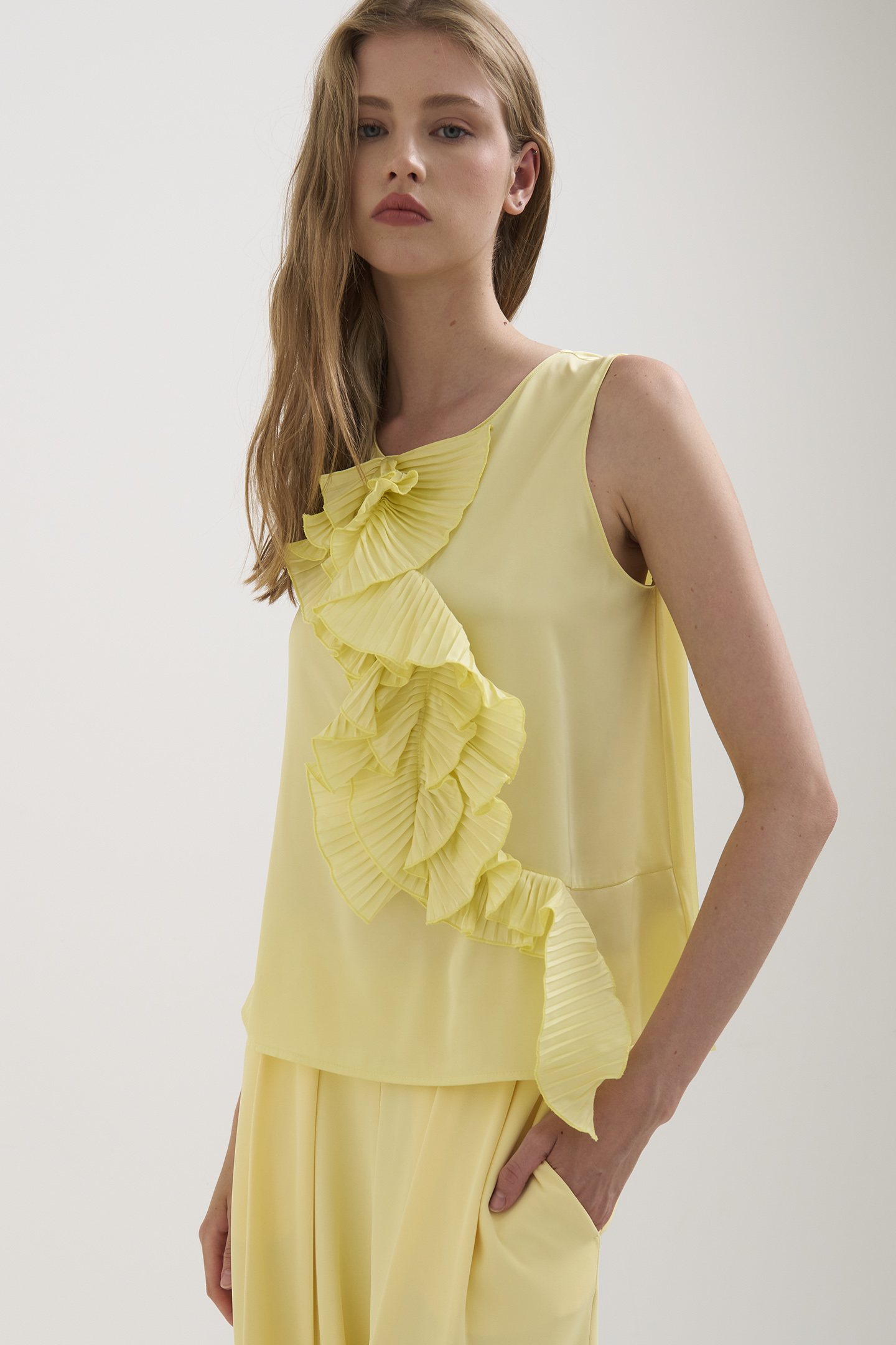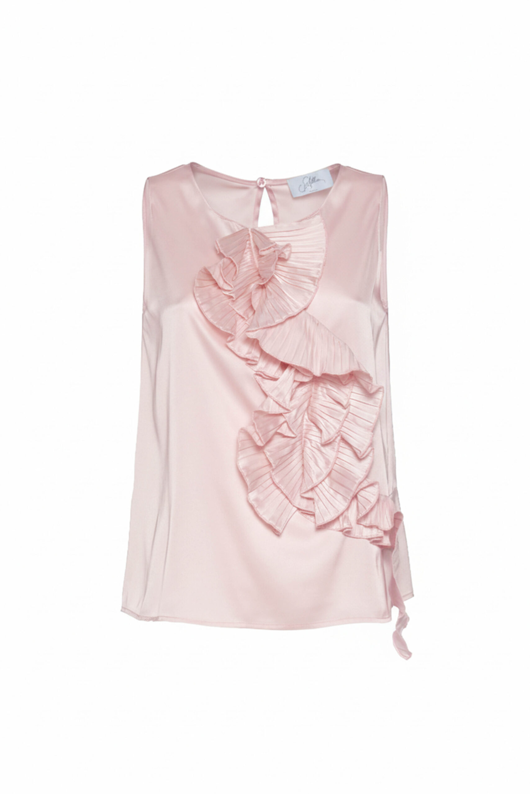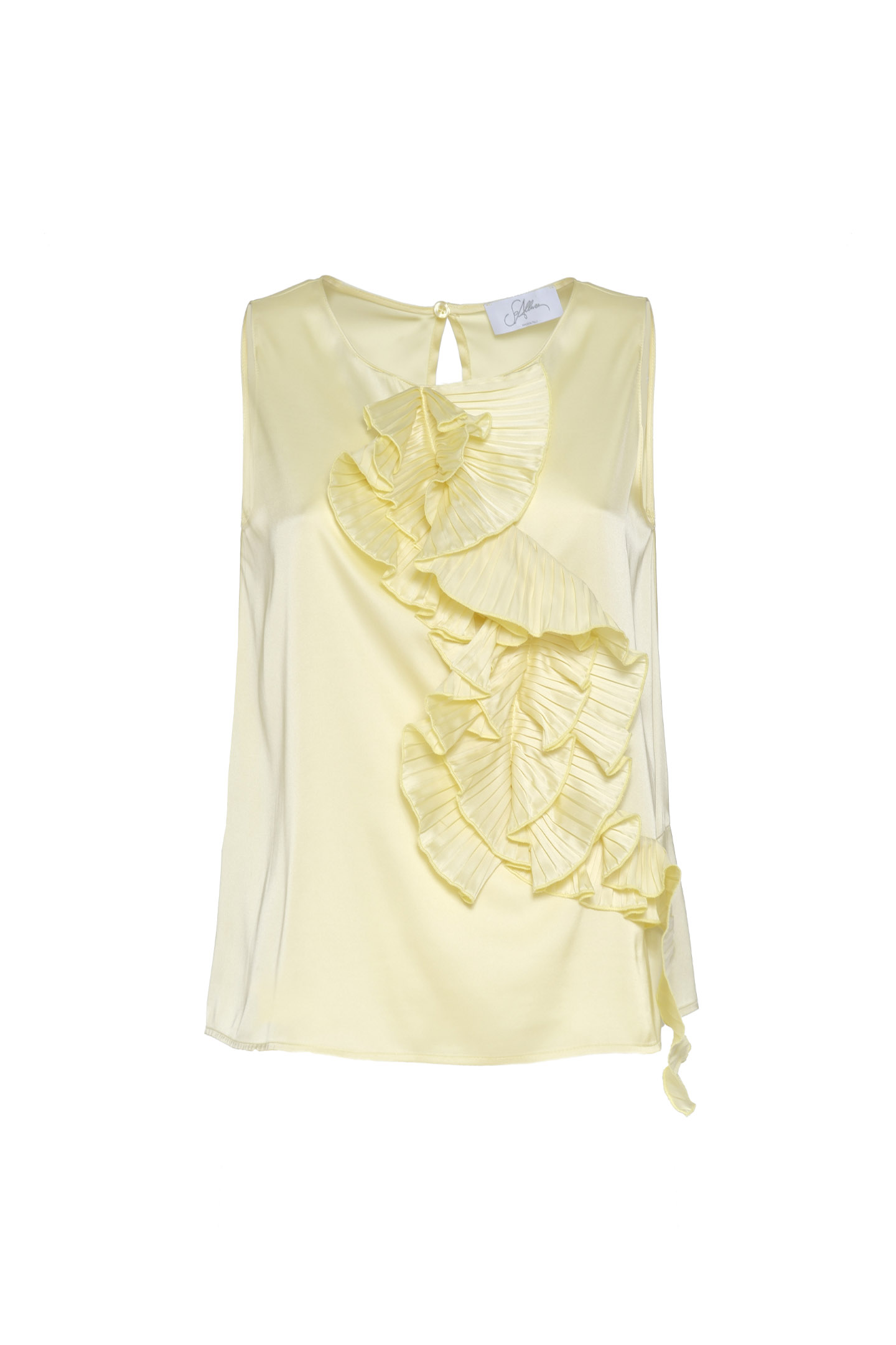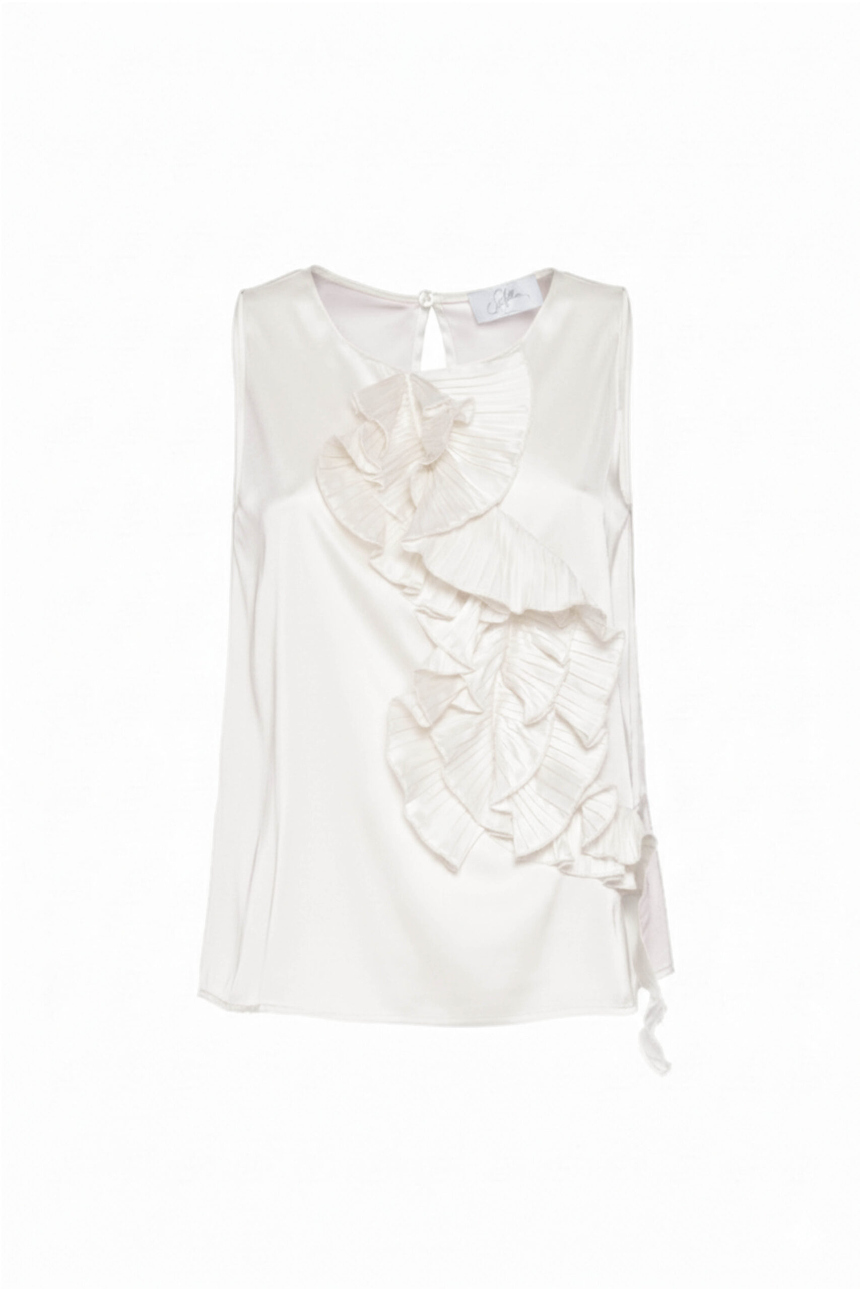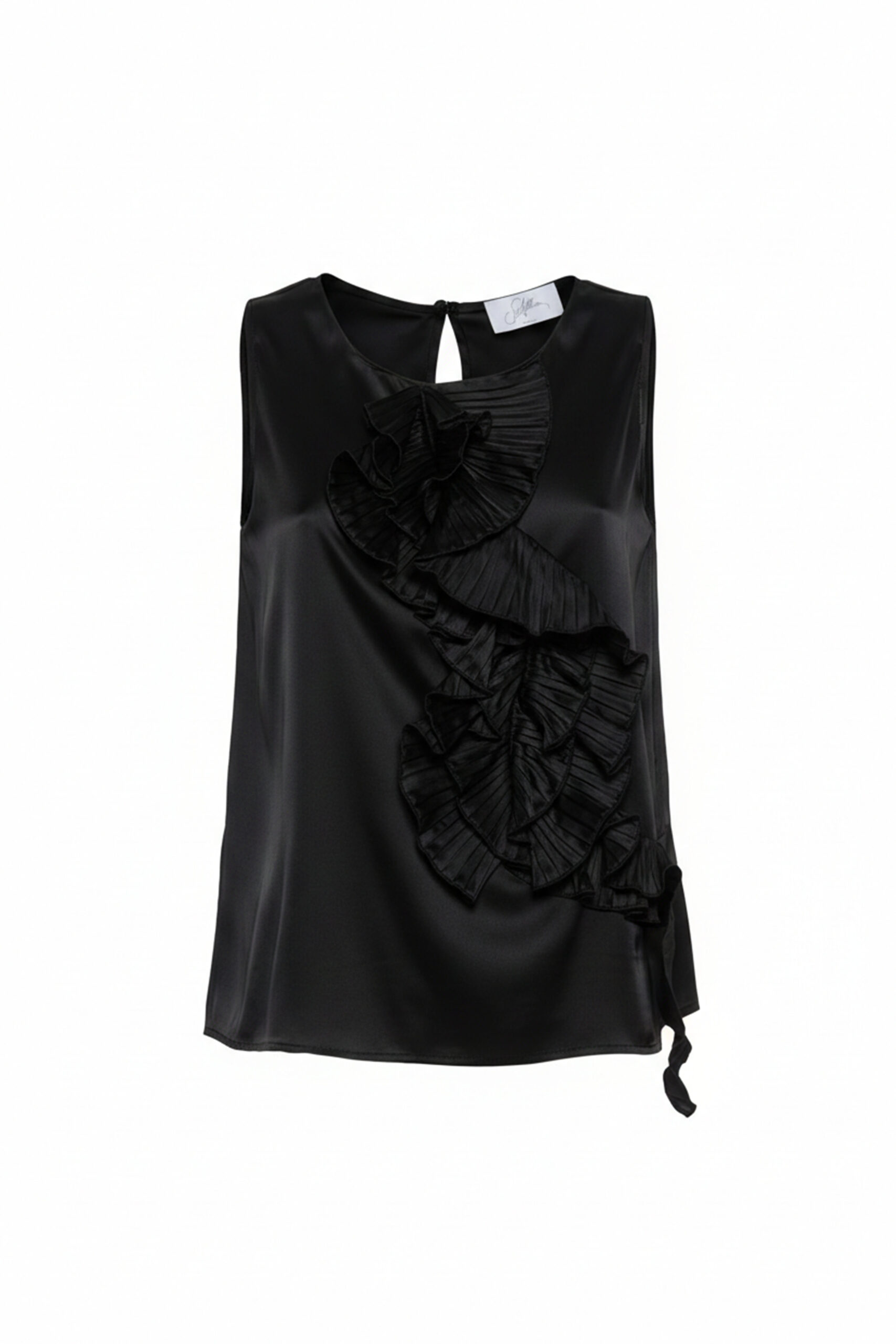 GLOSSY FABRIC BLOUSE WITH ROUND NECKLINE AND TEARDROP OPENING AT THE BACK. THE DESIGN IS ENRICHED BY A PLISSÉ FLOUNCE THAT DESCENDS DIAGONALLY TO THE FRONT, GIVING MOVEMENT AND A FEMININE TOUCH. THE FLUID AND SILKY FABRIC MAKES IT PERFECT FOR ELEGANT AND FORMAL LOOKS. THE MODEL IS 1.78 M TALL AND WEARS A SIZE 42 IT.