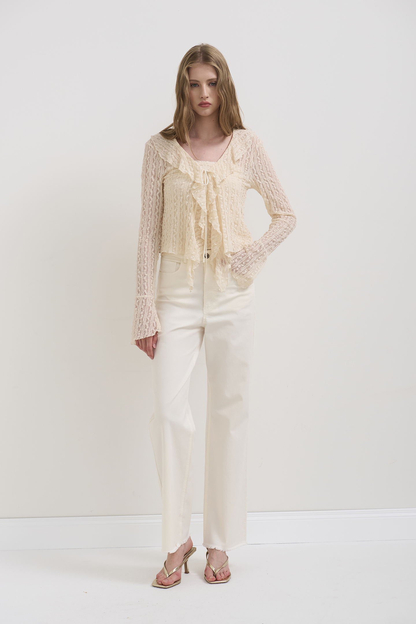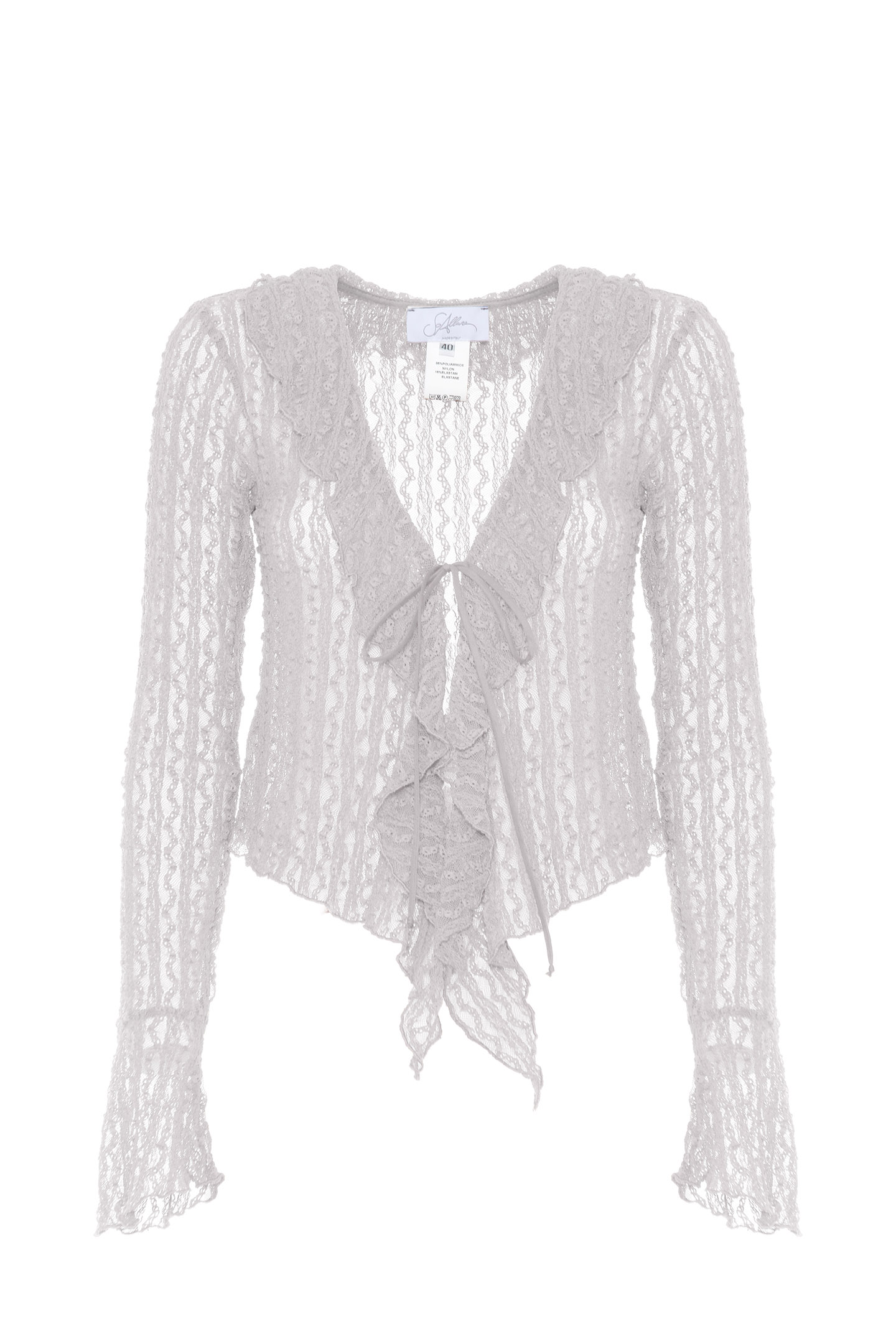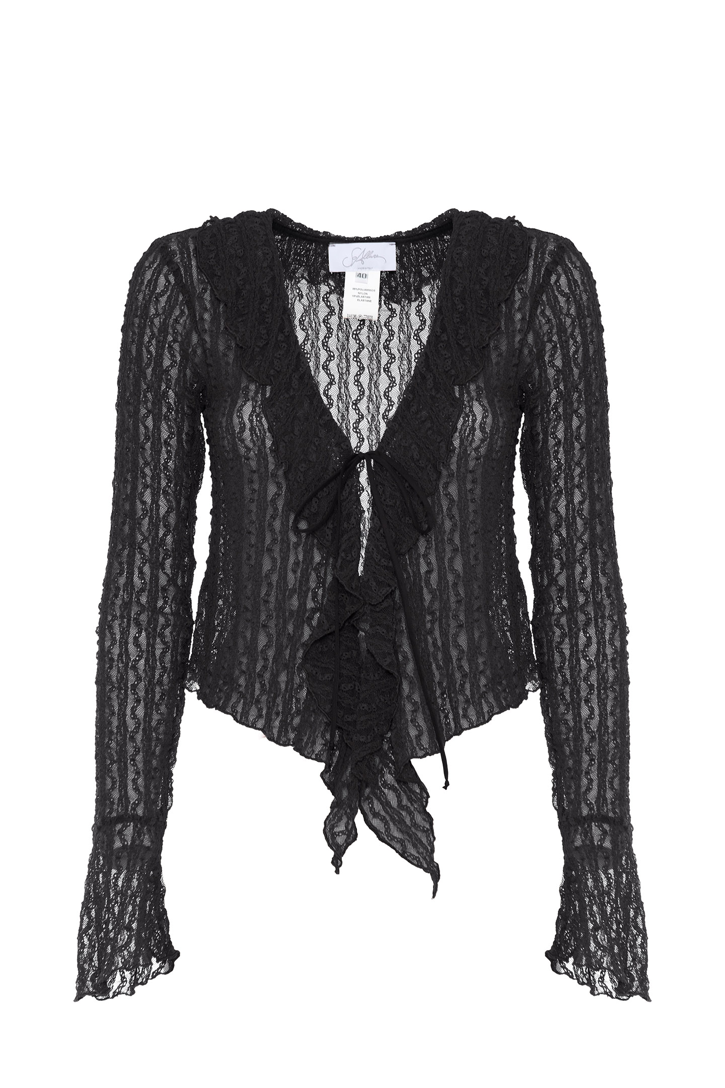 STRETCH FABRIC BLOUSE WITH VERTICAL PATTERN WORK. DESIGN FEATURING A FRONT OPENING AND RUFFLES THAT EXTEND ALONG THE ENTIRE NECKLINE. FEATURING THIN LACES AND LONG, FITTED SLEEVES FINISHED WITH FLARED CUFFS. THE MODEL IS 178 CM TALL AND WEARS A SIZE 42 IT.