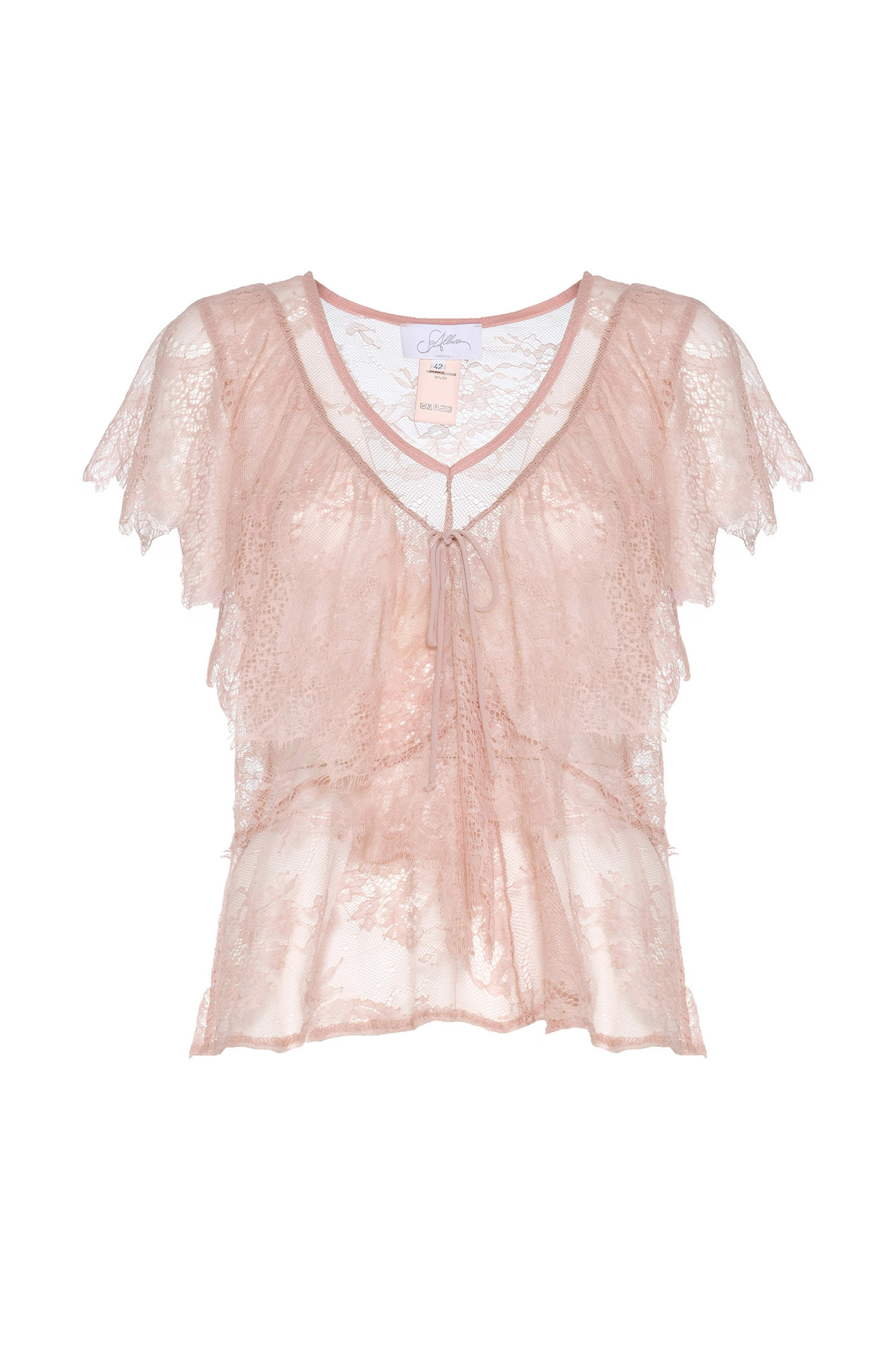 SEMI-TRANSPARENT LACE BLOUSE WITH DEEP V-NECK FINISHED WITH A THIN LACE-UP AT THE FRONT. THE DESIGN IS CHARACTERISED BY LARGE LAYERED RUFFLES THAT ADD MOVEMENT TO THE SILHOUETTE. SHORT-SLEEVED MODEL WITH RAW-CUT SCALLOPED EDGES. SOFT AND FLOWING LINE IDEAL FOR A CASUAL-CHIC LOOK. THE MODEL IS 1.78 M TALL AND WEARS A SIZE S.