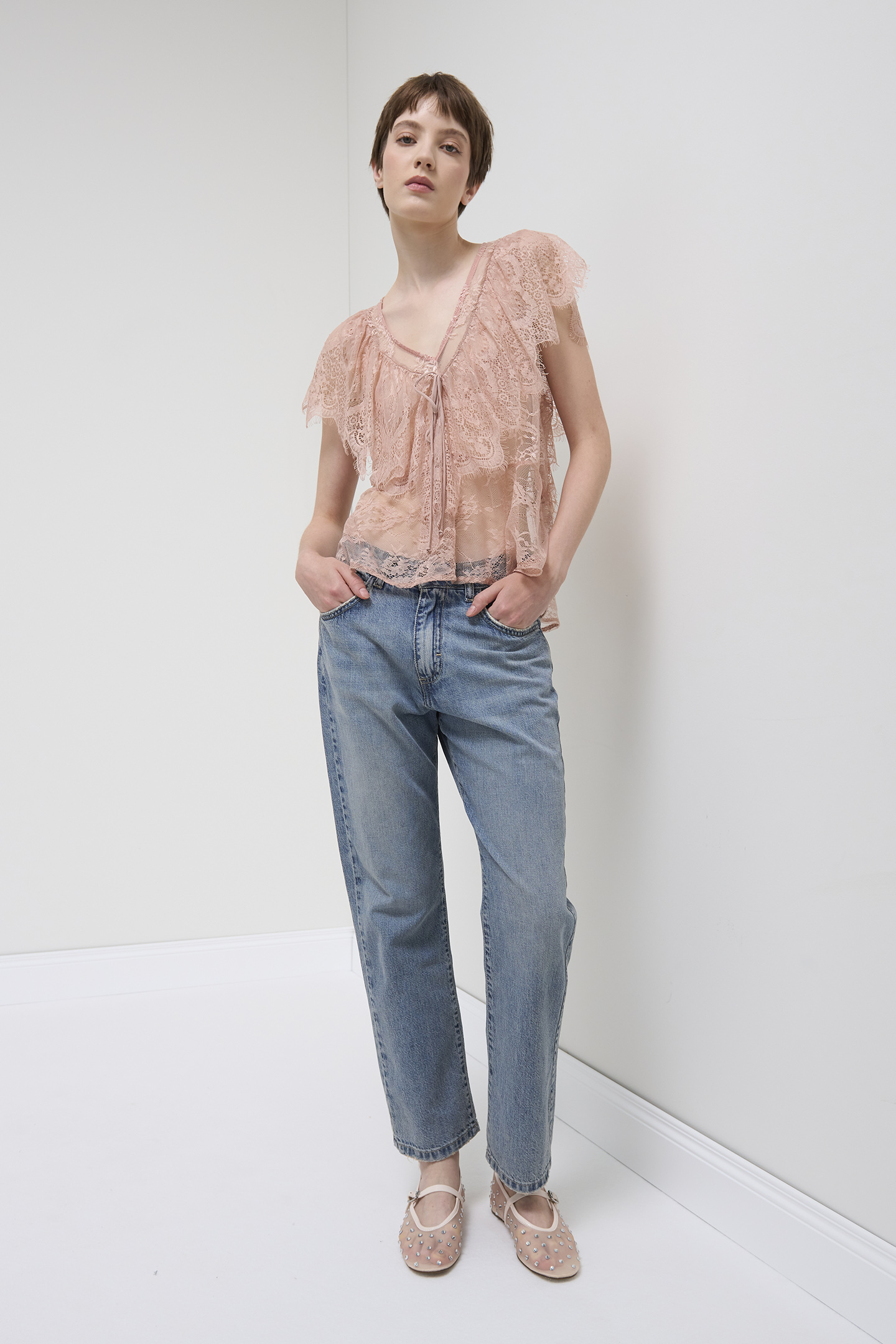 SEMI-TRANSPARENT LACE BLOUSE WITH DEEP V-NECK FINISHED WITH A THIN LACE-UP AT THE FRONT.