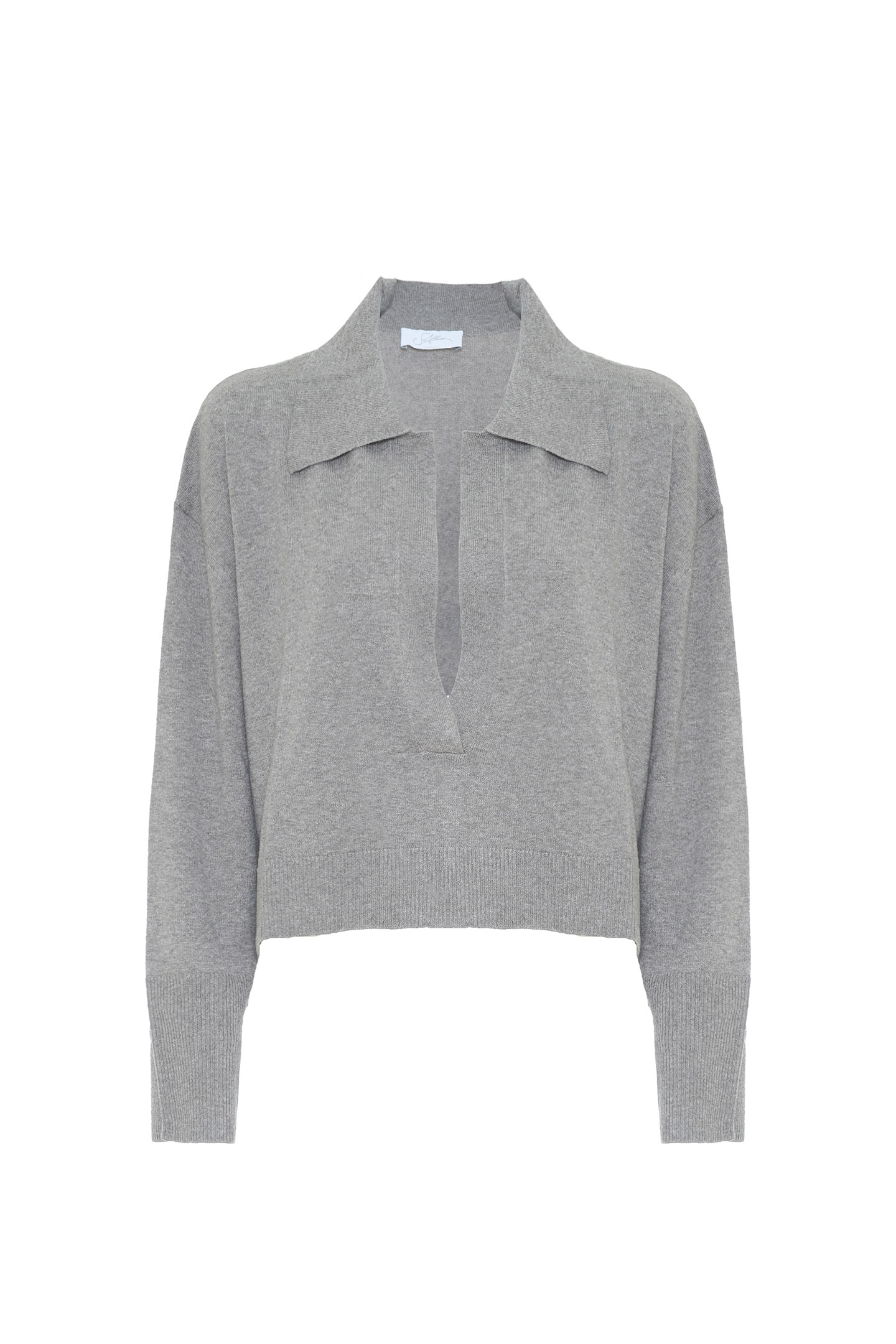 WOOL BLEND JERSEY SWEATER WITH V-NECK AND POLO COLLAR, FEATURING A SIMPLE DESIGN. IT HAS A LOOSE FIT WITH LONG SLEEVES AND RIBBED TRIM. THE BOXY FIT AND SLIGHTLY CROPPED CUT MAKE IT A CONTEMPORARY AND VERSATILE PIECE. IDEAL FOR WEARING WITH THE KNITTED SKIRT.