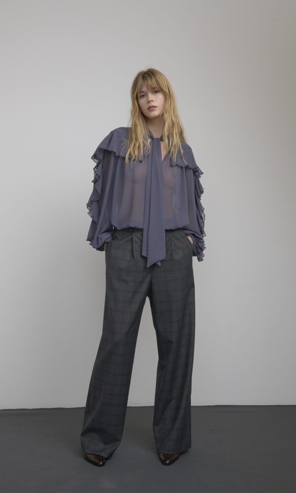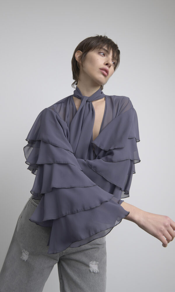 LIGHTWEIGHT SEMI-TRANSPARENT CHIFFON BLOUSE. FEATURING LONG, WIDE SLEEVES FINISHED WITH SLIM CUFFS AND A DEEP V-NECK AT THE FRONT. THE RUFFLED COLLAR IS COMPLETED BY DELICATE ADJUSTABLE TIES ALONG THE ENTIRE NECKLINE. WIDE AND COMFORTABLE FIT. IDEAL FOR SOPHISTICATED LOOKS FOR OCCASIONS WHEN YOU WANT TO WEAR A DISTINCTIVE PIECE WITH CHARACTER.