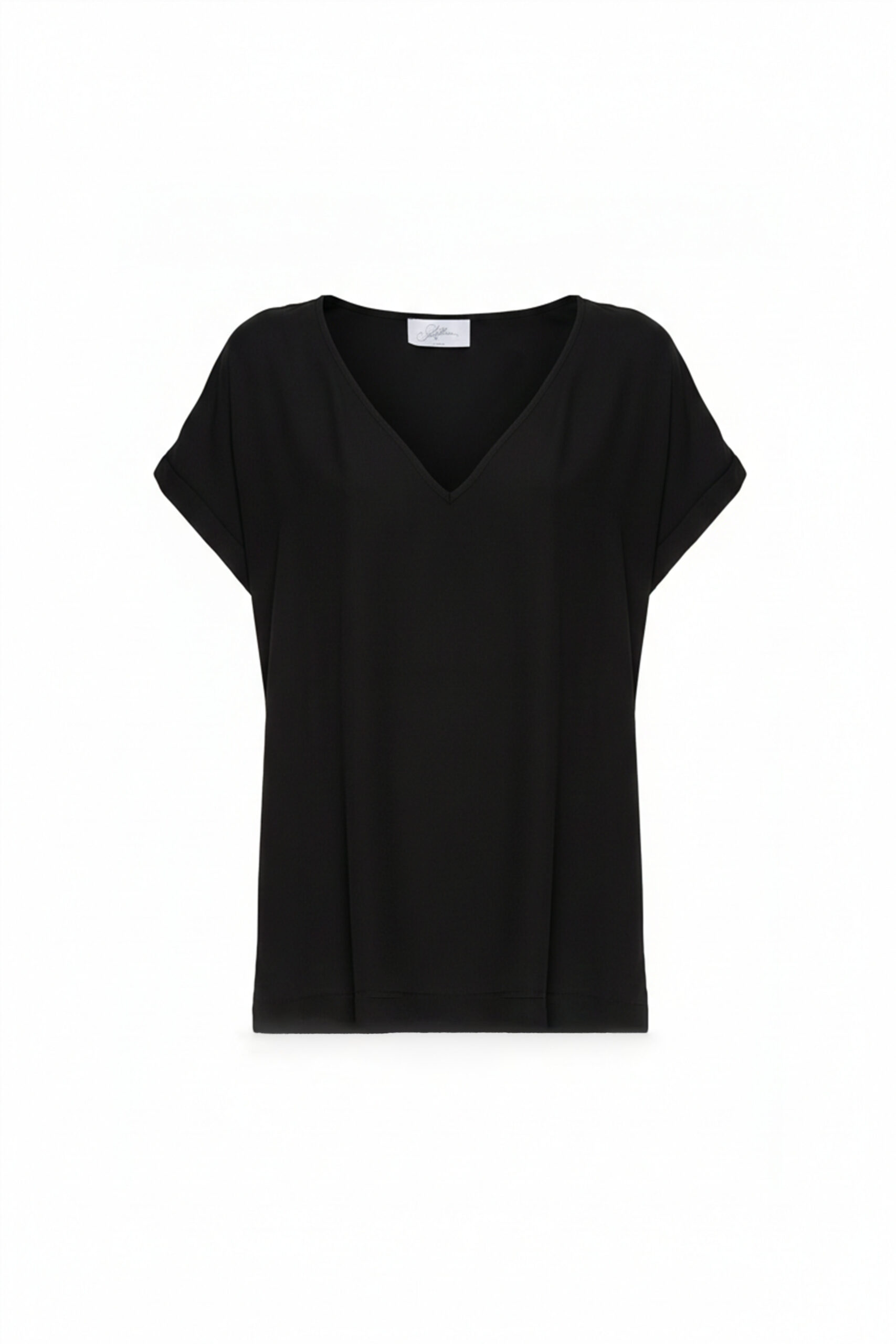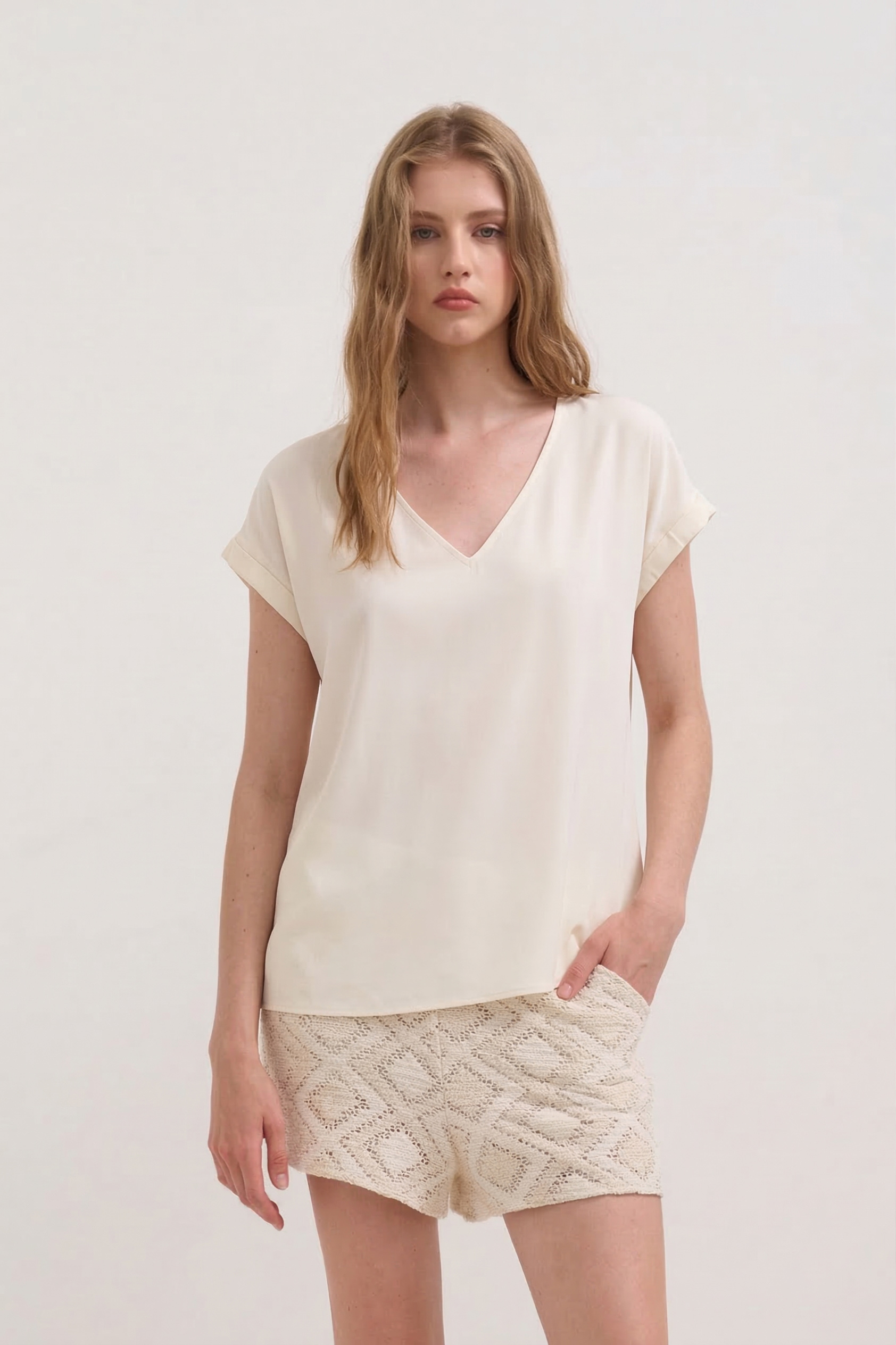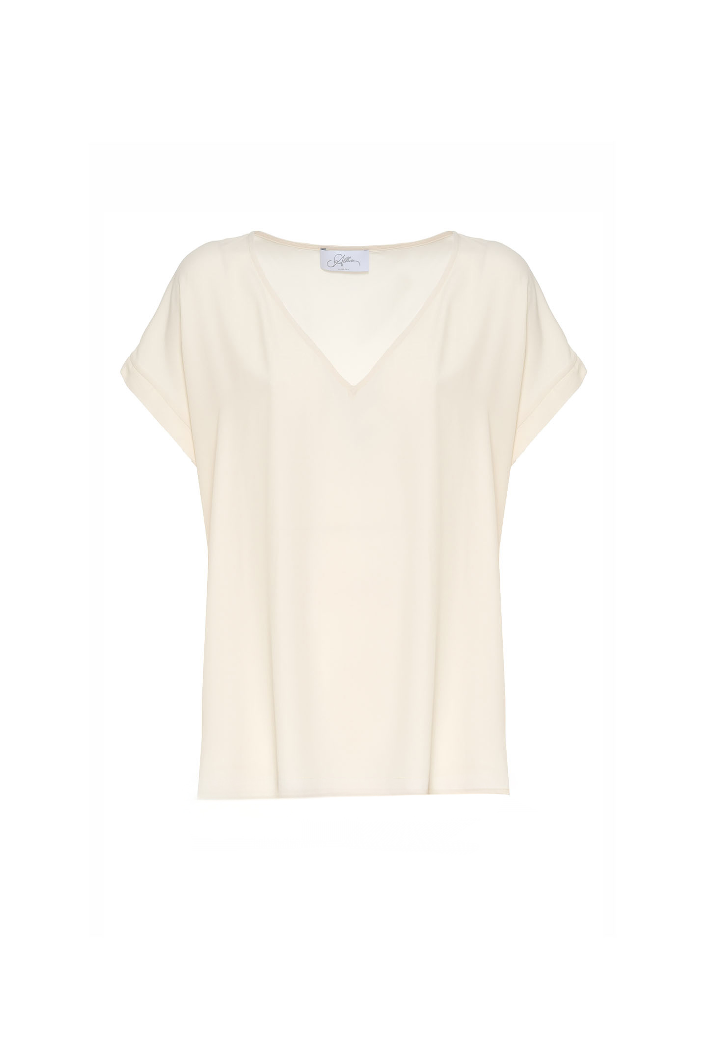 A LOOSE, OVERSIZED BLOUSE MADE FROM A LIGHTWEIGHT, FLOWING SILK BLEND. IT FEATURES A DEEP V-NECK AT THE FRONT AND SHORT CAP SLEEVES. A STRAIGHT, MINIMAL FIT, IDEAL FOR INFORMAL AND PRACTICAL DAYTIME LOOKS OR AS A JACKET FOR BUSINESS LOOKS. THE MODEL IS 178 CM TALL AND WEARS A SIZE 42.