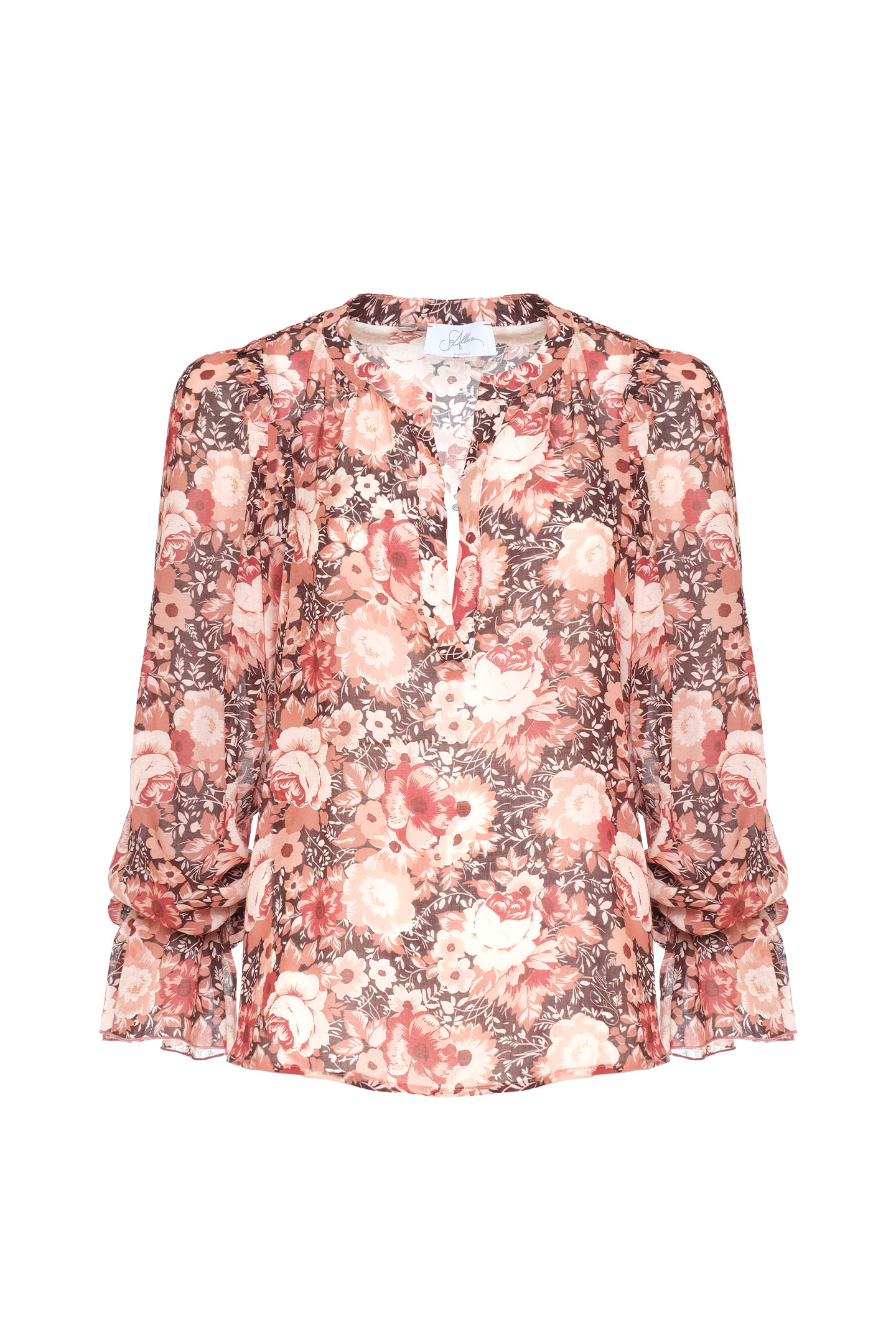 FLOWING VISCOSE BLOUSE WITH RUFFLE DETAILS AND FLORAL PATTERN. MODEL WITH CLASSIC KOREAN NECK AND A DEEP V-NECK. THE WIDE SLEEVES FINISHED WITH WRIST CURLS CREATE A REFINED ROMANTIC EFFECT. DESIGN EMBELLISHED WITH ROMANTIC RUFFLES APPLIED TO THE SHOULDERS, ACCENTUATING ITS FLUID AND FLARED LINE. THE MODEL IS 1.78 M TALL AND WEARS A SIZE 42 IT.