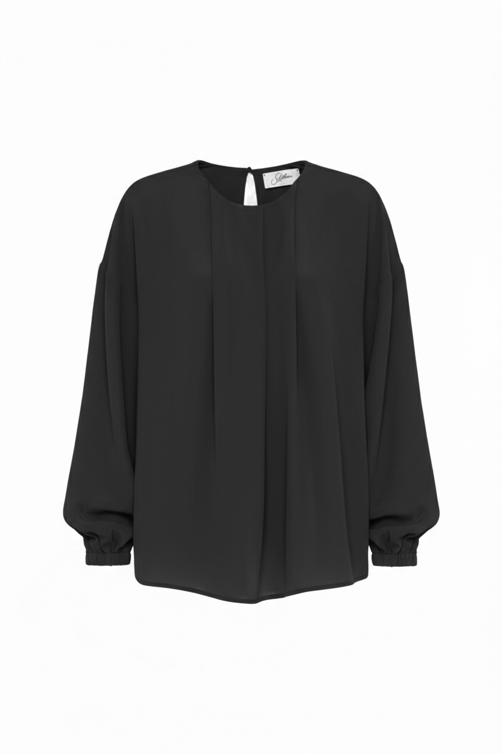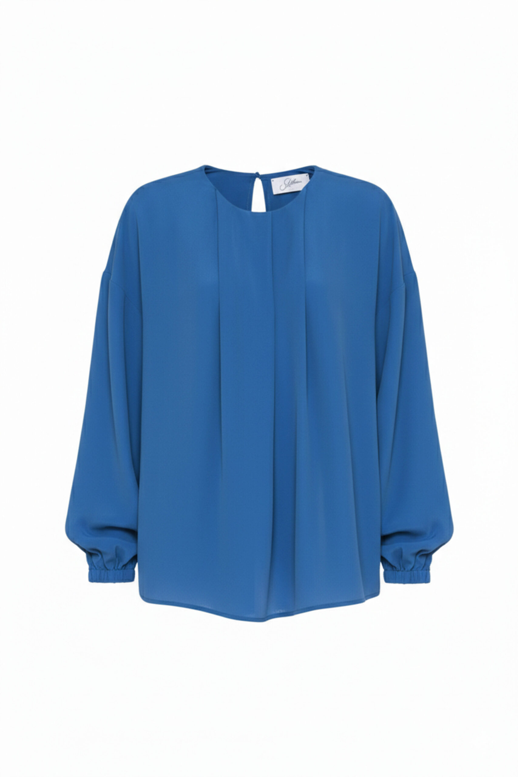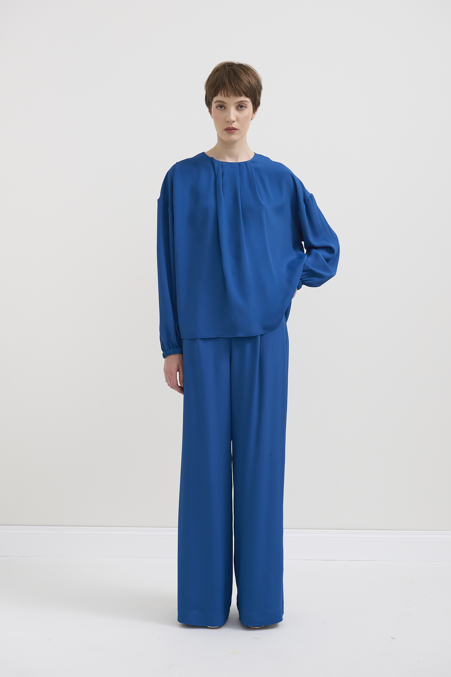 A SOFT, FEMININE BLOUSE, MADE FROM A LIGHTWEIGHT, SILKY-FEEL FABRIC. THE DESIGN FEATURES A DRAPED PATTERN ON THE ROUND NECKLINE AND A KEY-SHAPED DETAIL WITH A BUTTON CLOSURE AT THE BACK. THE LONG SLEEVES ARE SLIGHTLY FULLY FITTED AND Gathered at the wrists WITH ELASTIC CUFFS FOR A FLUFFY, AIRY EFFECT. A PERFECT PIECE FOR OFFICE LOOKS OR SPECIAL OCCASIONS. THE MODEL IS 1.78 M TALL AND WEARS A SIZE 42.