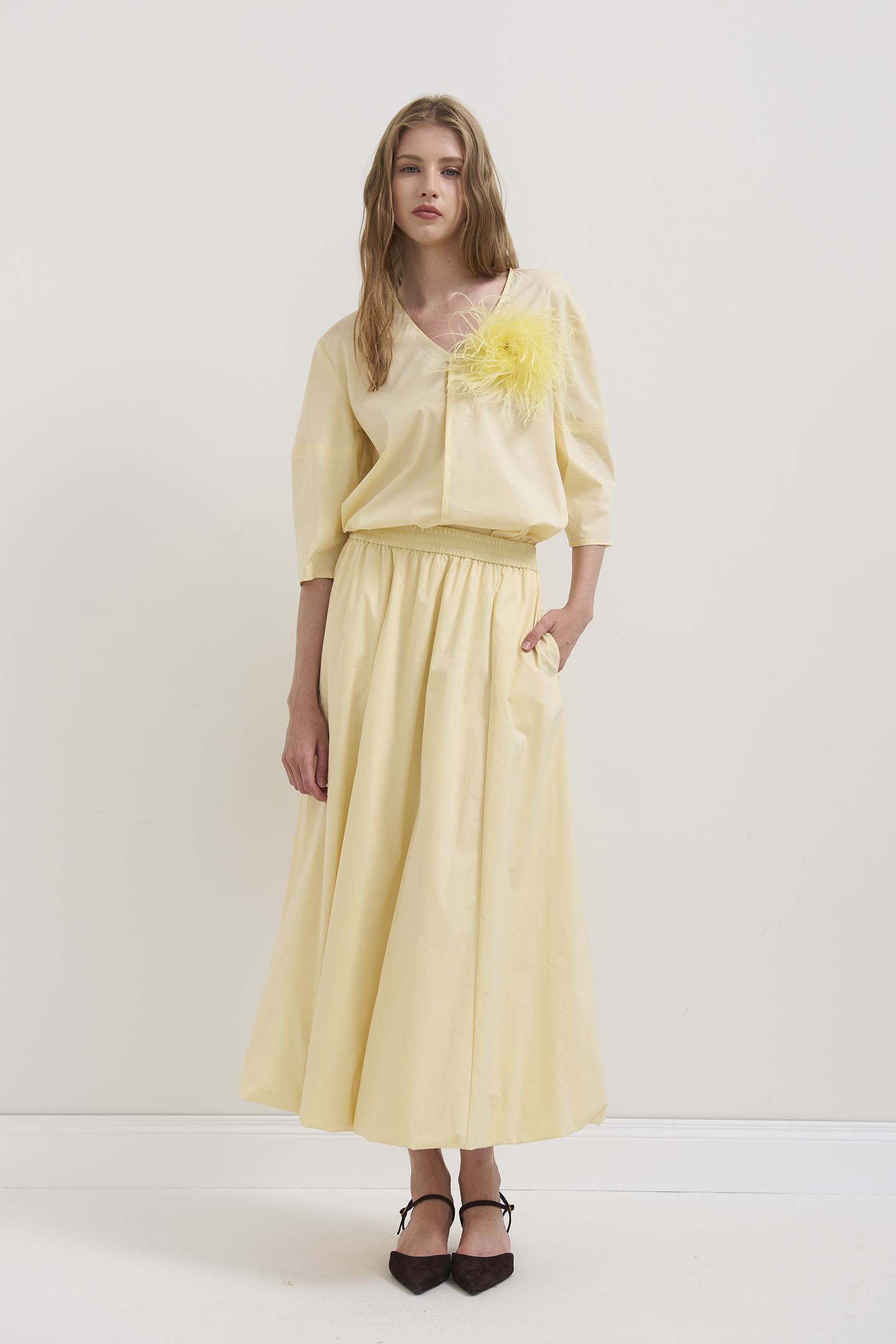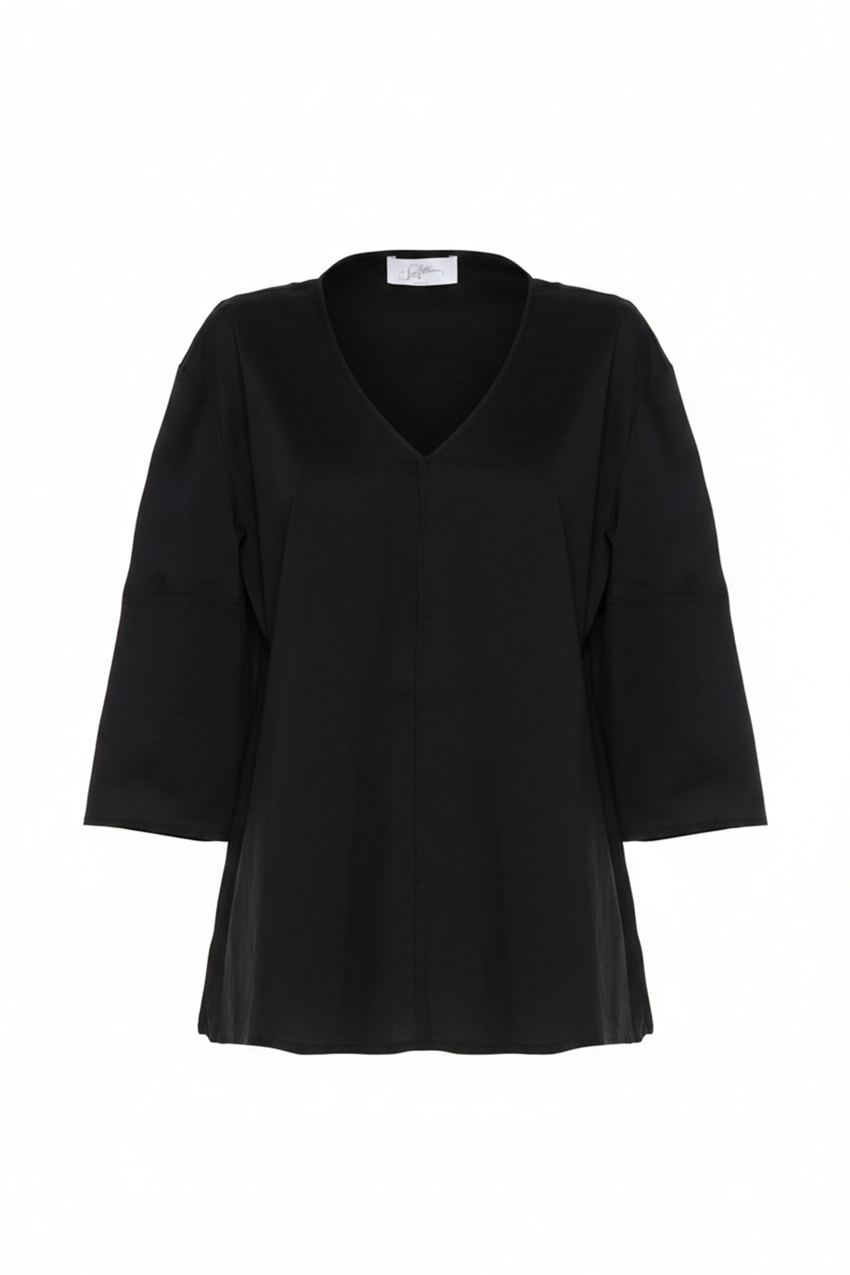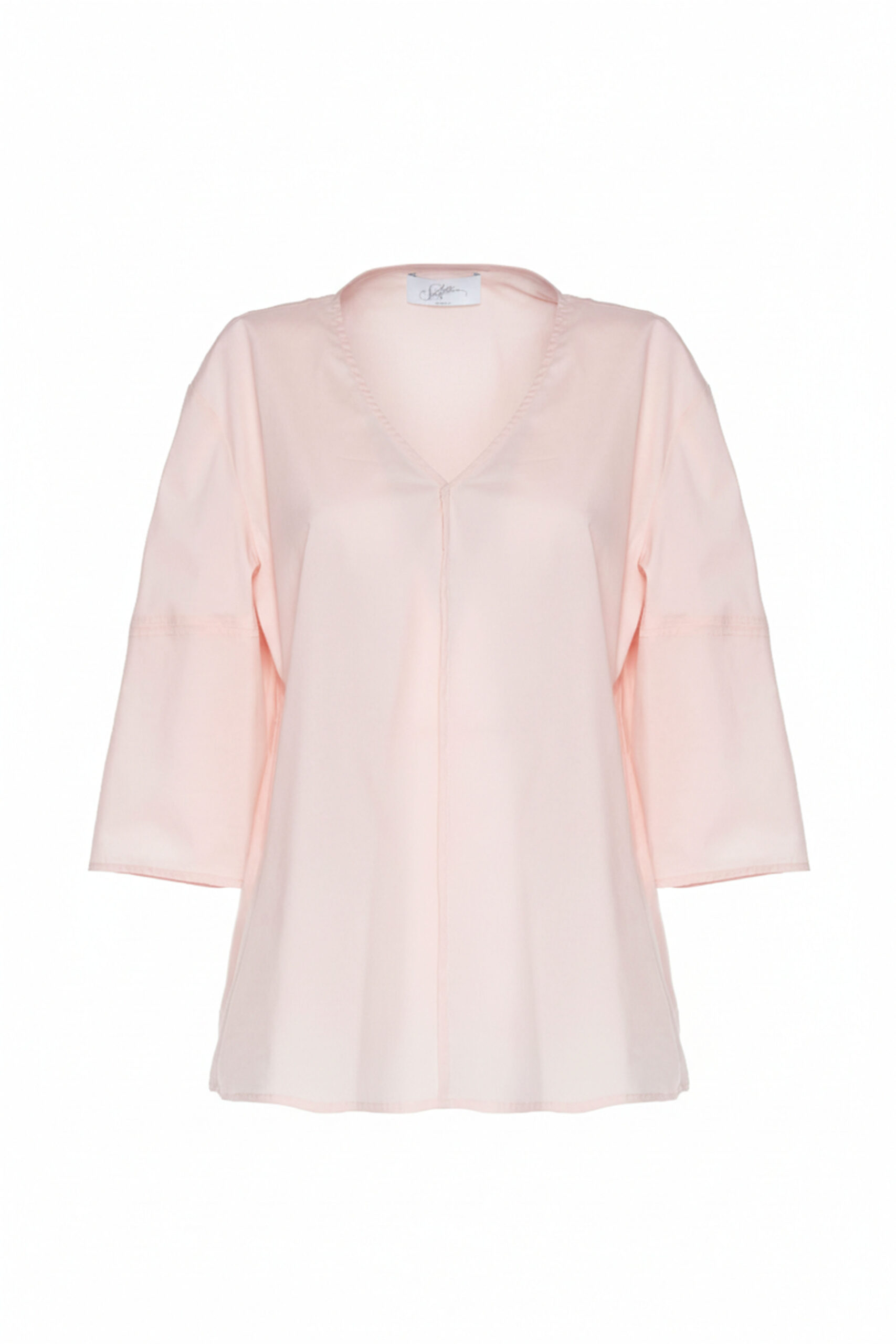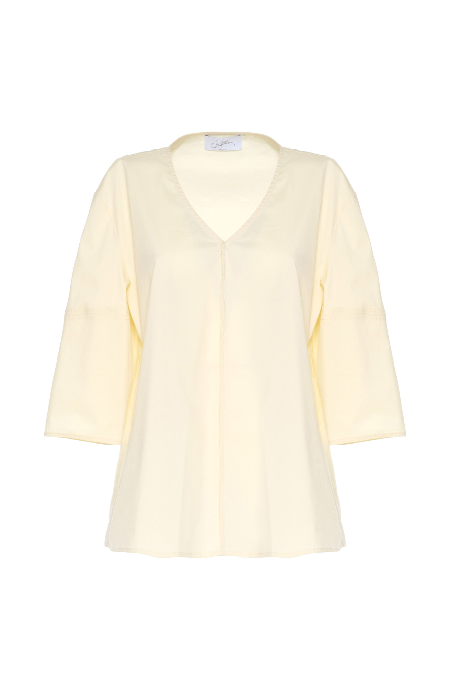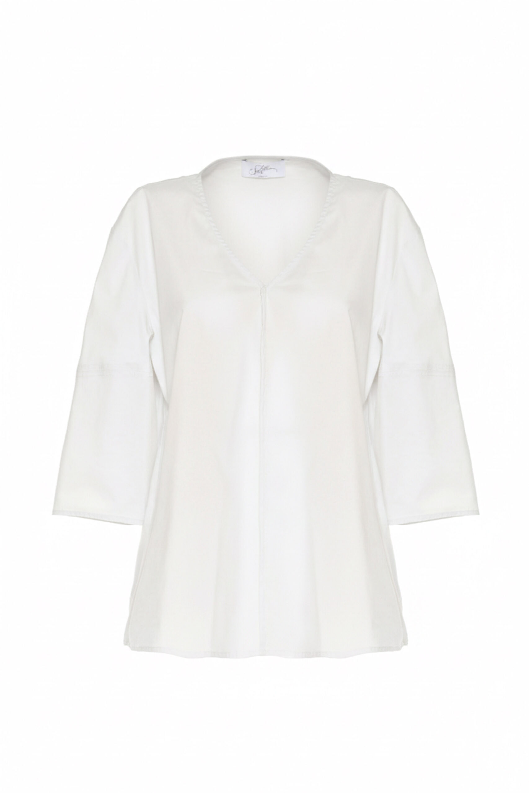 SHIRT MADE OF LIGHTWEIGHT TECHNICAL STRETCH COTTON. THE MINIMAL CUT AND STRAIGHT LINE MAKE IT PERFECT FOR CASUAL OR MORE STRUCTURED LOOKS. IT FEATURES A V-NECK WITH A CENTER SEAM THAT ADDS A SOPHISTICATED AND DISCREET DETAIL. THE THREE-QUARTER SLEEVES ARE SLIGHTLY FLARED FOR A SOFT AND AIRY EFFECT. THE MODEL IS 1.78 M TALL AND WEARS A SIZE 42.