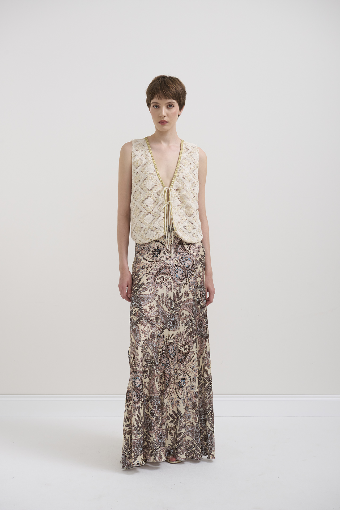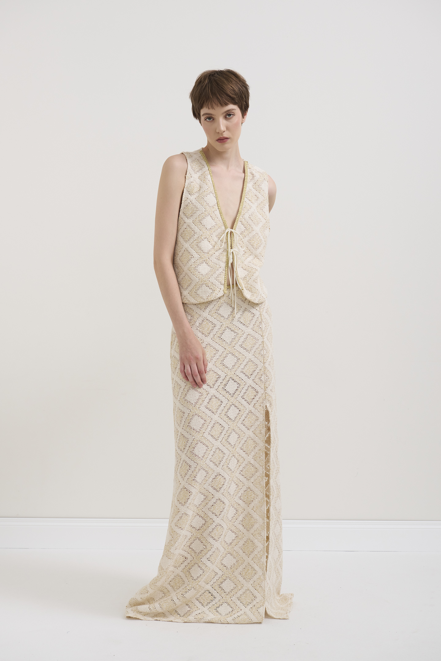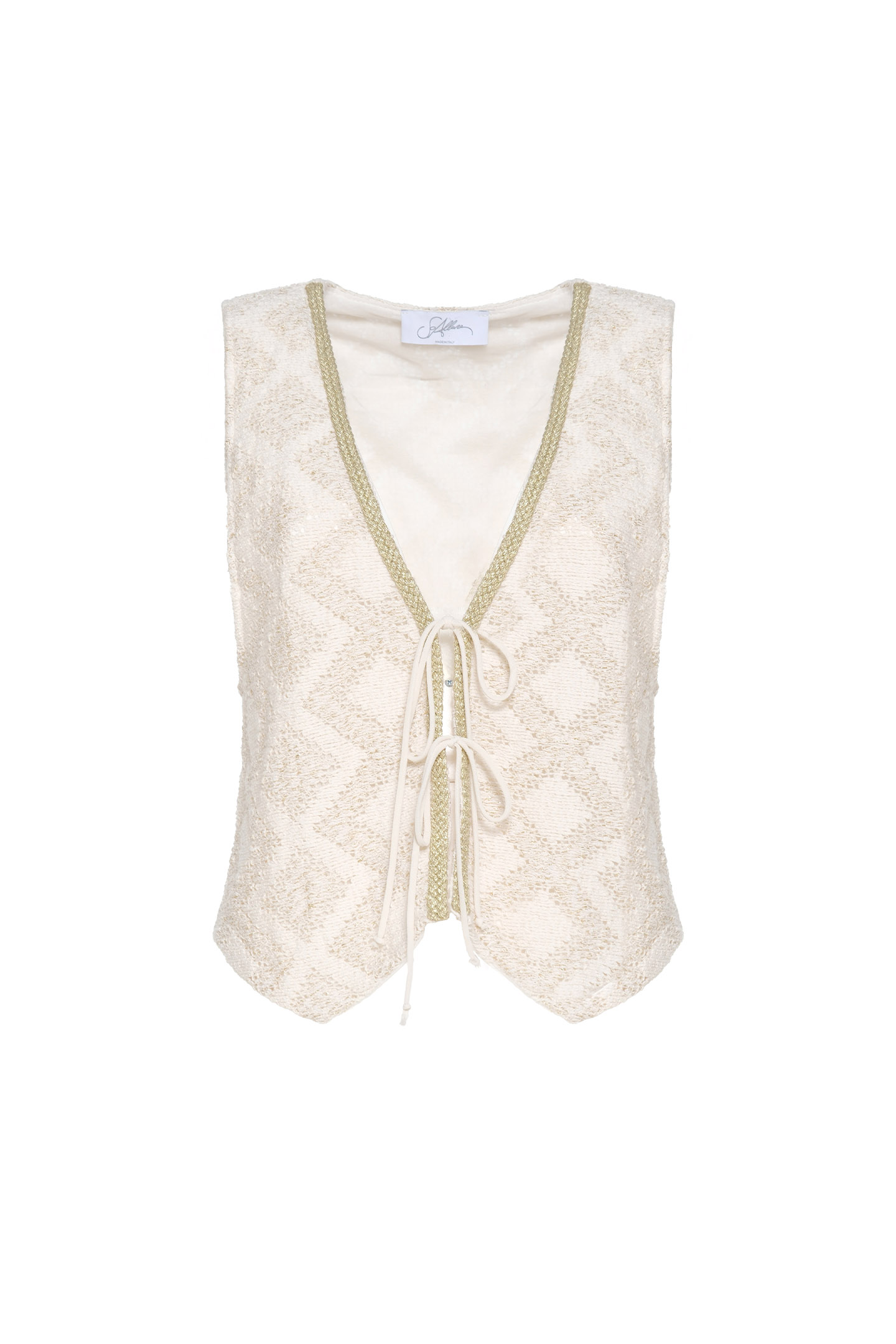 SLEEVED VEST MADE OF JACQUARD FABRIC WITH A GEOMETRIC RHOMBUS PATTERN. V-NECK DESIGN, EMBELLISHED ALONG THE INNER EDGE WITH GOLD-TONE TRIMMINGS. FRONT CLOSURE IS ADJUSTABLE BY THIN TONE LACES THAT ADD A FEMININE AND CHIC DETAIL. FEATURING A STRAIGHT CUT AND WAIST LENGTH, IDEAL FOR SUMMER BOHO-CHIC LOOKS. THE MODEL IS 1.78 M TALL AND WEARS A SIZE 42 IT.