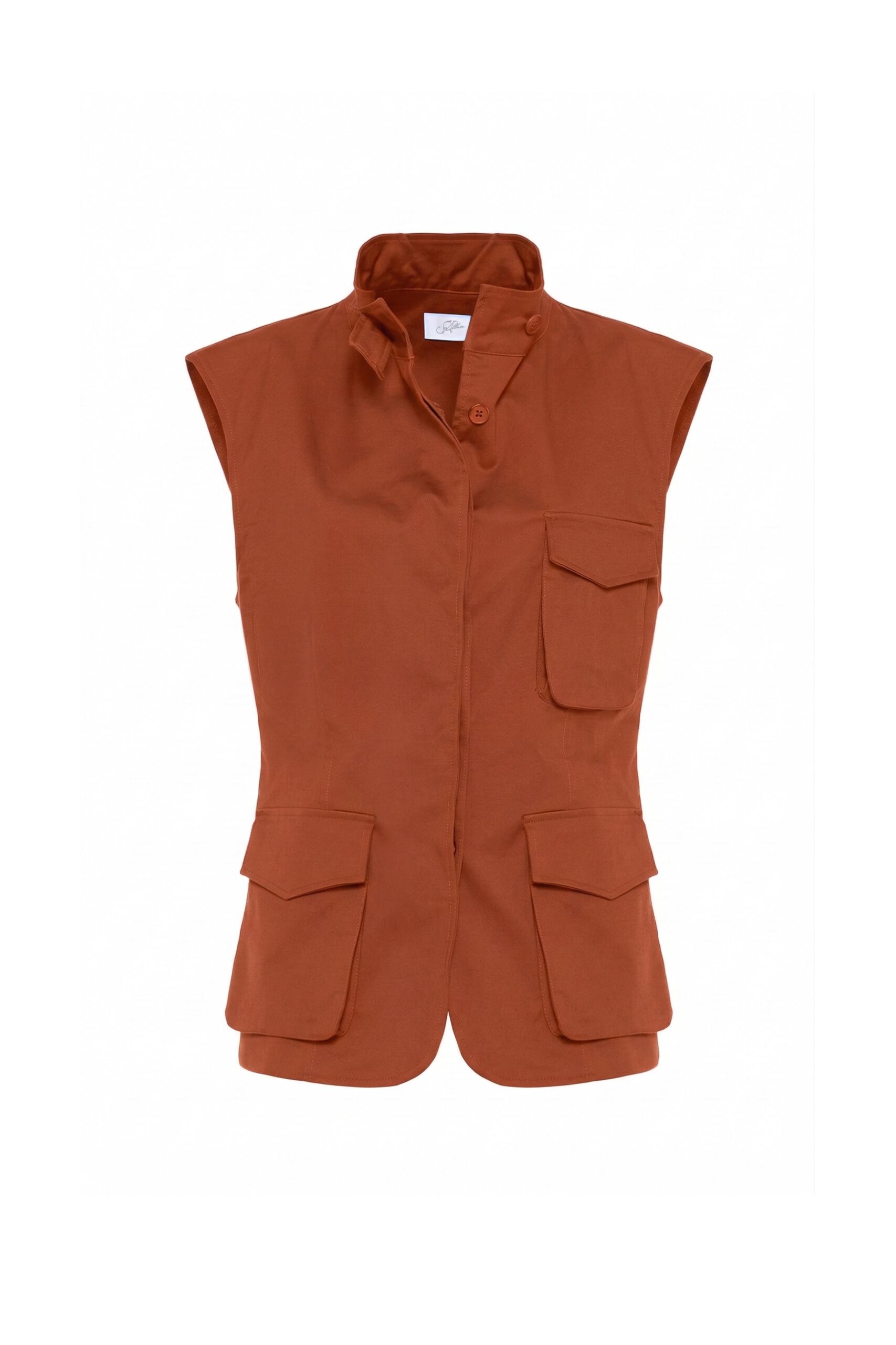 UTILITY STYLE VEST IN COTTON TWILL. THE KEY LEADER TO CREATE LAYERED LOOKS WITH AN URBAN AND SOUGHT-AFTER SOUL. THE SILHOUETTE IS DEFINED BY A HIGH, MODULABLE NECK AND A COVERED FRONT CLOSURE THAT PROVIDES A CLEAN, MINIMAL AESTHETIC. THE DECISIVE CHARACTER OF THE GARMENT IS GIVEN BY THE THREE PATCH CARGO POCKETS WITH FLAP, IDEAL FOR THOSE SEEKING PRACTICALITY WITHOUT SACRIFICING STYLE. THE MODEL IS 178 CM TALL AND WEARS A SIZE 42 IT.