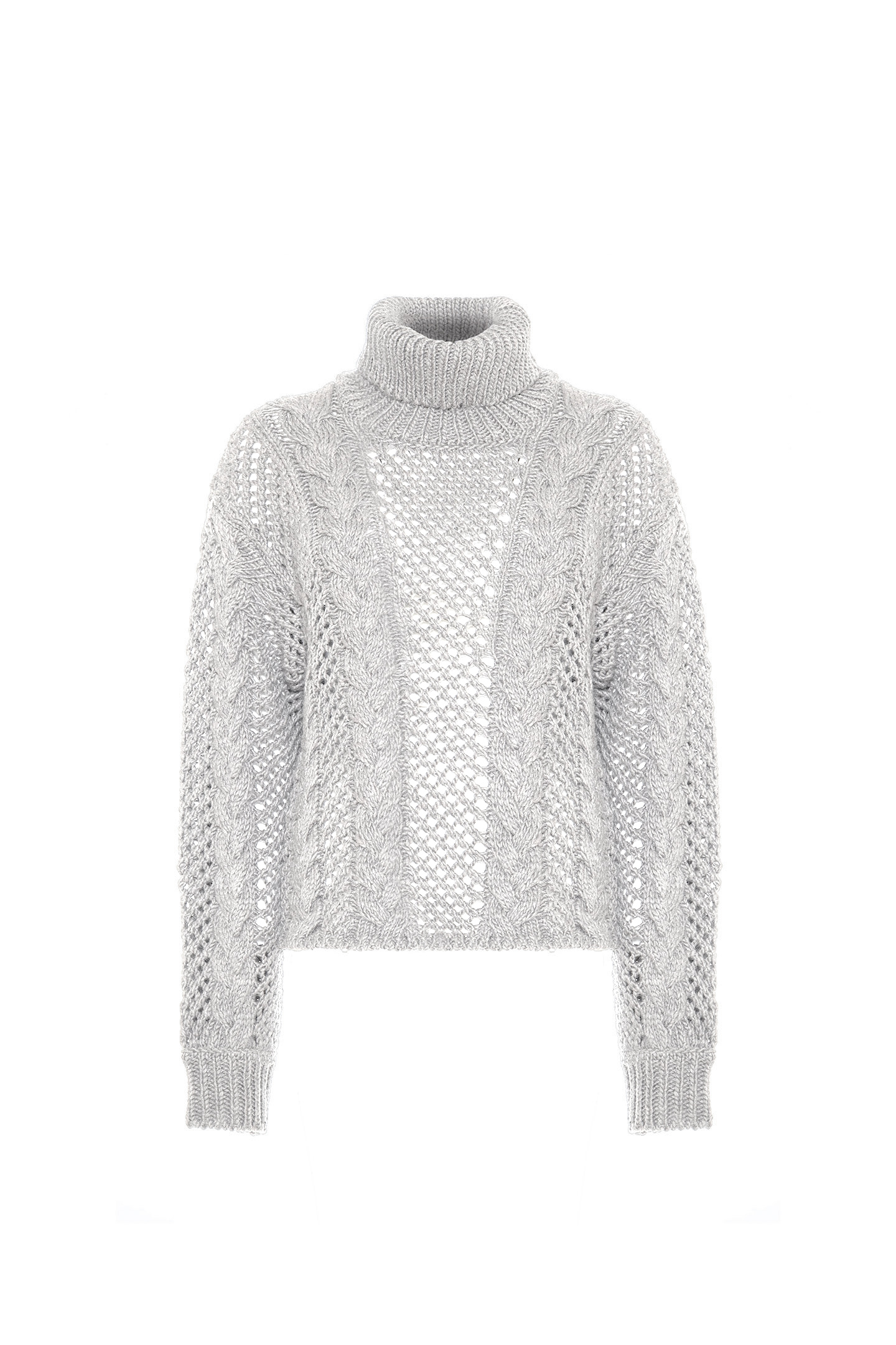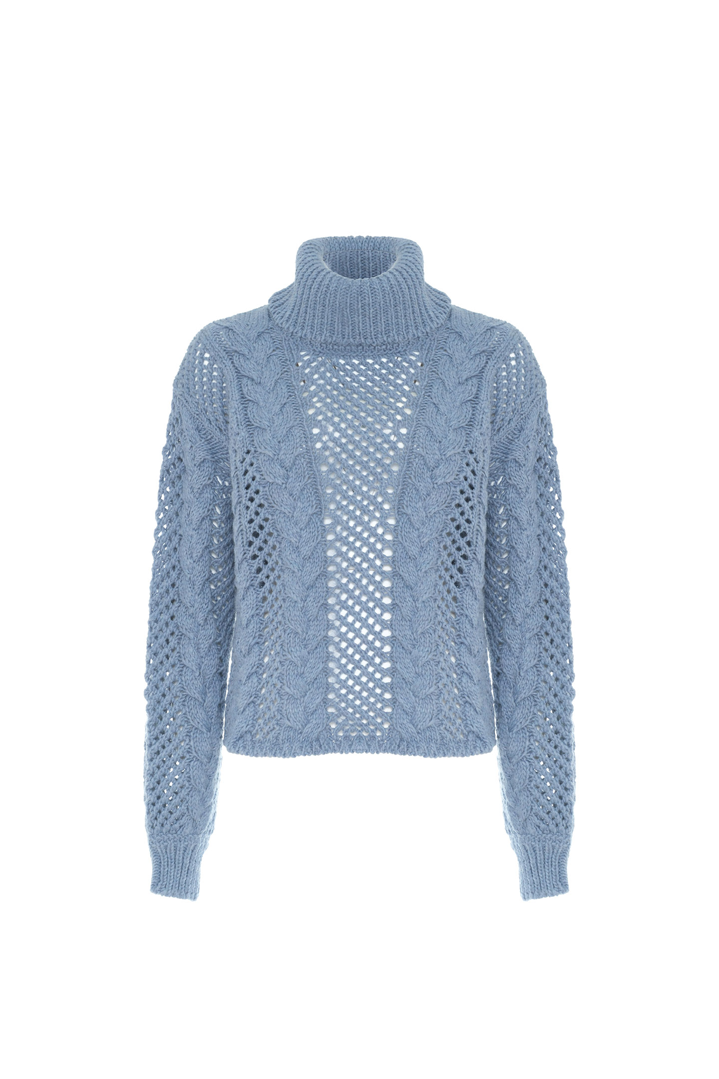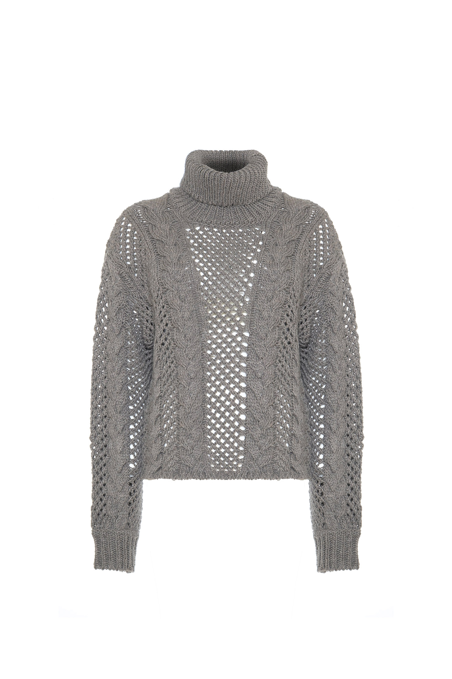 PULLOVER IN WOOL BLEND KNIT WITH HIGH COLLAR, CHARACTERIZED BY BRAIDED WORKMANSHIP AND OPEN STITCHES.