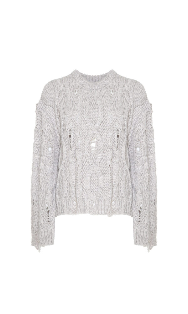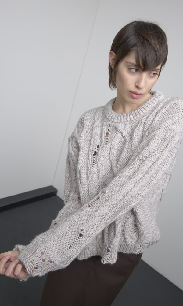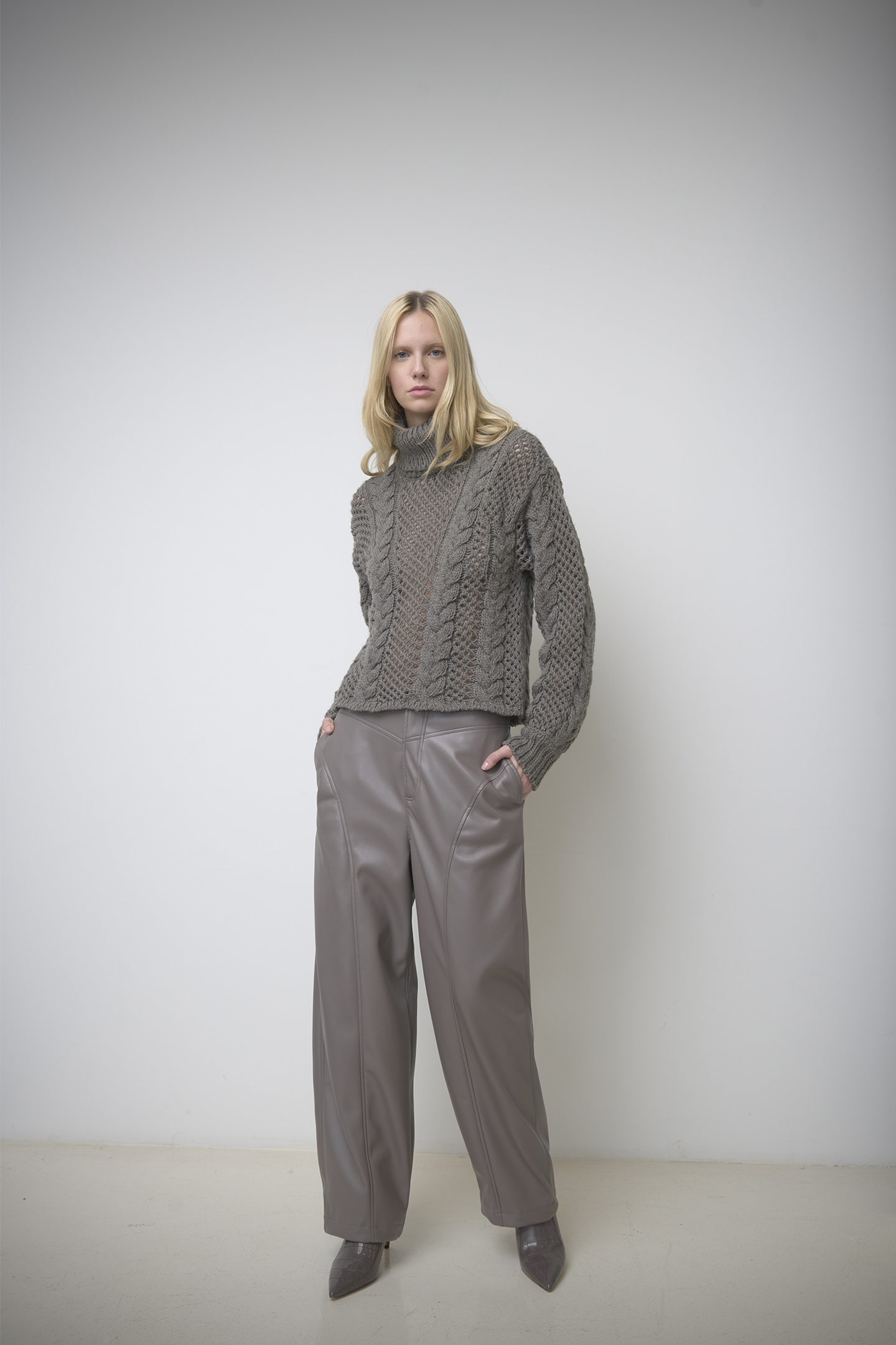 PULLOVER IN WOOL BLEND KNIT WITH HIGH COLLAR, CHARACTERIZED BY BRAIDED WORKMANSHIP AND OPEN STITCHES. THE MODEL FEATURES LONG SLEEVES AND RIBBED DETAILS ON THE NECK, CUFFS AND HEM FOR A COMFORTABLE AND DEFINED FIT. THE LINE IS SOFT AND ENVELOPING, IDEAL FOR RELAXED AND INFORMAL LOOKS.