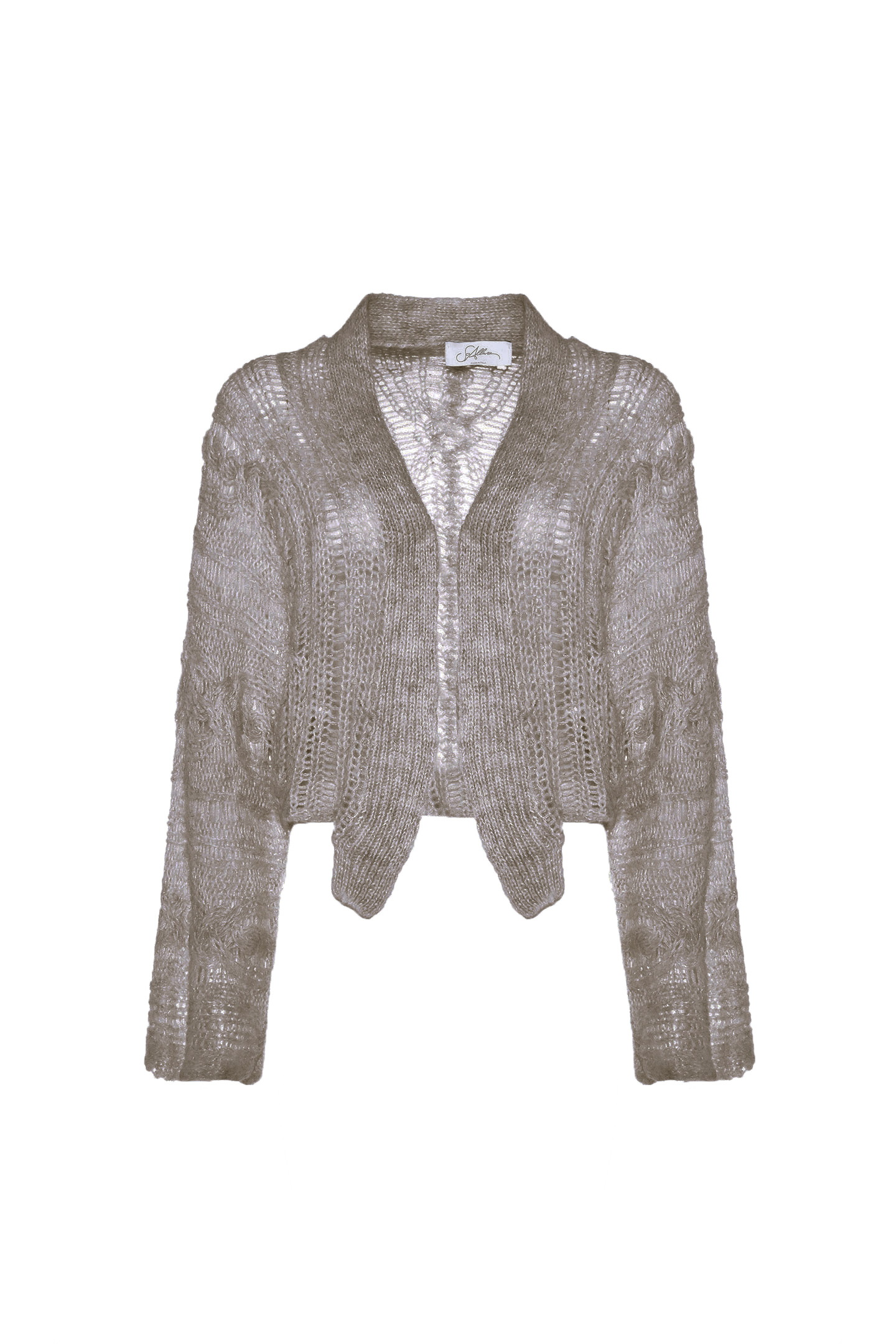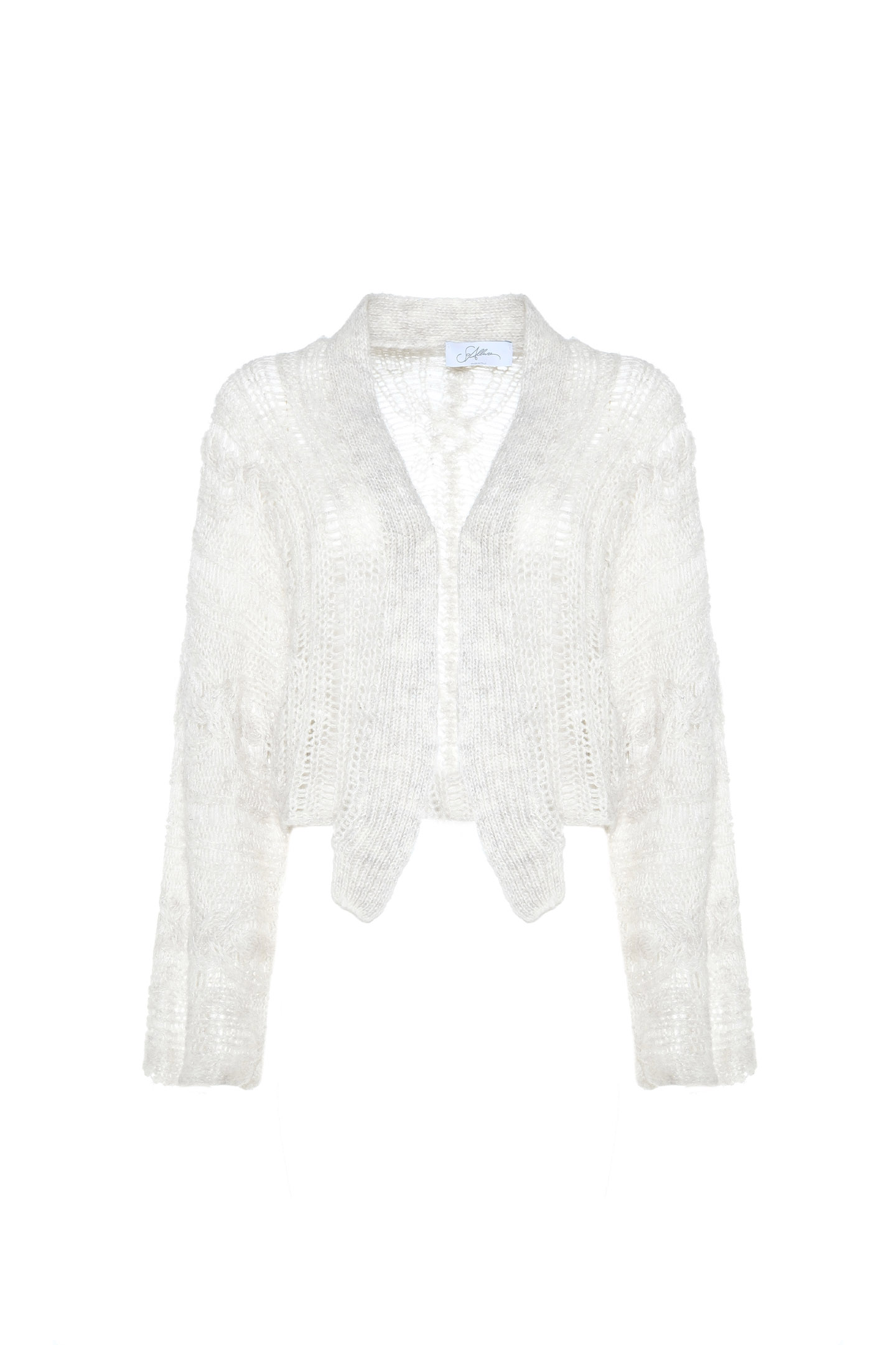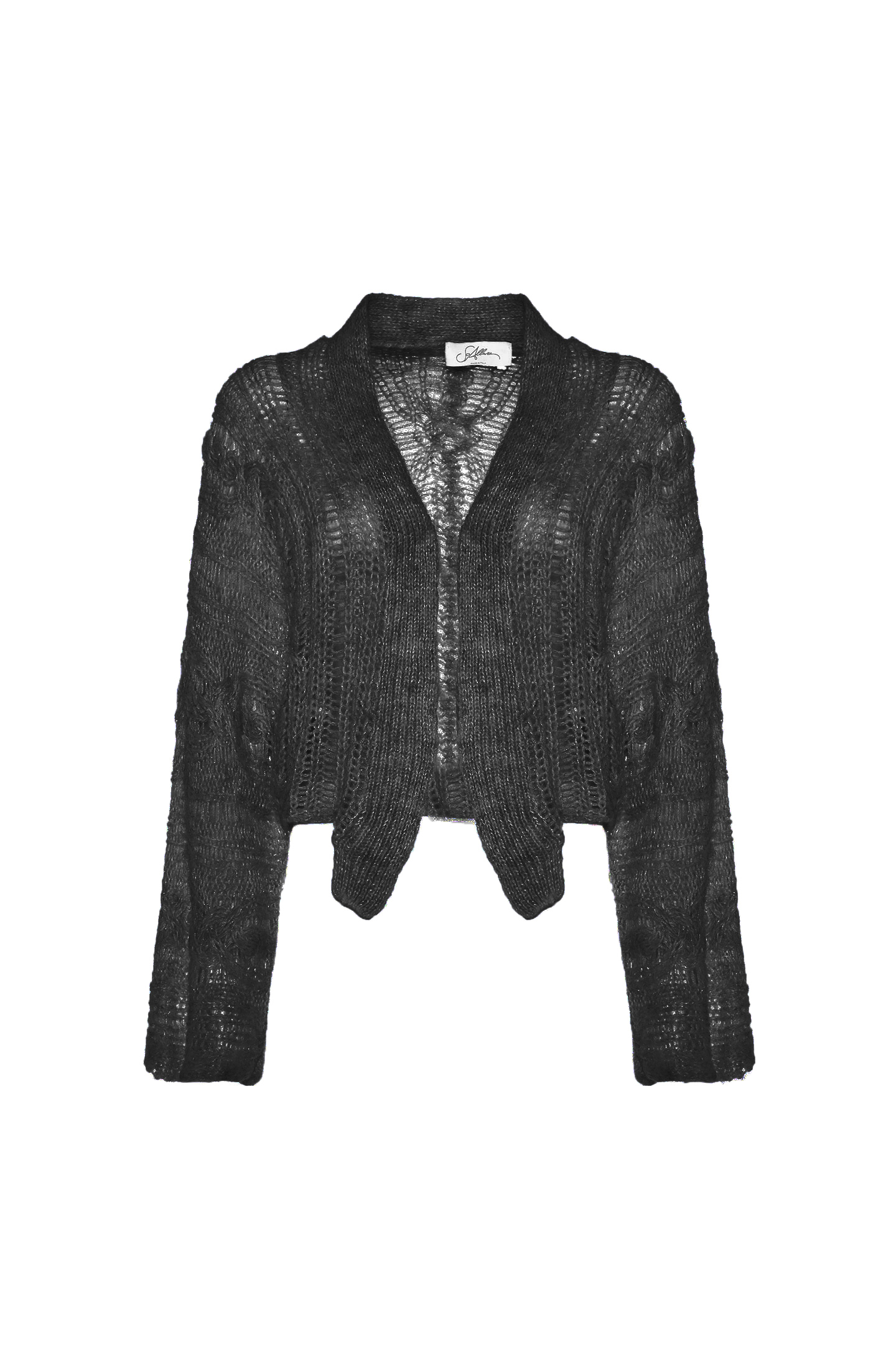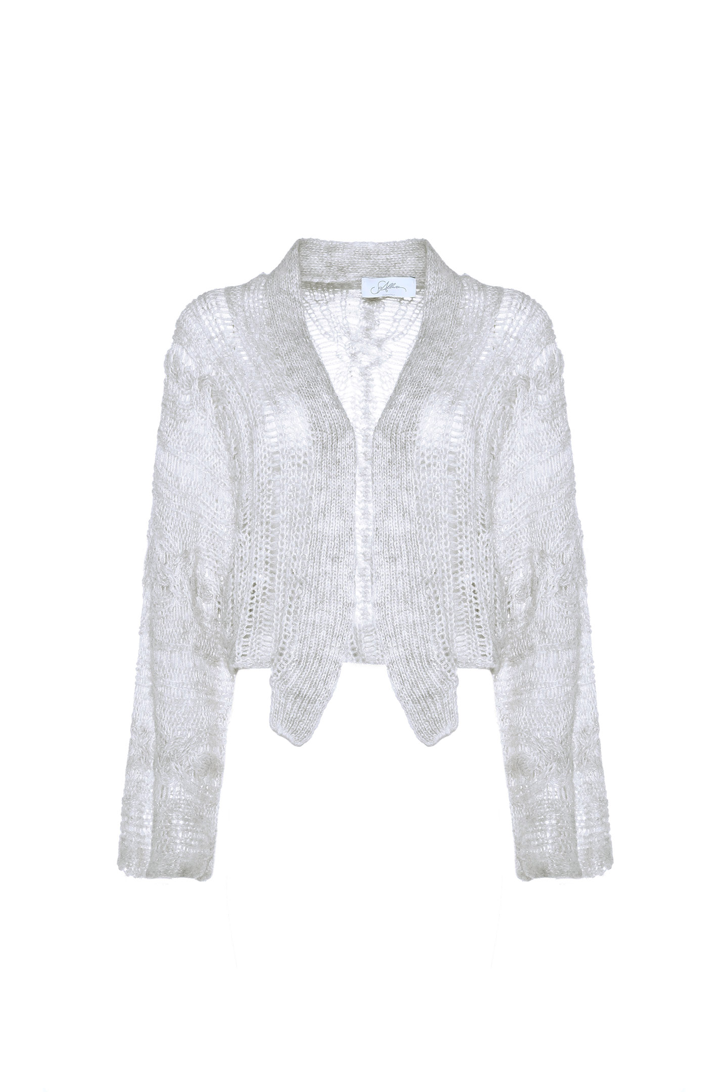 CROPPED CARDIGAN IN MIXED KNIT WITH BRAID AND MESH WORKMANSHIP.