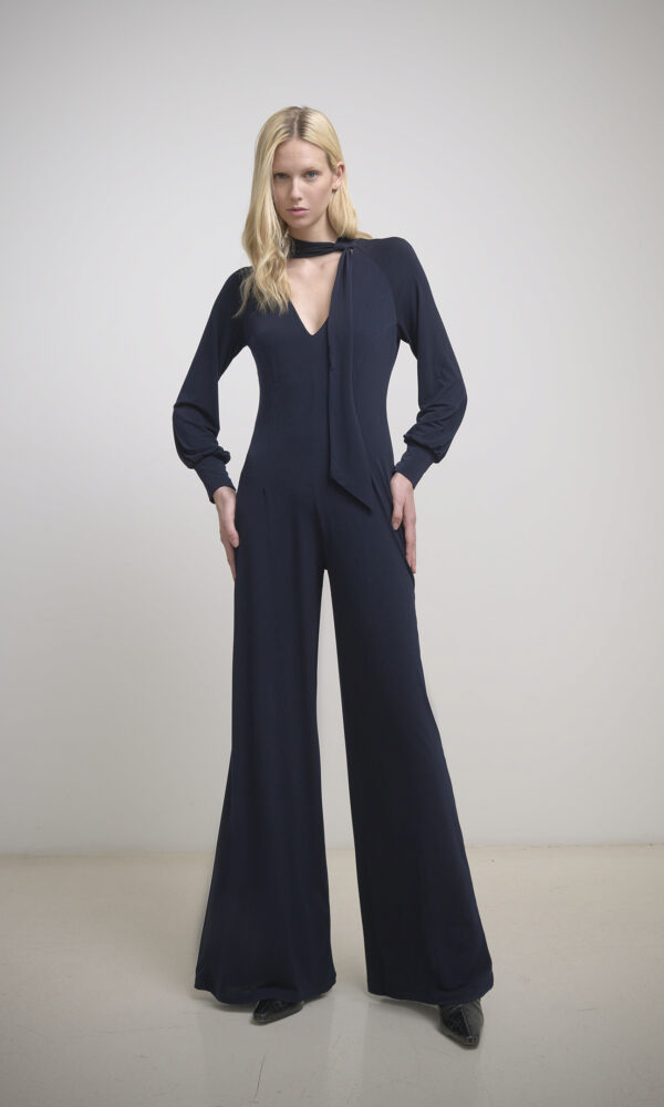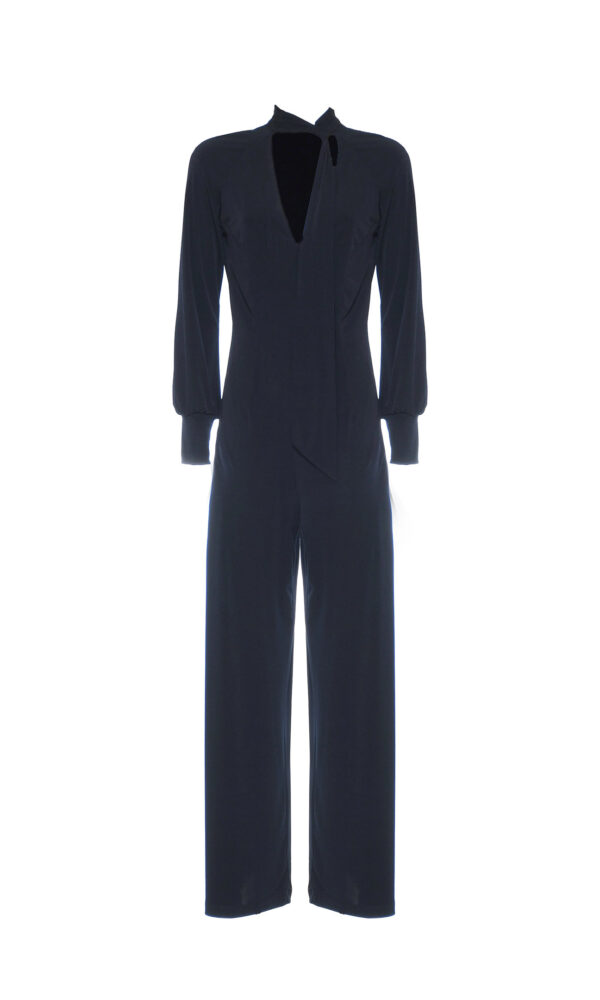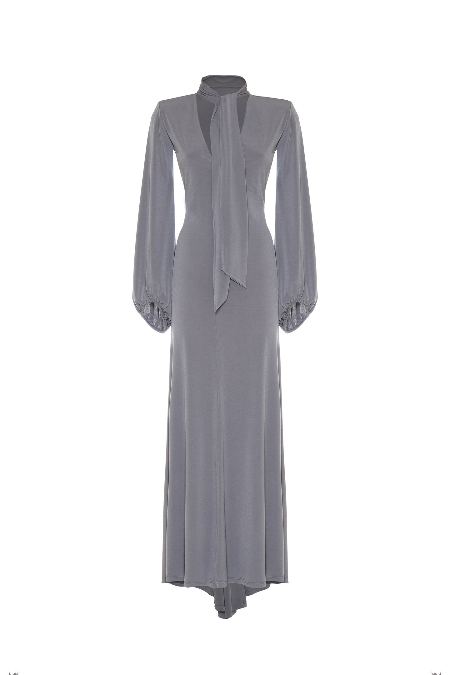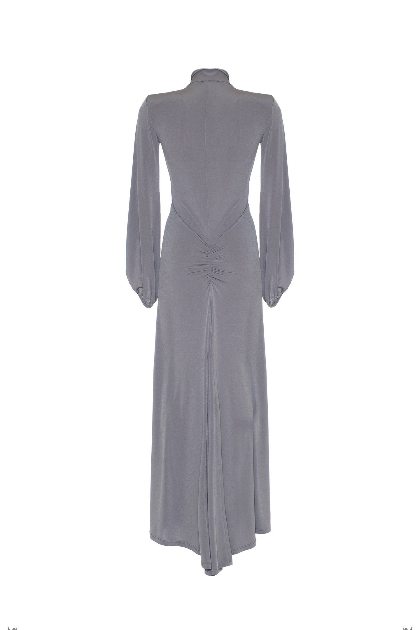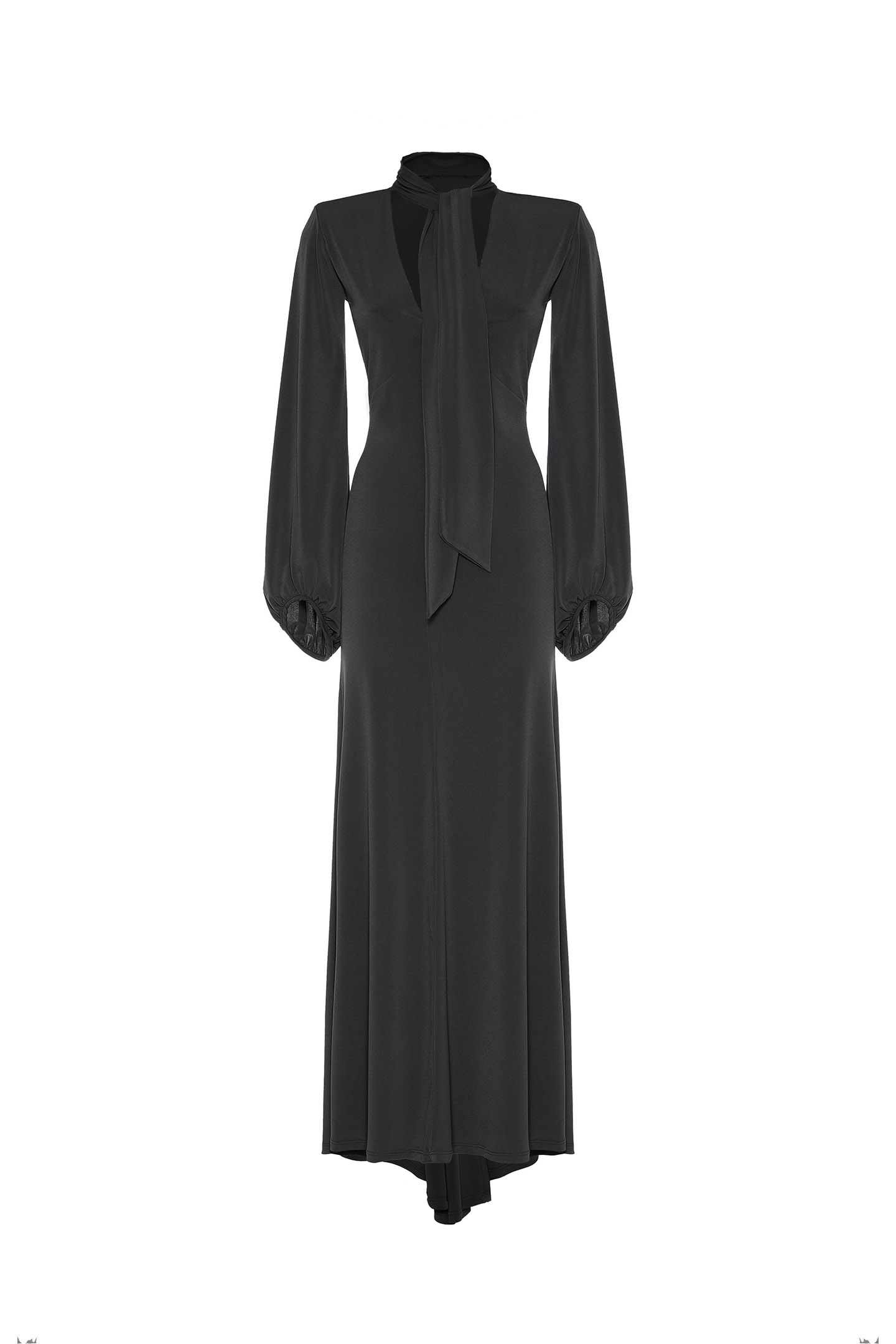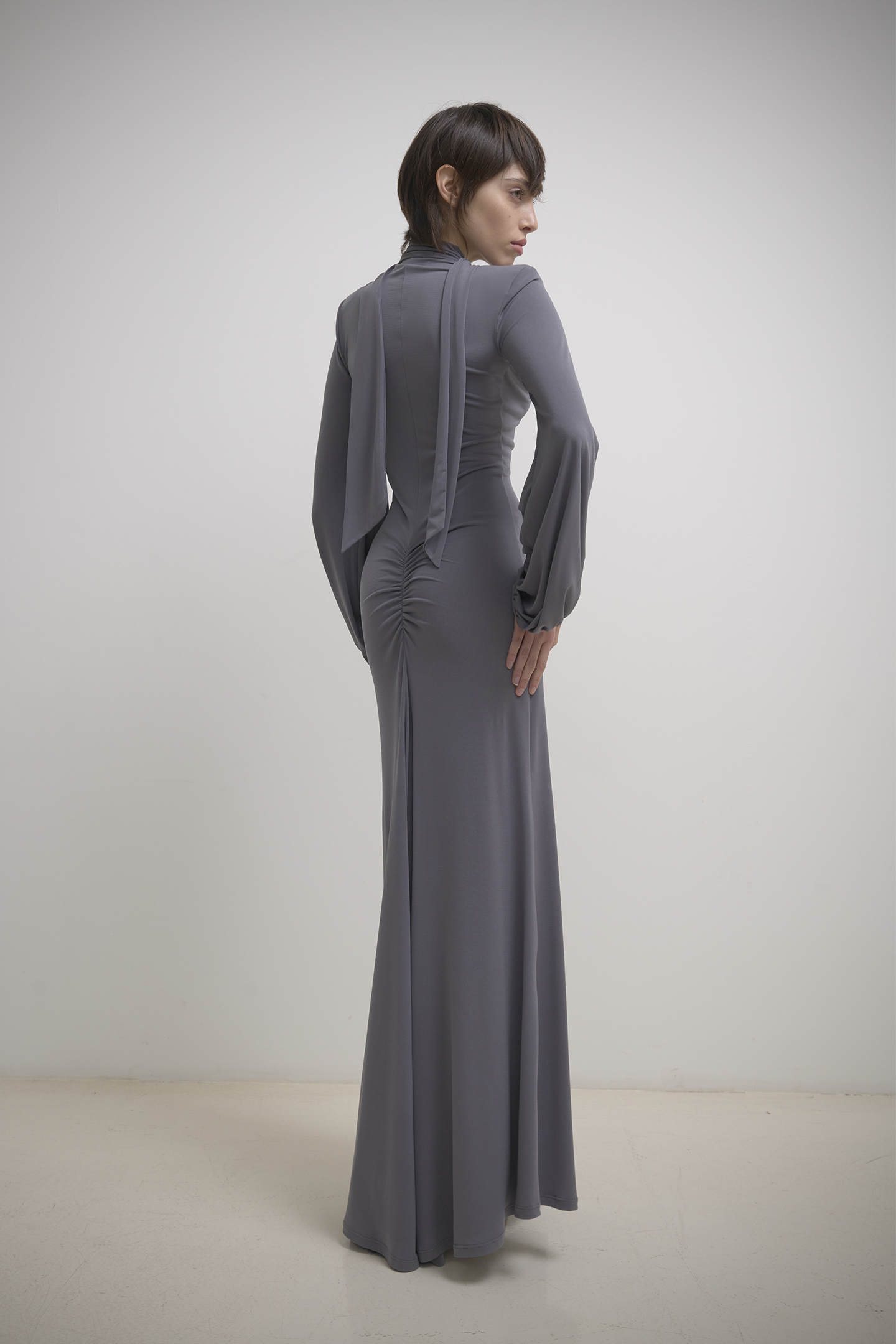 LONG JERSEY DRESS WITH A FITTED SILHOUETTE. FEATURING A DEEP V-NECK WITH A SCARF COLLAR AND LONG, SLIGHTLY PUFFED SLEEVES WITH ELASTIC CUFFS. THE ULTRA-FITTING CUT ENHANCES THE FEMININE SILHOUETTE, ENRICHED AT THE BACK BY A RUFFLED DETAIL THAT FLATTERS THE FIGURE. THE ASYMMETRICAL HEM, LONGER AT THE BACK, ADDS A MODERN AND ELEGANT TOUCH.