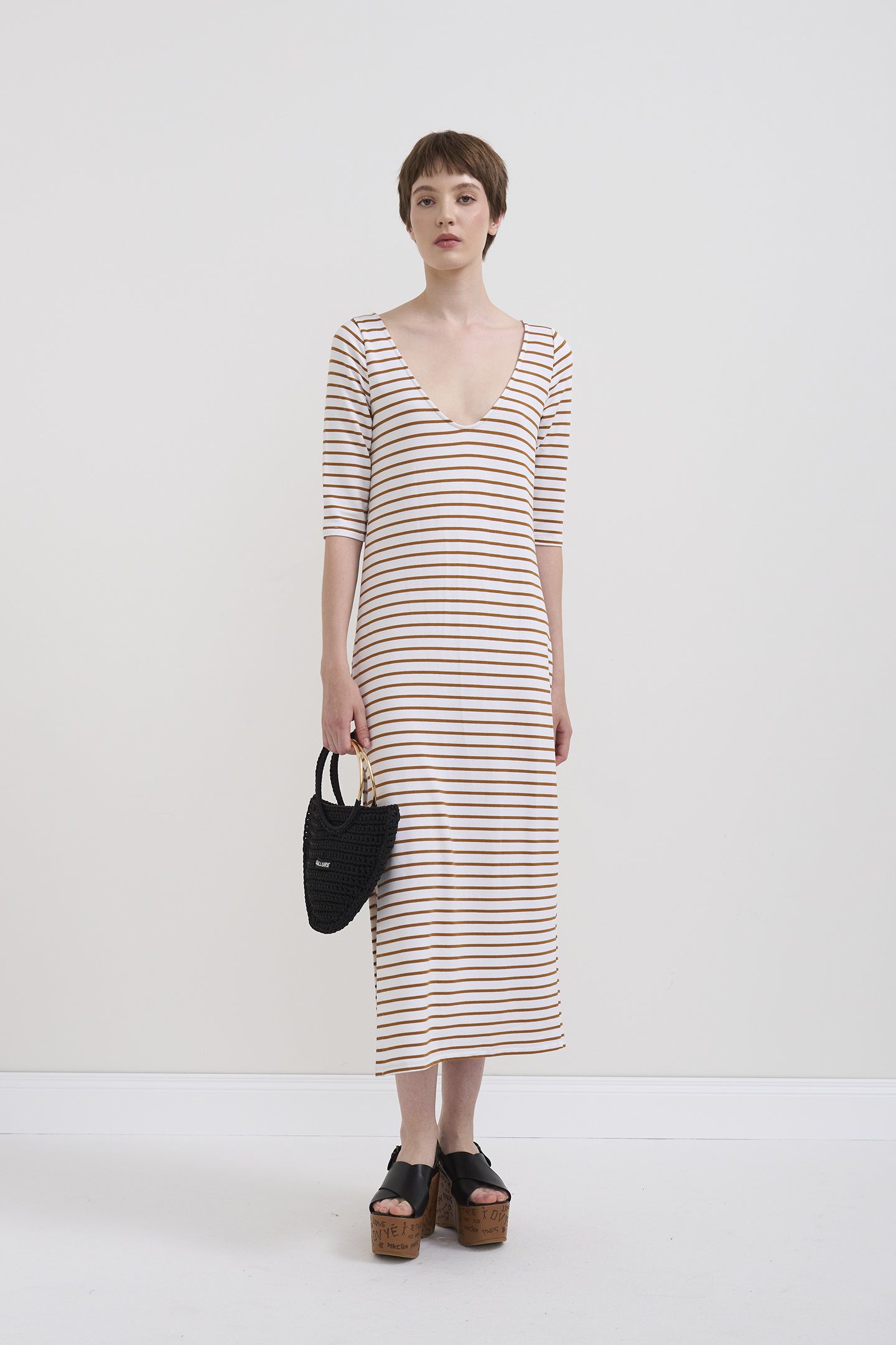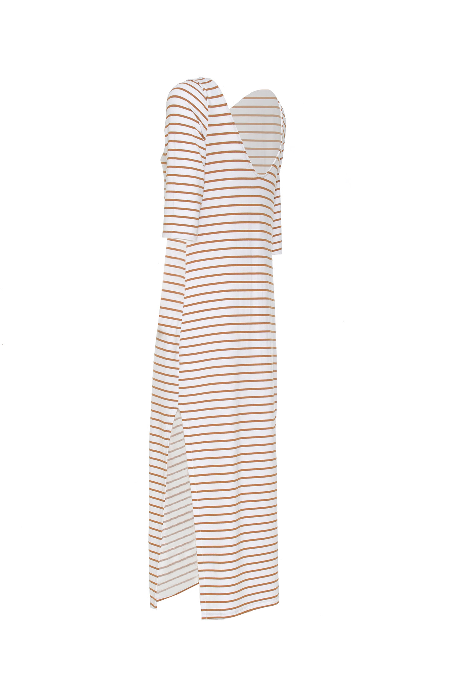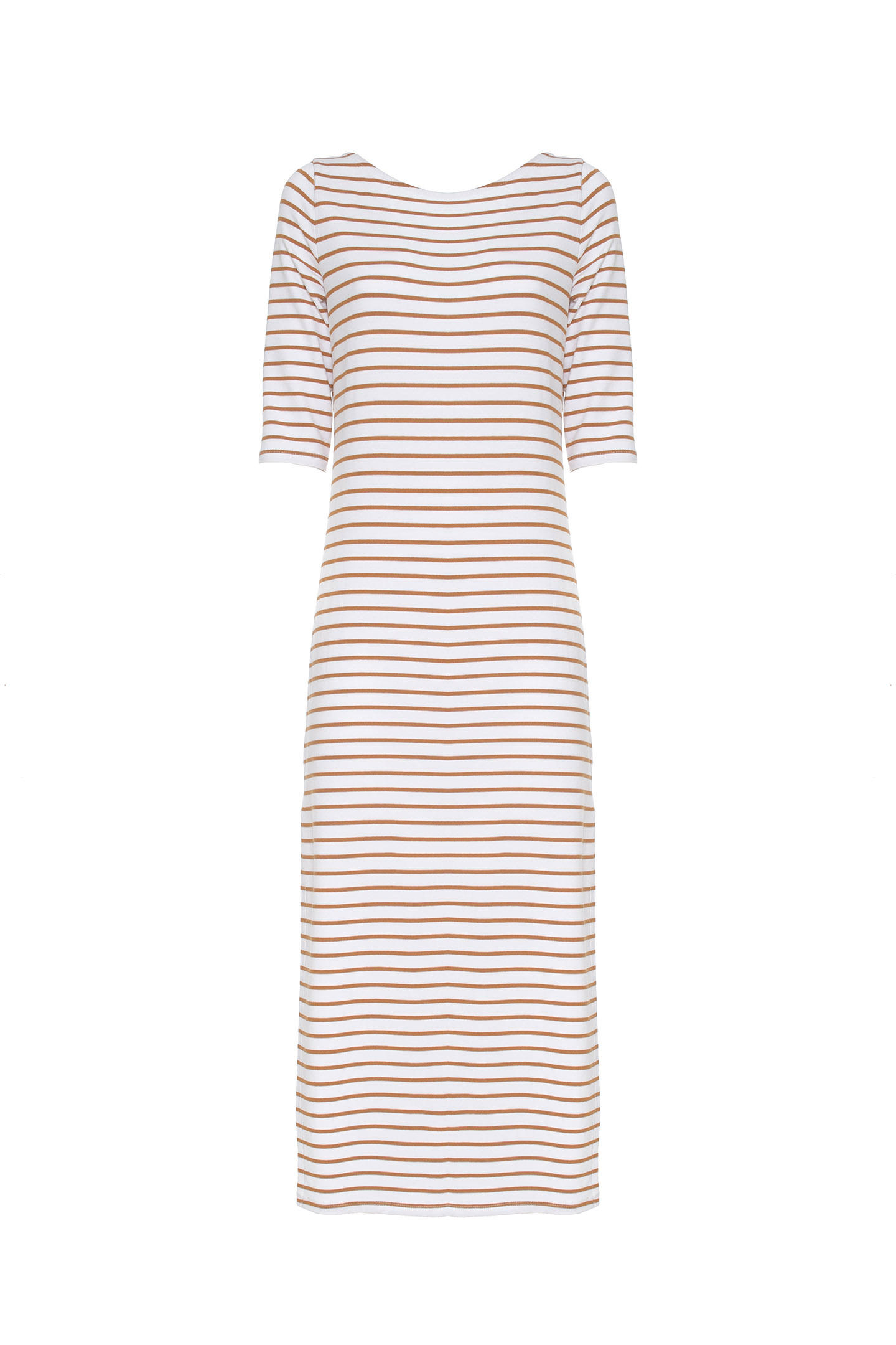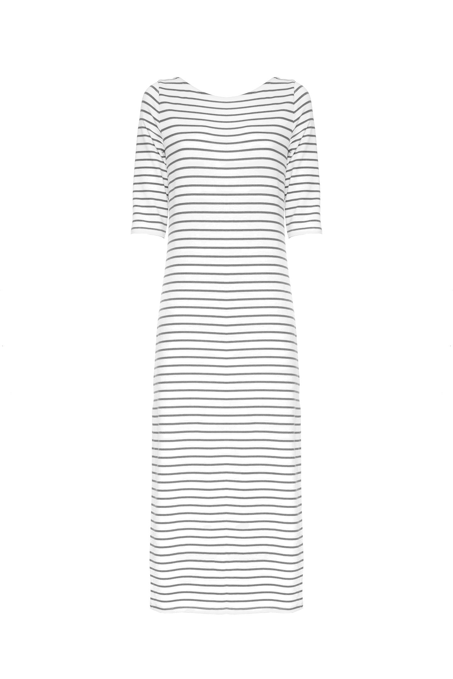 LONG DRESS WITH A STRAIGHT, WRAPAROUND CUT, MADE OF SOFT VISCOSE WITH A HORIZONTAL STRIPED PATTERN. THE DESIGN FEATURES A DEEP V-NECK ON BOTH SIDES, ELBOW SLEEVES AND A SNUG FIT. THE ESSENTIAL STYLE IS IDEAL FOR CASUAL, URBAN OR TRAVEL LOOKS. THE MODEL IS 1.78 M TALL AND WEARS A SIZE 42 IT.