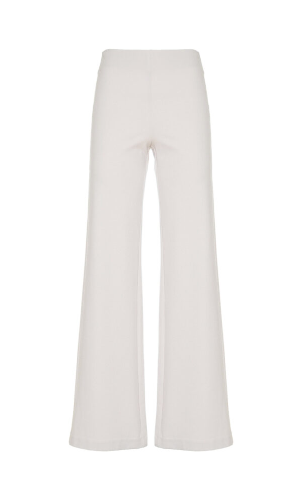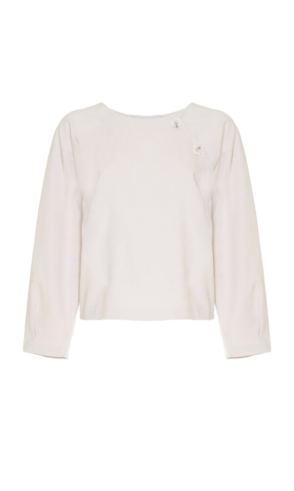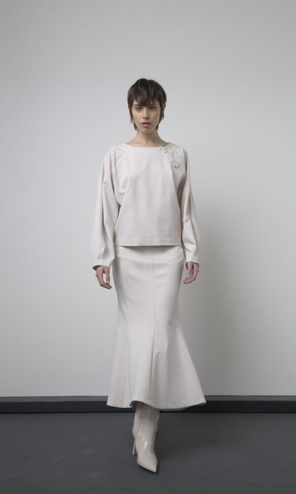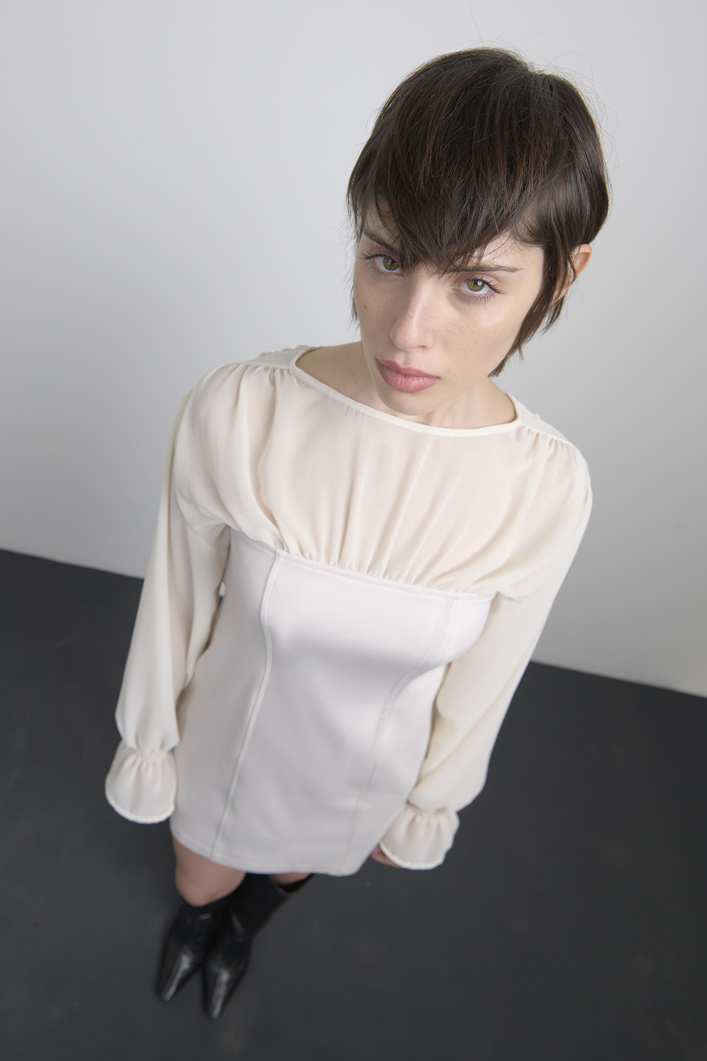 THE MODEL IS COMPLETED BY A COMBINED GEORGETTE BLOUSE, WITH A ROUND NECKLINE AND WIDE SLEEVES WITH ELASTIC CUFFS.
