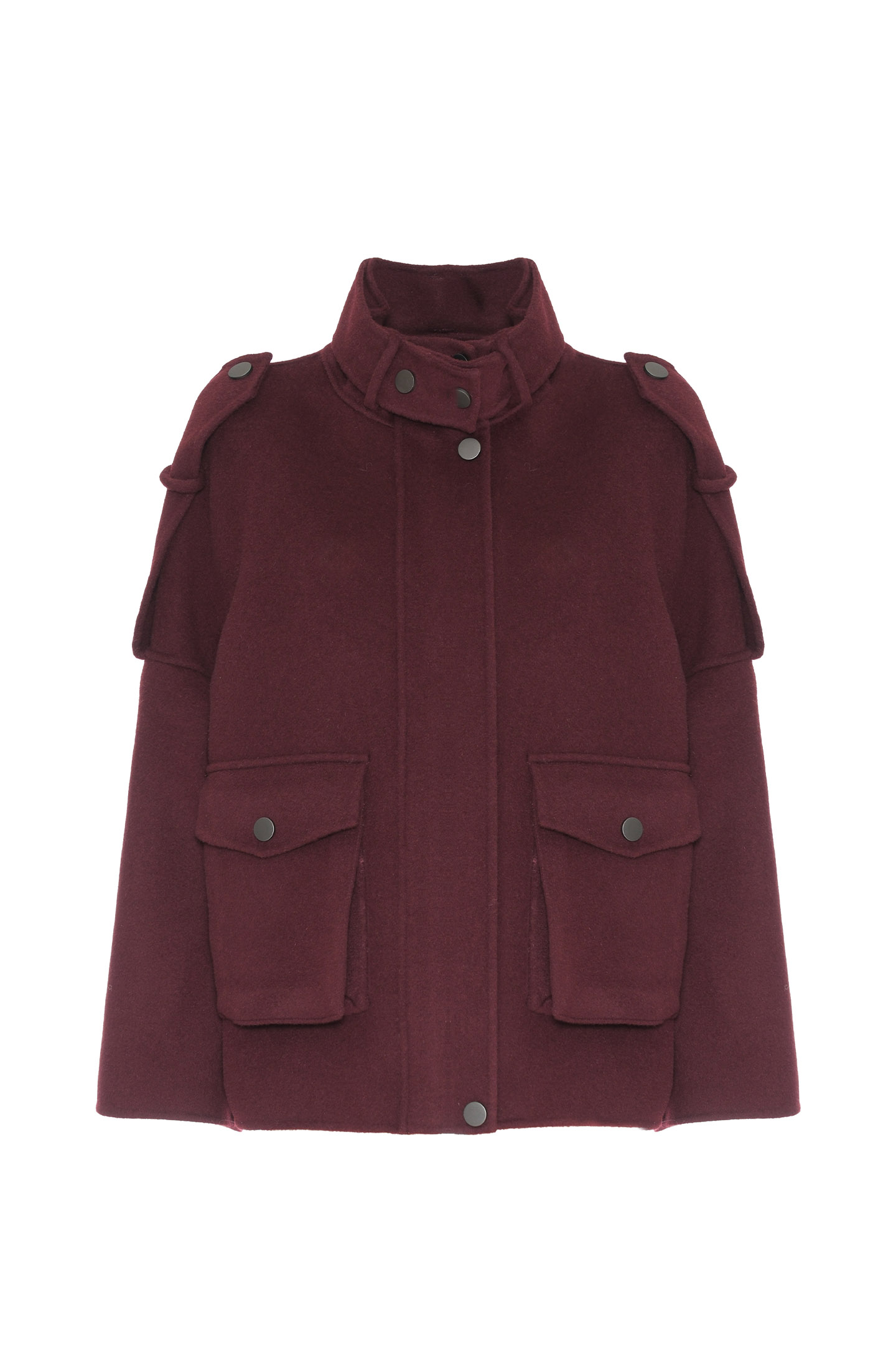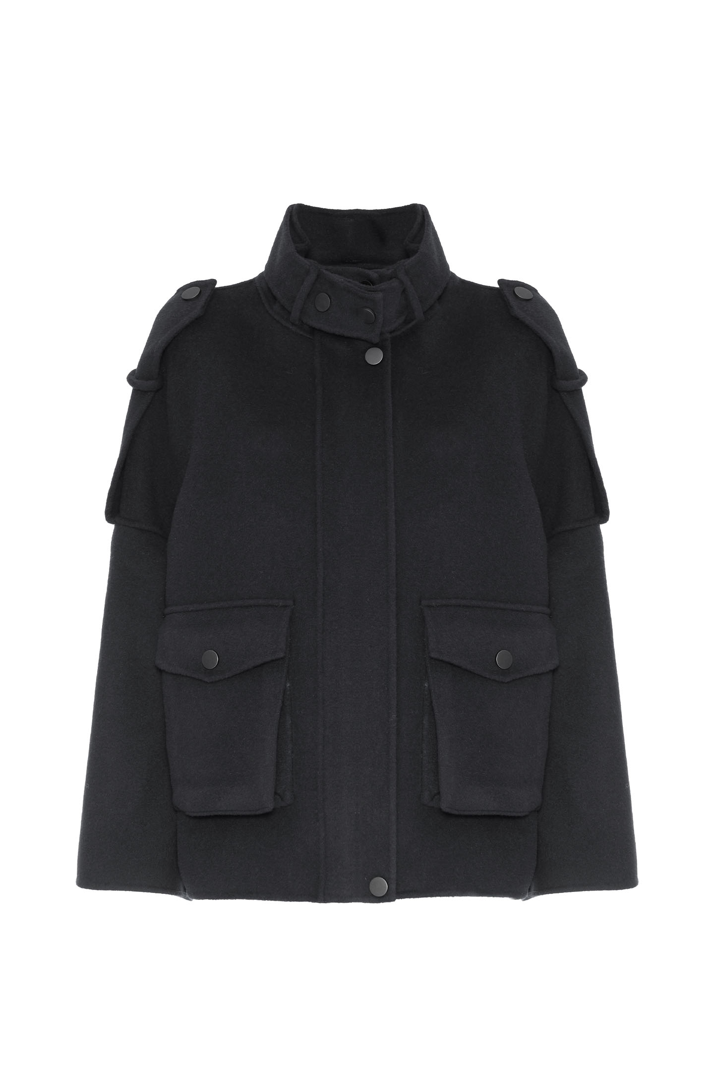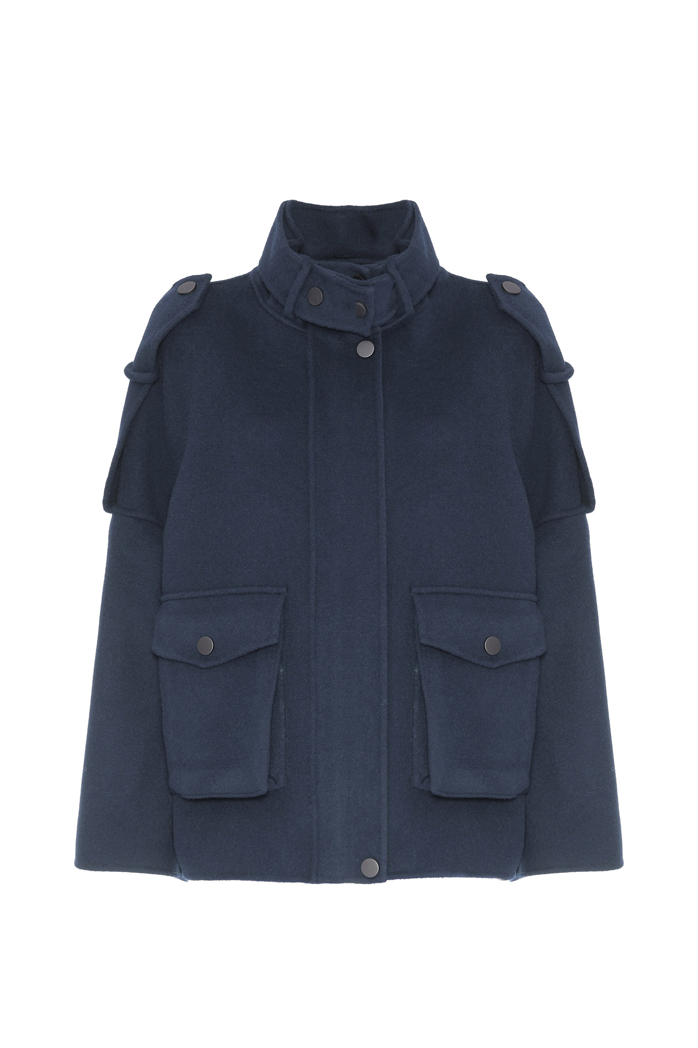 DOUBLE WOOL CLOTH CABAN WITH FROG STRAPS ON THE SHOULDERS AND STAND-UP COLLAR. FRONT CLOSURE WITH HIDDEN ZIP AND SNAP BUTTONS. STRAIGHT LINE WITH SLOPED SHOULDERS FOR A RELAXED FIT. FINISHED WITH LARGE PATCH POCKETS WITH FLAPS, FOR A UTILITY LOOK. A VERSATILE AND STRUCTURED GARMENT, PERFECT FOR THE COLD SEASON.
