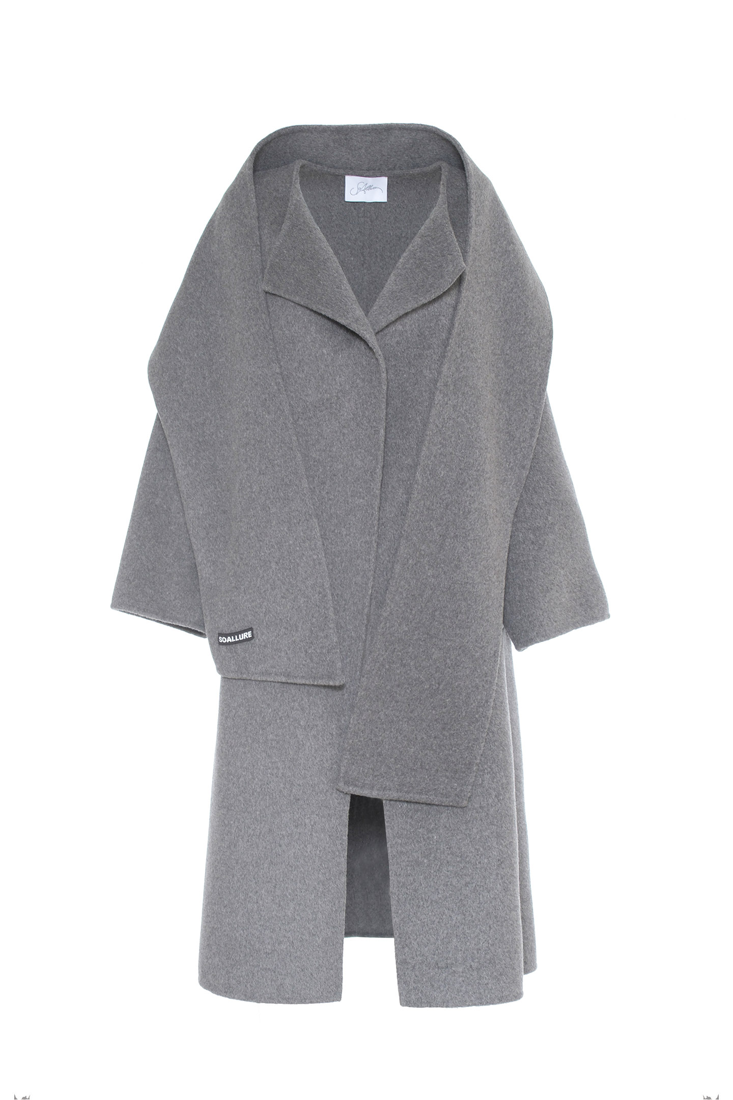 PURE WOOL DRAP COAT WITH A MATCHING REMOVABLE SCARF FOR EXTRA VERSATILITY. THE DESIGN IS COMPLETED BY A WIDE SHALF LAPEL, LONG SLEEVES WITH DROP SHOULDERS AND SLANTED POCKETS INSERTED INTO THE SIDES. THE GARMENT IS UNLINED, IDEAL FOR MID-SEASON WEAR OR FOR SOPHISTICATED LAYERING.
