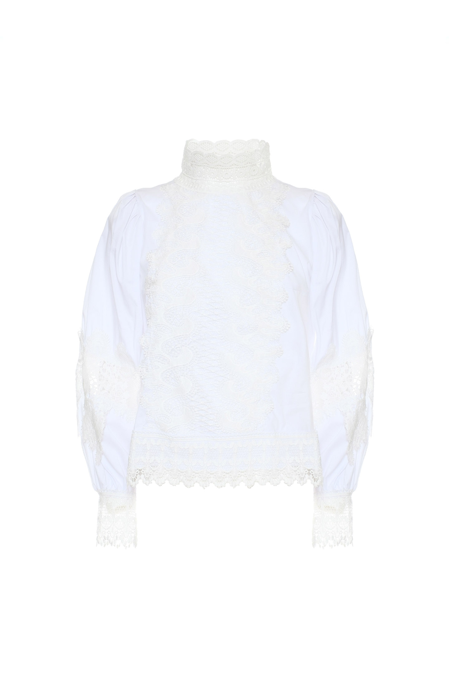 POPLIN BLOUSE WITH LACE INLAYS. IT FEATURES A HIGH NECK WITH SCALLOP AND A TEARDROP CLOSURE WITH BUTTONS ON THE BACK. REGULAR FIT MODEL, COMPLETED WITH LONG PUFF SLEEVES WITH CUFFS AND REFINED LACE DETAILS. A GARMENT WITH A ROMANTIC AND SOPHISTICATED TASTE, PERFECT TO COMBINE WITH TAILORED TROUSERS WITH A MASCULINE CUT TO CREATE A CONTRASTING LOOK.