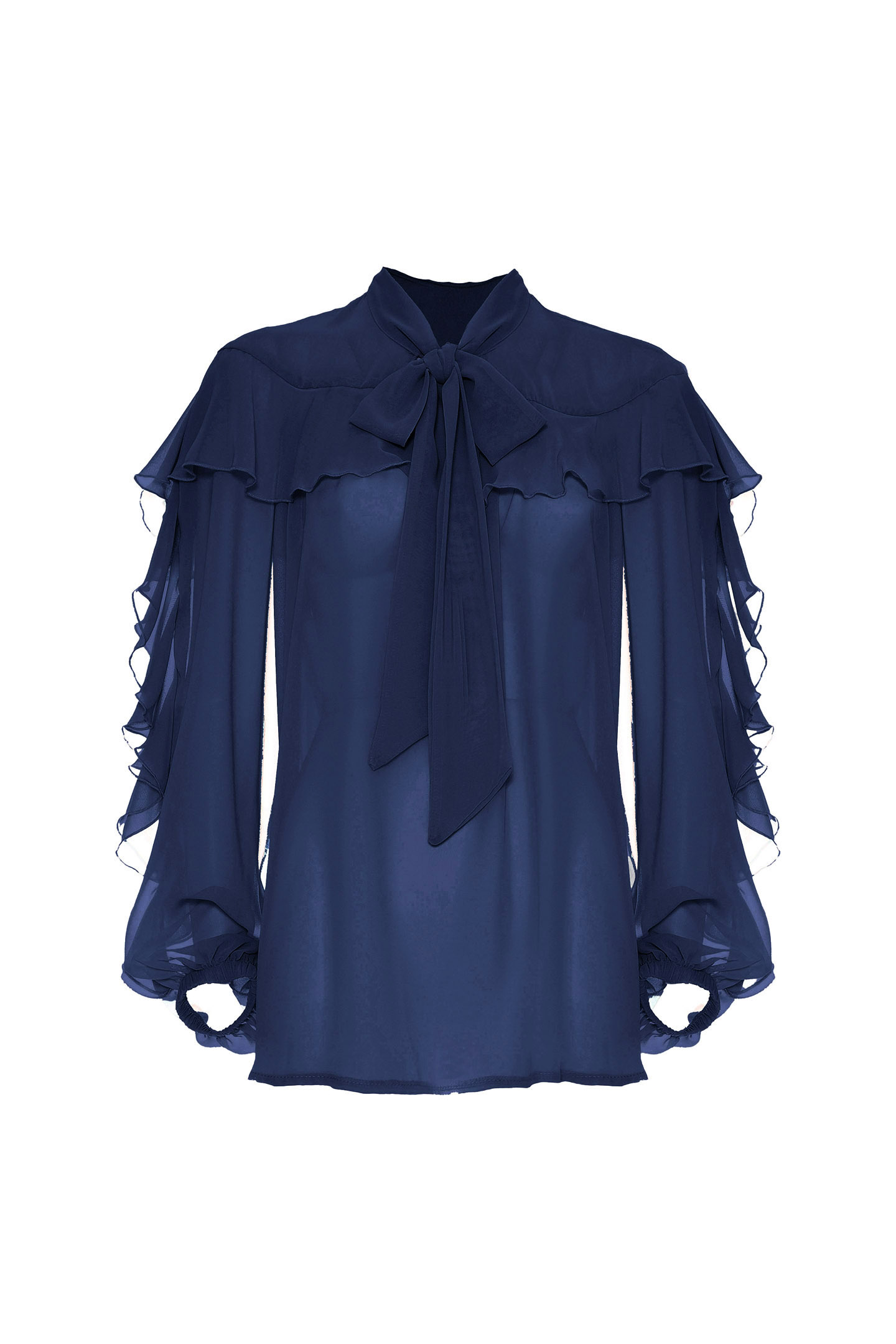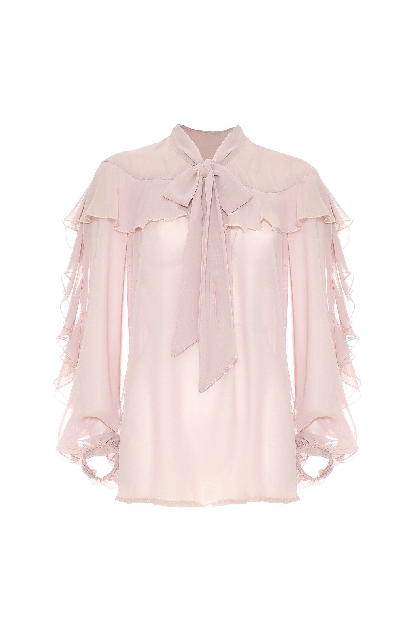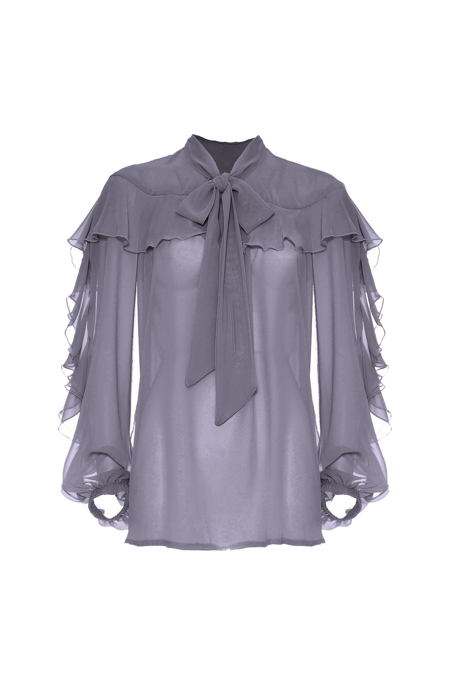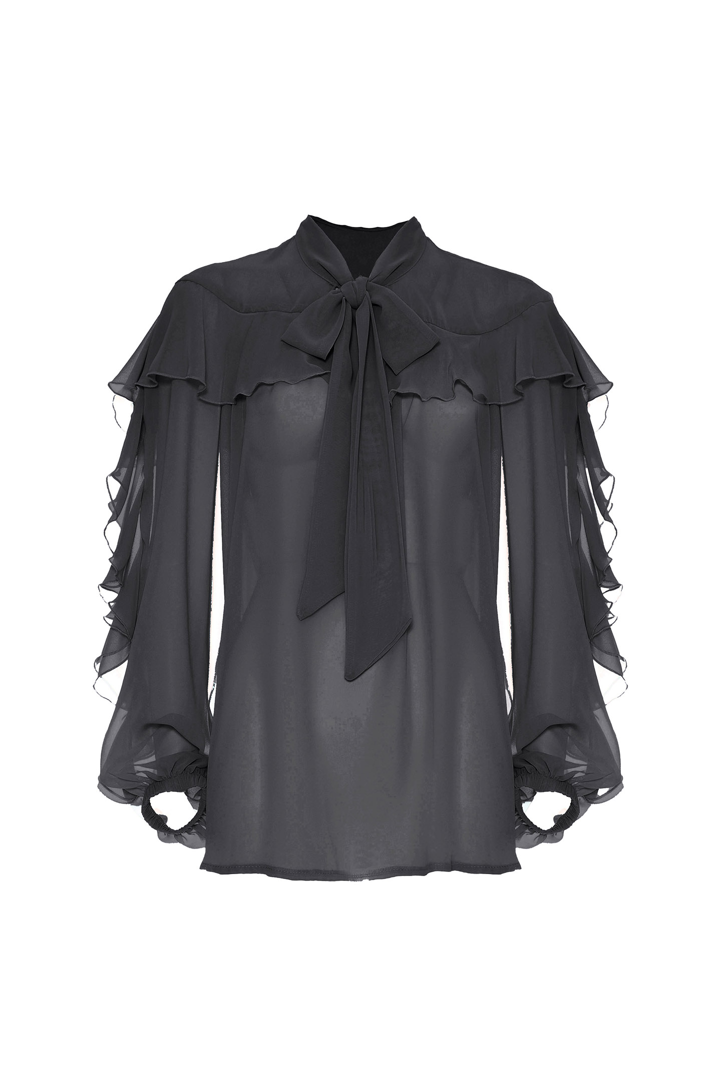 SEMI-TRANSPARENT CHIFFON BLOUSE WITH SEE-THROUGH EFFECT. TIMELESS DESIGN AND FLUID TEXTURE IDEAL FOR FEMININE AND SOPHISTICATED LOOKS. CHARACTERIZED BY A STRAIGHT CUT ENRICHED BY RUFFLES THAT CREATE AN ELEGANT PLAY OF LEAPS ON THE FRONT AND ALONG THE SLEEVES. BALLOON SLEEVES WITH STRETCH WRISTS ADD VOLUME AND MOVEMENT. V-NECK WITH SCARF NECK TO KNOT ACCORDING TO YOUR STYLE, FOR AN EXTRA TOUCH OF PERSONALITY.